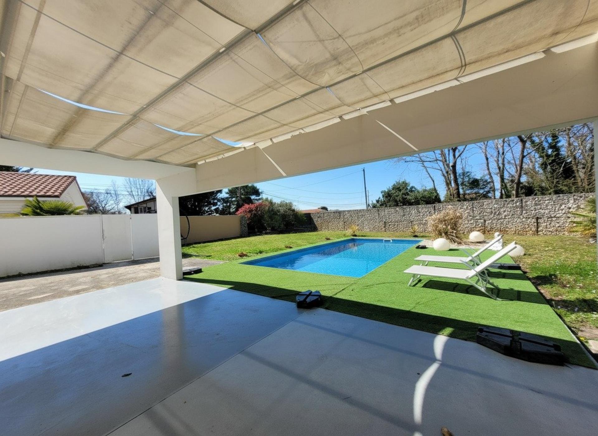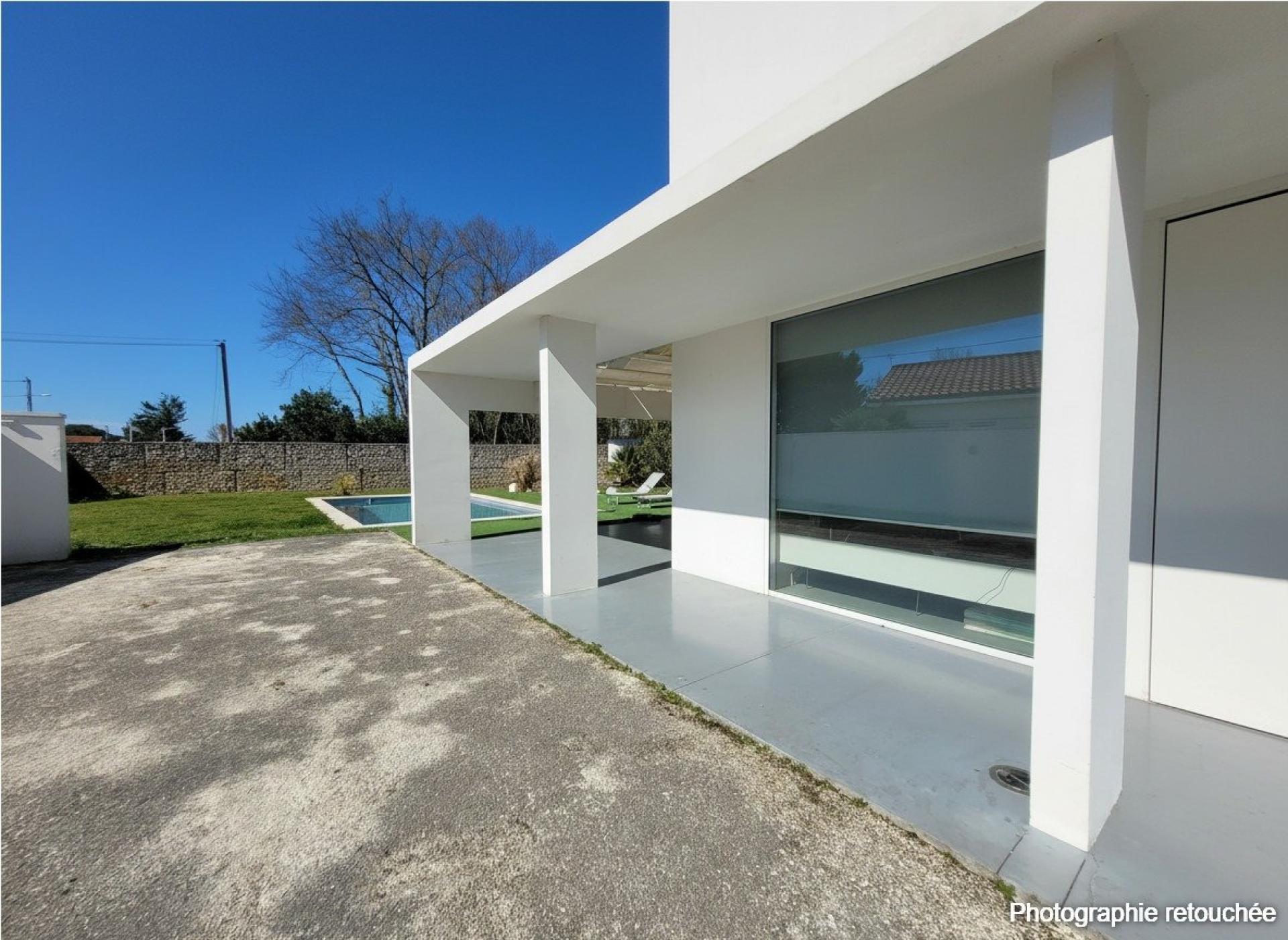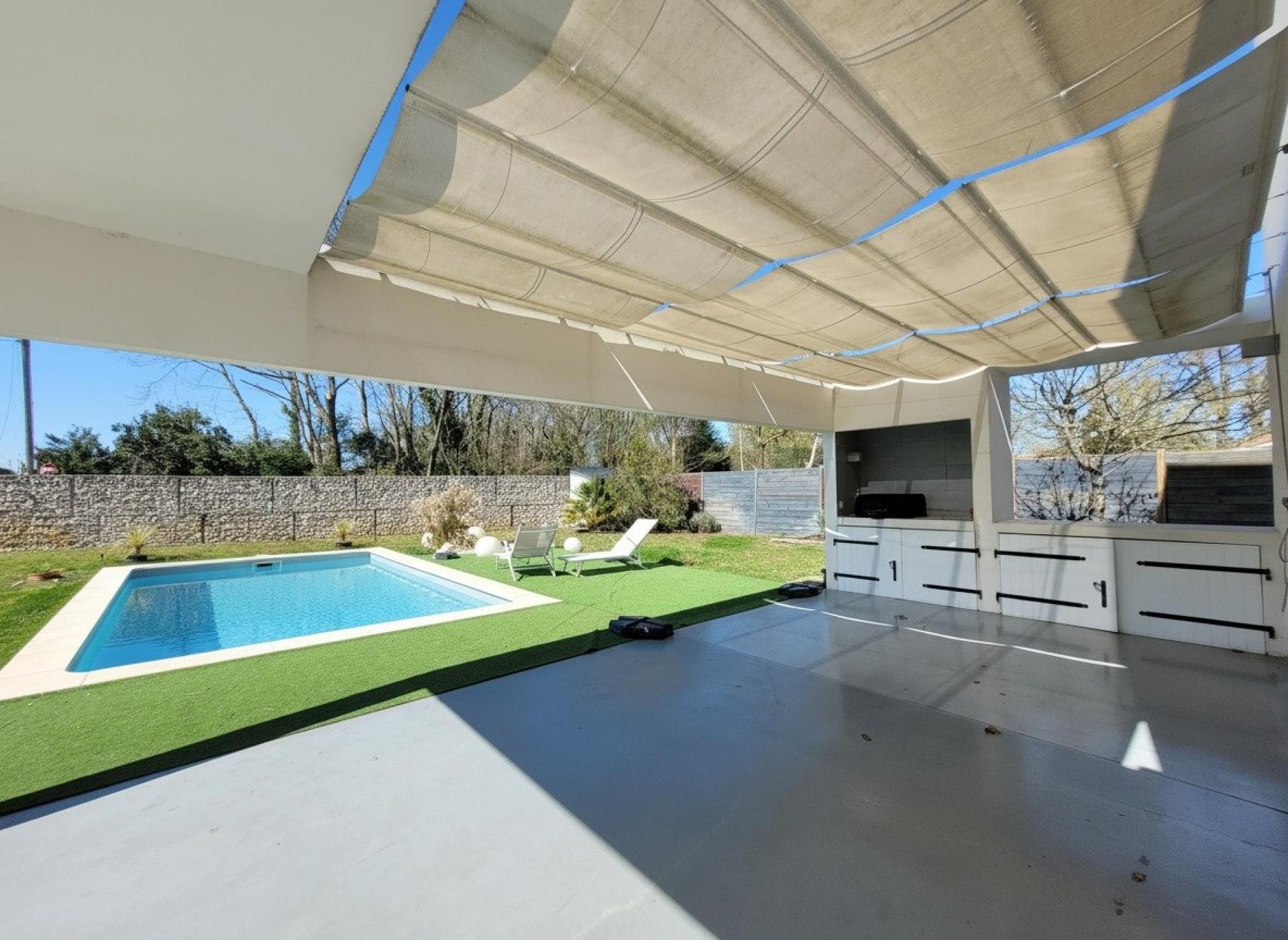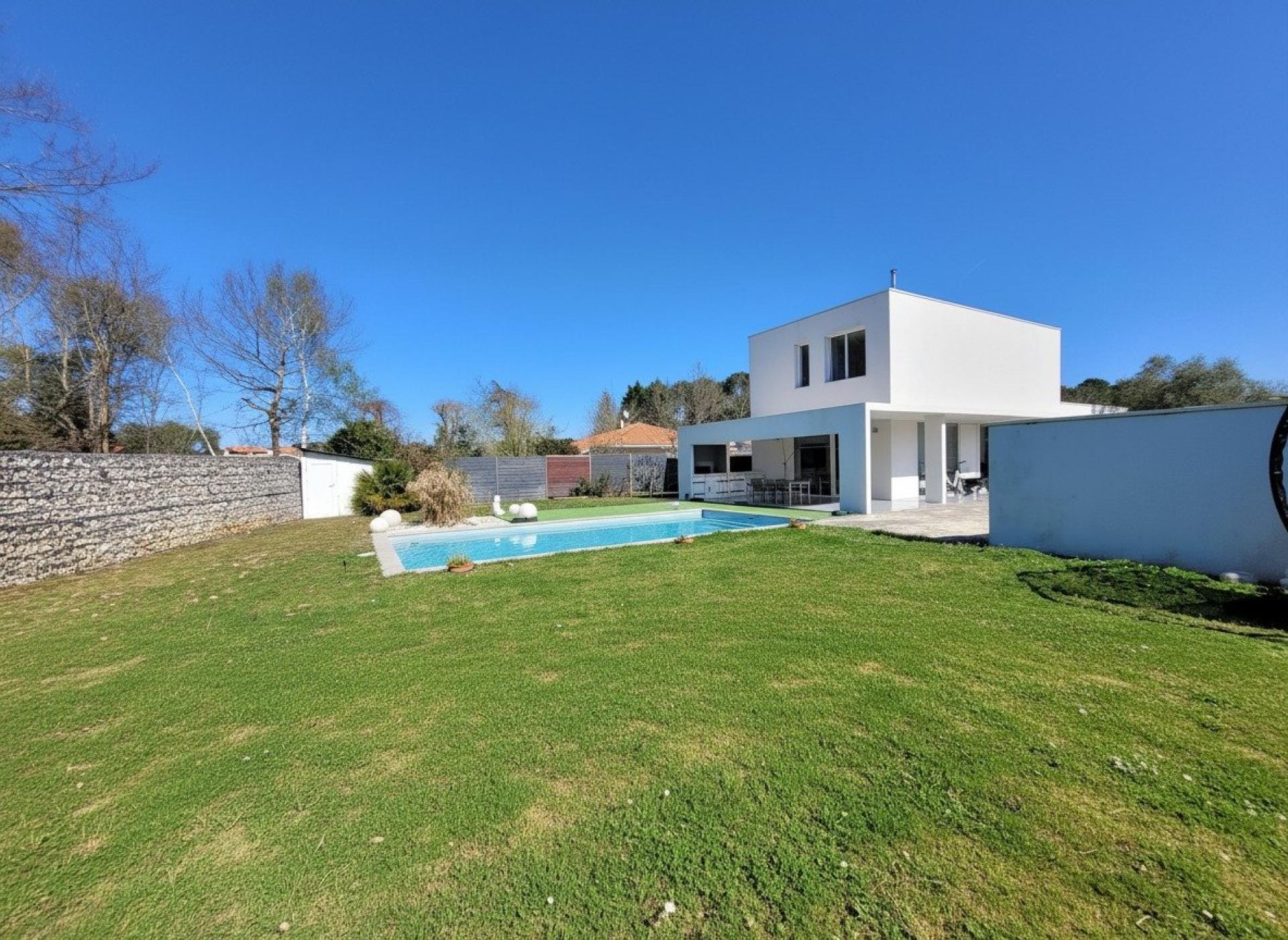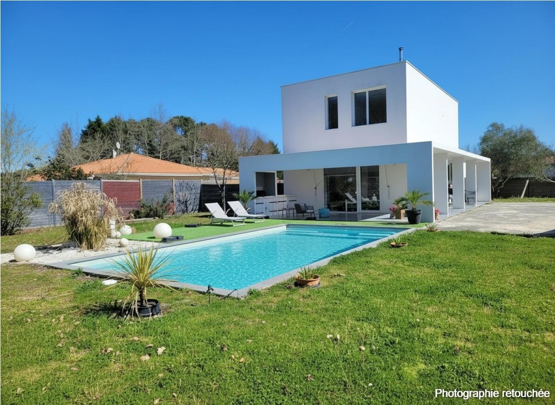 Maison contemporaine d’exception – Biscarrosse Bourg Située au cœur de Biscarrosse, dans un environnement calme et privilégié, cette élégante maison contemporaine séduit par son architecture épurée et ses prestations de qualité. Édifiée sur une parcelle paysagée de 932 m², entièrement clôturée et sans vis-à-vis, cette propriété offre un cadre de vie intimiste et lumineux. Les extérieurs ont été pensés pour le confort et la convivialité : une piscine sécurisée (8 x 4 m), une vaste terrasse, une pergola ainsi qu’une cuisine d’été parfaitement équipée composent un véritable espace de vie à ciel ouvert. D’une surface habitable d’environ 140 m², la maison s’organise sur deux niveaux : Au rez-de-chaussée : Un superbe et spacieux espace de vie baigné de lumière grâce à de larges baies vitrées, comprenant salon, salle à manger et cuisine ouverte. une suite parentale avec dressing et salle d'eau offrent un confort de plain-pied particulièrement recherché. Une buanderie fonctionnelle complète ce niveau. Une pièce annexe de 20m2 avec belle hauteur sous plafond permet d’envisager un atelier, un espace de stockage ou un local pour vélos. À l’étage : Trois chambres, dont deux aux volumes généreux, une salle de bain avec baignoire et une agréable mezzanine à l'usage d'un bureau, d'une salle de jeu ou d'un espace détente selon ses attentes. Cette villa, se distingue par sa luminosité exceptionnelle, ses lignes contemporaines et son atmosphère épurée, où le blanc domine avec élégance, à l’intérieur comme à l’extérieur. Idéalement située, elle permet un quotidien tout à pied : commerces, écoles, crèches et services médicaux sont à proximité immédiate. Les pistes cyclables sont accessibles en quelques minutes, et Bordeaux se rejoint en 1h15. Un bien rare sur le secteur, alliant modernité, confort et qualité de vie.