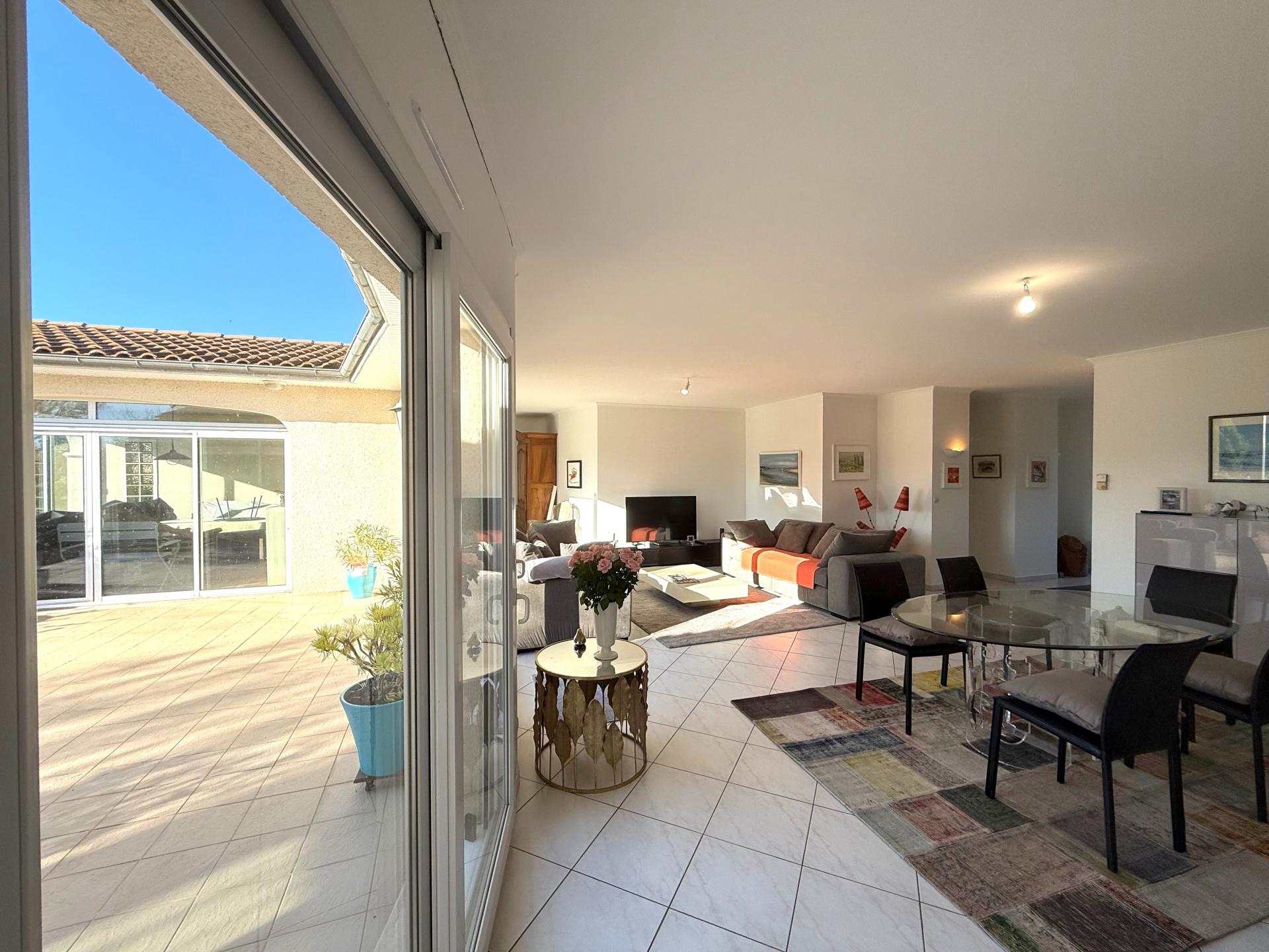 Situation centrale proche toutes commodités et services. Grande et belle maison de plus de 185 M2 habitables + 135 M2 de garage, atelier, cave. . . Soit 320 M2 à utiliser. Les espaces de vie lumineux encadrent la terrasse de plus de 45 M2 équipée de stores bannes. Hall d' entrée / séjour de 70 M2, cuisine / salle à manger d' été avec cheminée-barbecue d' un côté et de l' autre, salon d' été cachant une piscine intérieure. Grande cuisine équipée, suite parentale d' environ 40 M2 avec dressing et salle de bains baignoire + douche et 2 autres chambres avec salle d' eau + 1 bureau utilisable en chambre. Vue magnifique de la terrasse et des pièces de vie. Le terrain de 1 200 M2 permet la construction d' une deuxième piscine en contrebas de la terrasse. Carport maçonné devant l' entrée de la maison.Très beau potentiel à adapter à vos envies, à visiter impérativement si vous voulez habiter Bouliac. Propositions d' ameublement proposées par l' IA sur certaines photos.