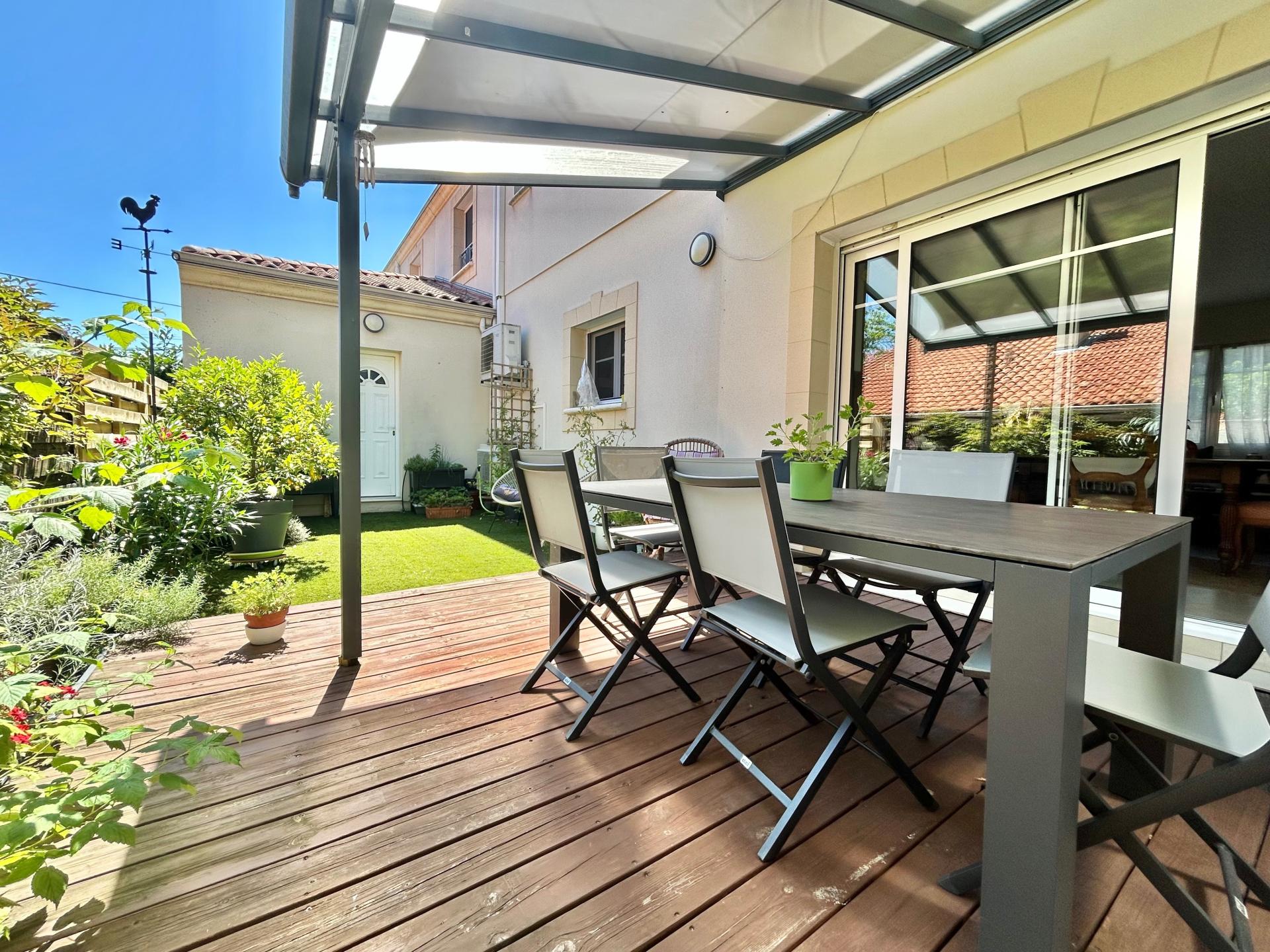 Bruges Centre maison moderne clé en main. Petite résidence sécurisée de 6 lots à très faibles charges, syndic bénévole. 123 m2 Au rez-de-chaussée une grande pièce de vie de 45m2 avec accès direct au garage, un jardin avec pergola et terrasse d'environ 40m2, un wc, une grande penderie. A l'étage trois chambres avec placards de 11m2, 12m2 et 14m2, un wc, et une suite parentale de 20m2 avec dressing et salle d'eau. Un garage et une place de parking sont inclus Commerces de proximité et Leclerc de Bruges à 5min Tram C Ausone DPE B Pompe à chaleur, chauffage par le sol