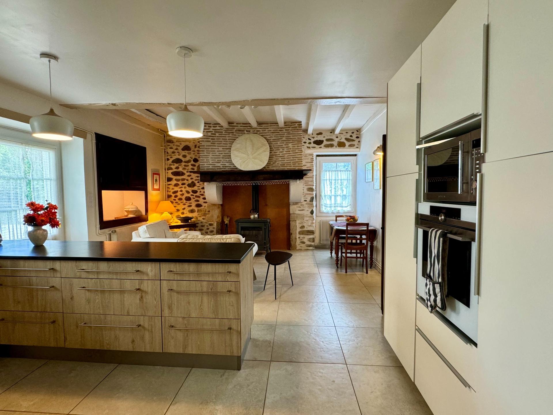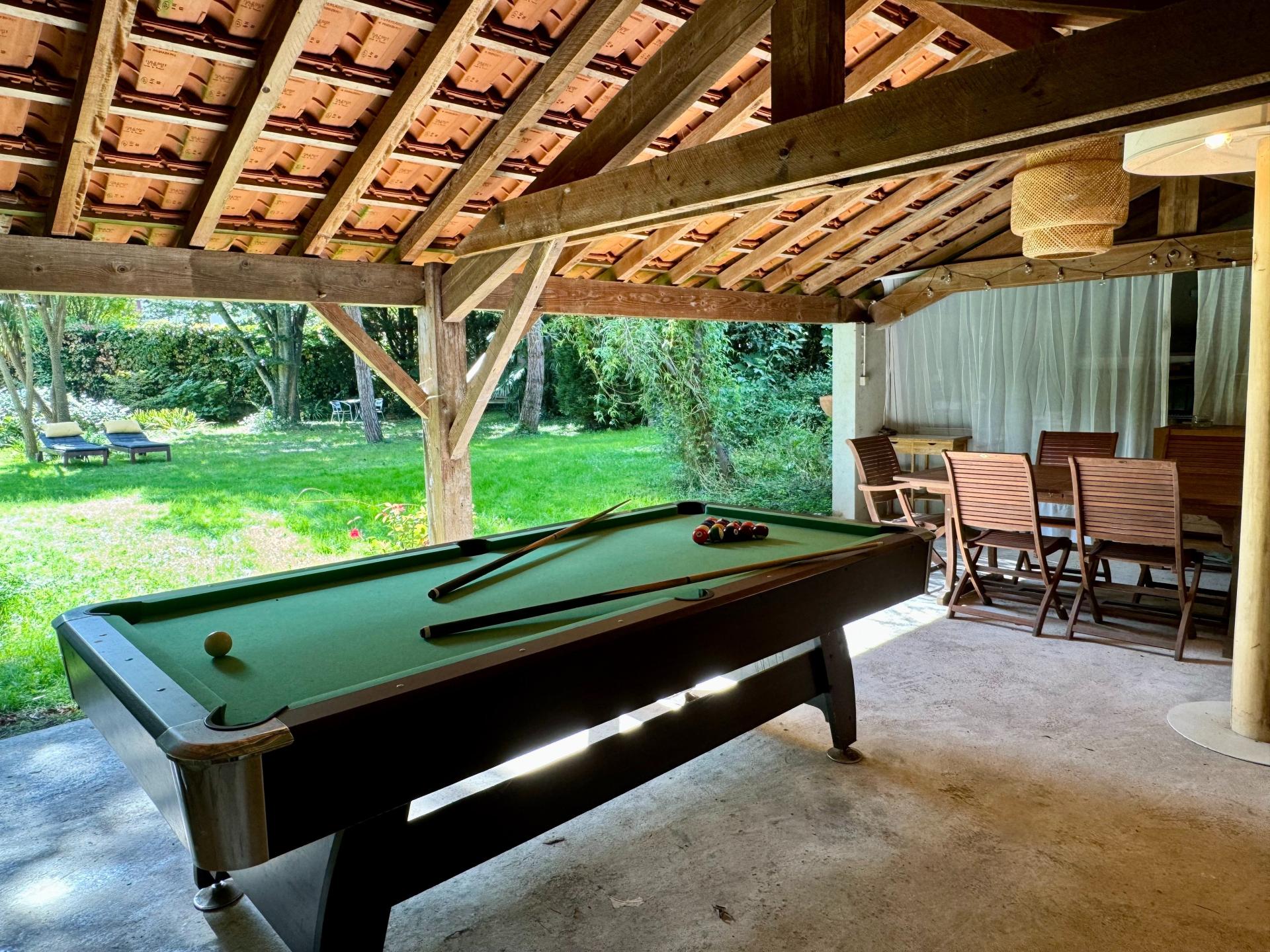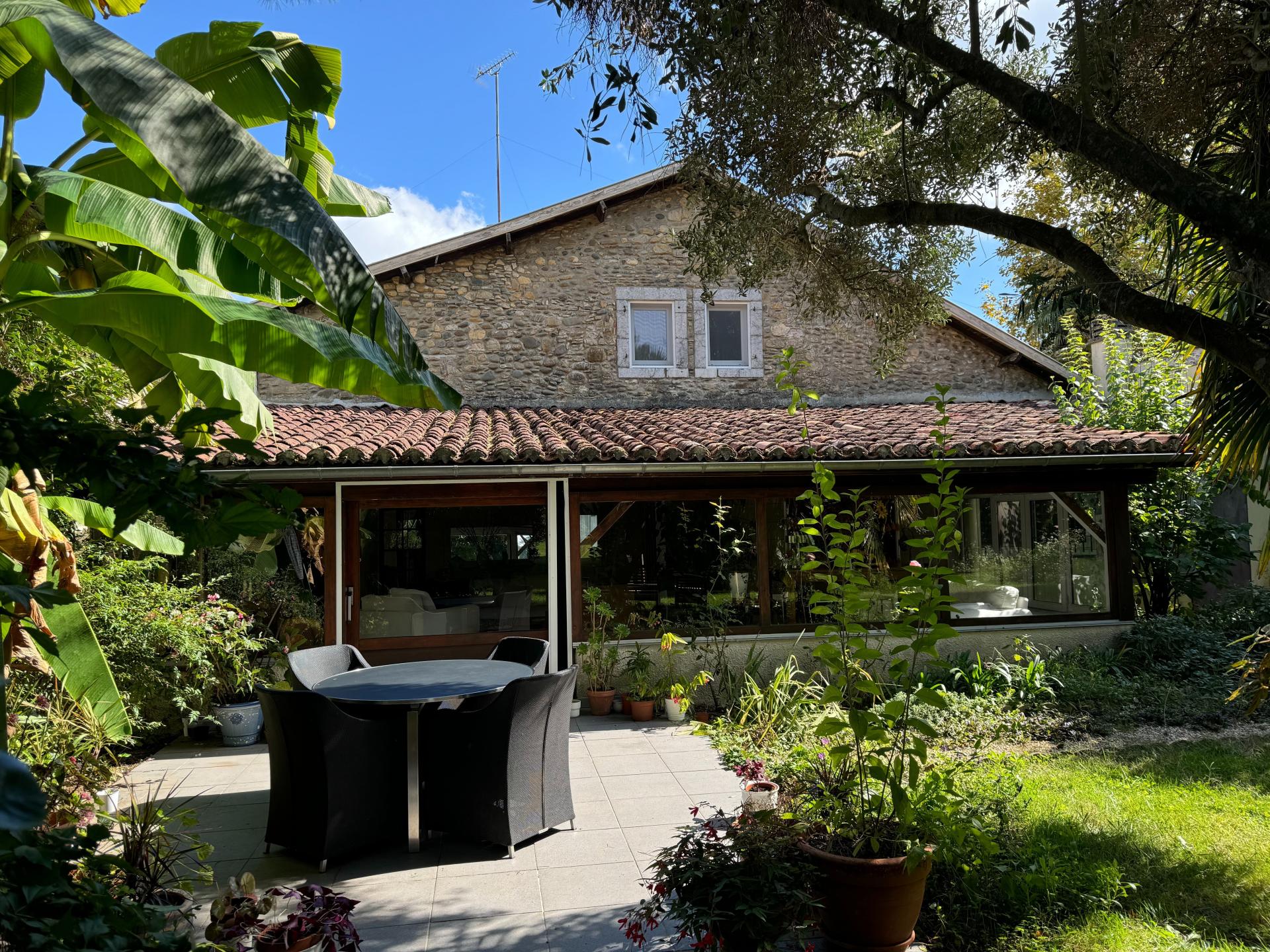 This traditional Landaise farmhouse dating to 1771 has been professionally renovated in recent years and offers everything you would need for an ideal family home, or second residence. The ground floor entrance hall leads through to a sumptuous 56m2 central reception room with heigh ceilings, exposed stone walls and a magnificent stone fireplace. Beyond here can be found a large, modern fitted kitchen, with seating around a second cosy fireplace fitted with a wood-buring stove - the perfect family room. Behind the kitchen is a second preparation kitchen and pantry, which leads to the veranda / summer room overlooking the lush landscaped gardens. A further summer kitchen / utilty room, two WC's, a downstairs bedroom, dressing room and spacious bathroom complete the ground floor. The upper floor level provides 4 further bedrooms, two bathrooms and spacious study and TV room. The interior decoration harmoniously blends period authentic charm with modern facilities and comforts. Outside, the mature landscaped gardens offer a haven of peace and tranquility; its half an acre of private grounds extending from the rear of the farmhouse, with an open-sided barn providing a covered dining area and several shady spots for relaxing away from the heat of the summer sunshine. For keen gardeners, a spectacular vegetable plot and orchard is situated at the far end of the garden, with an enclosed chicken run. This part of the garden overlooks open fields and pasture land. The property is situated in the heart of a quiet village which boasts one of the regions most reputable restaurant and access to some fabulous riverside beaches. Furthermore, the popular thermal spa town of Salies de Bearn is just a short 6km drive and the atlantic coast around Biarritz just 40 minutes.