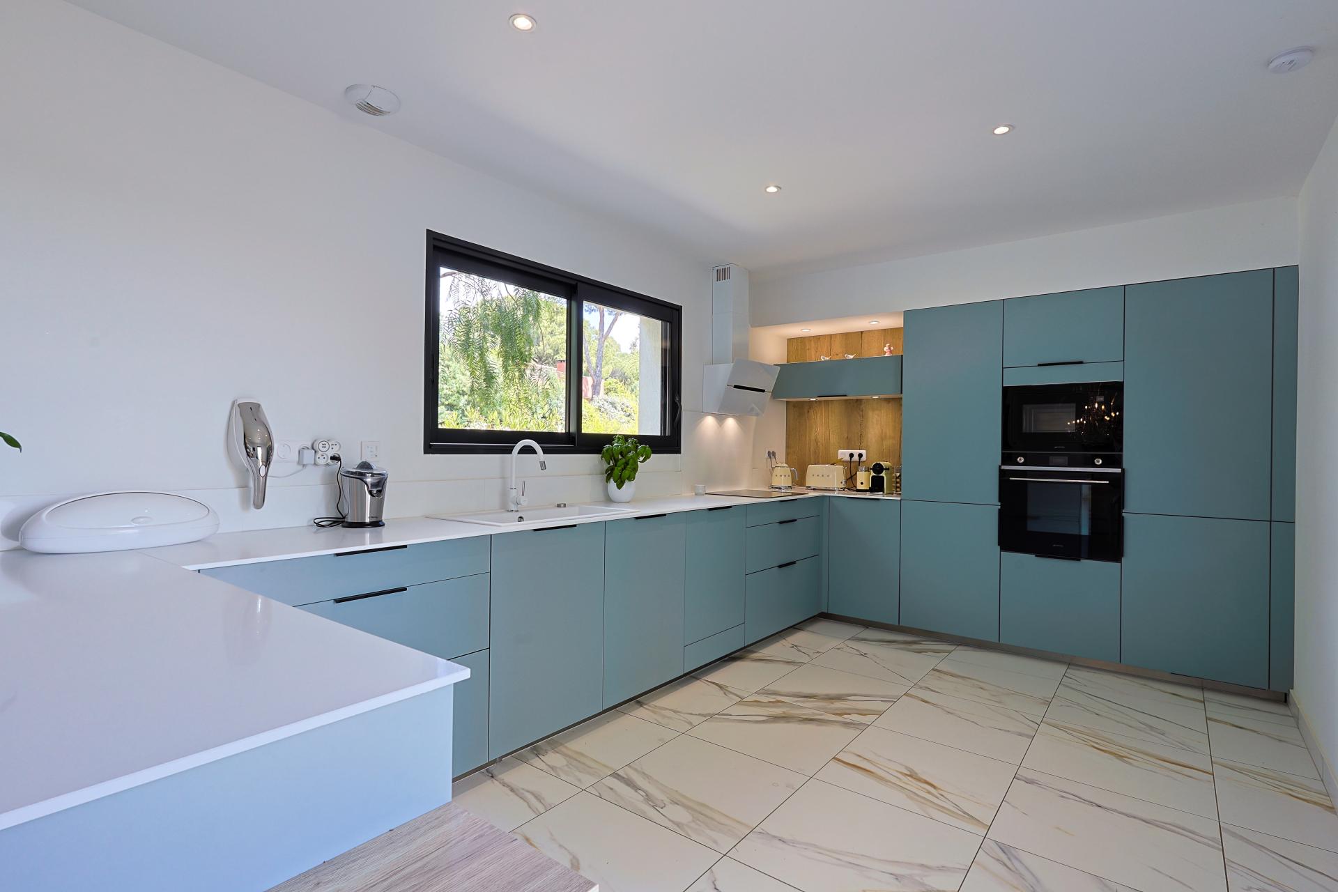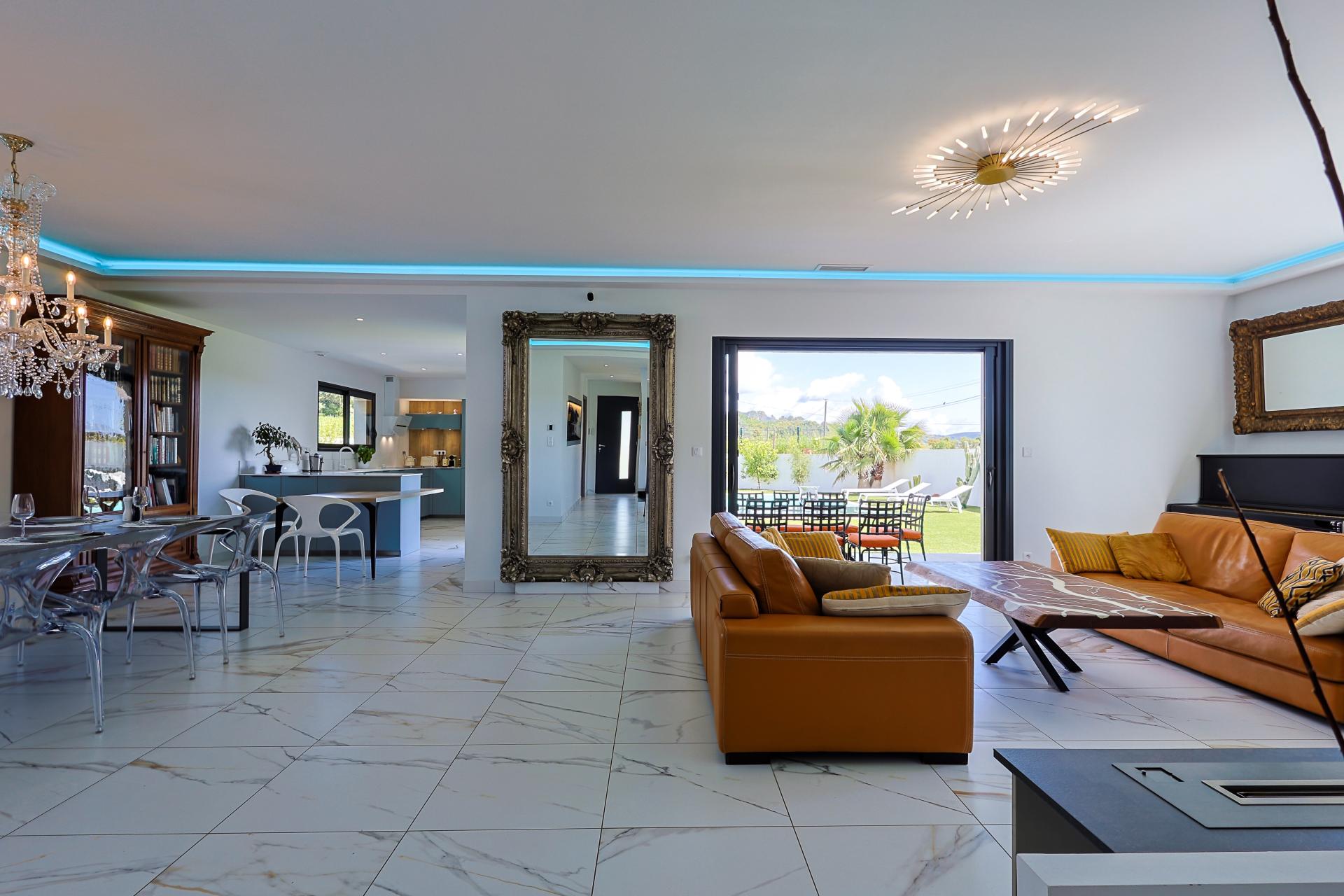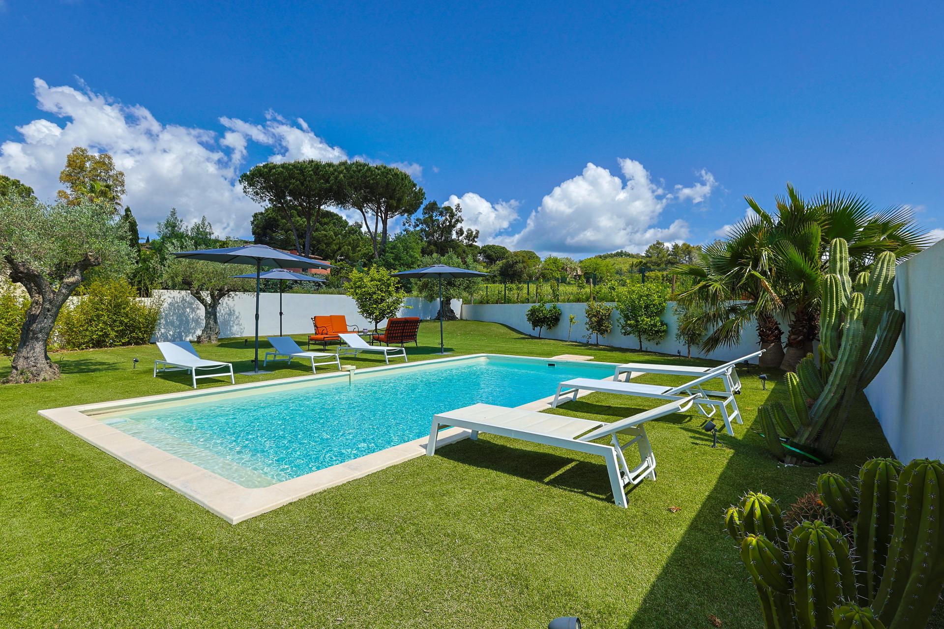 Just minutes from Saint-Tropez, in a quiet and sought-after area between Cogolin and Grimaud, this contemporary villa built in 2022 stands out for its brightness and seamless indoor outdoor living. The house is centered around a spacious, light-filled living area where large openings flood the interiors with natural light. The lounge, dining area, and fully equipped open kitchen flow effortlessly onto the terrace and pool, creating a natural continuity between inside and outside. The property offers four bedrooms including two suites, with a practical and comfortable layout suited to both family living and entertaining. Outside, the villa features easy-to-maintain grounds, a swimming pool, and several areas dedicated to relaxation and outdoor dining. A closed garage with direct access and additional parking complete the property. Fully turnkey, with a ten-year structural warranty valid for a further six years, this is an ideal primary or secondary residence close to Saint-Tropez.