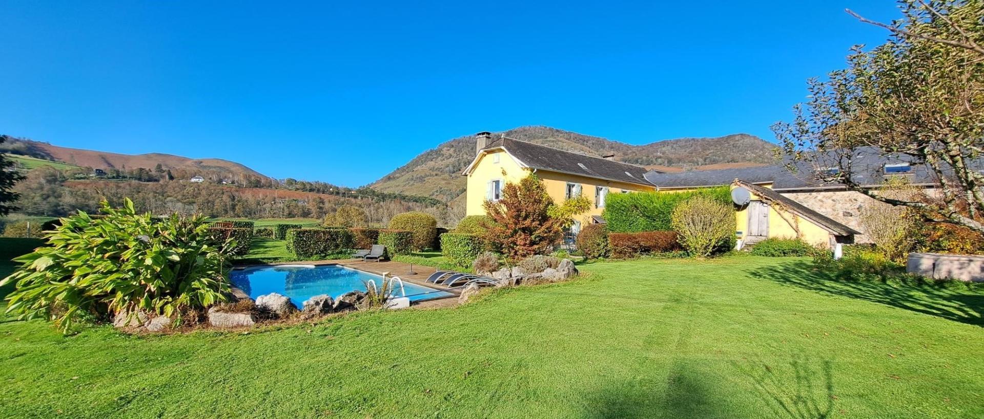Located in a remarkable setting in Issor (64570), this property offers a peaceful environment perched above the village. Close to Oloron Sainte-Marie and just an hour from Pau, it also enjoys a strategic location on the route to the La Pierre Saint-Martin ski resort and Spain, providing a wide range of leisure opportunities. Set on 17,835 m² of land, the estate boasts stunning views of the valley and mountains, surrounded by a landscaped park with a 5x10m swimming pool—perfect for relaxation and well-being. The Domaine Les 3 Baudets stands out with its carefully designed outdoor features. A stone residence dating back to 1750 spans over 410 m², divided between a 236 m² main house and a 180 m² guesthouse area. Traditional architecture blends seamlessly with the natural surroundings, creating an authentic and peaceful green haven. A spacious parking area with a carport ensures convenience for both residents and guests. Inside, every space is designed for comfort and elegance. The 236 m² main house includes 4 bedrooms, one of which is a master suite, a cosy living area, and a fully equipped kitchen. The guesthouse section offers 5 bedrooms with en-suite bathrooms, a welcoming dining room with a wood-burning stove, a bar, a professional kitchen, cold storage, and more. This exceptional residence is perfectly suited for a prestigious bed and breakfast business, combining authentic charm with modern comfort. A 100 m² stone barn also enhances the value of this outstanding property. To reduce energy consumption by around 50%, an innovative solar tracker system has been installed, enabling self-sufficient energy use. A unique opportunity for a couple or partnership looking to invest in a property full of authentic charm, offering comfort, tranquillity, and significant professional income potential.