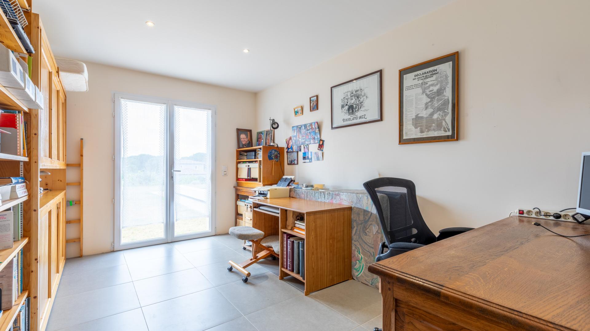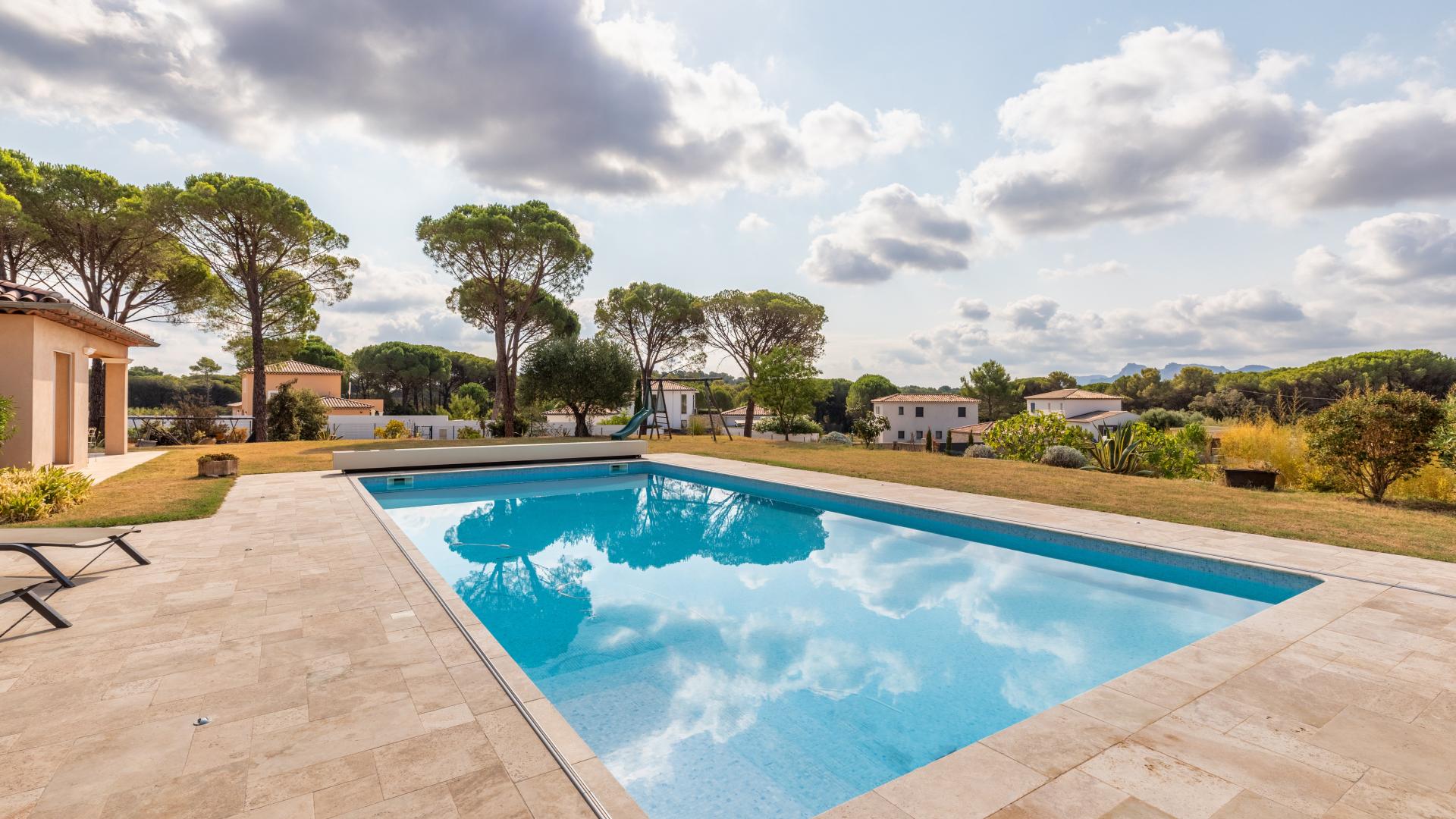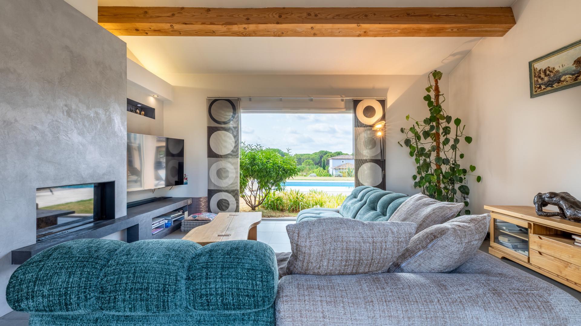 In a preserved green setting and in absolute calm, this very upscale villa will seduce you with its generous volumes and quality services. It offers, on the ground floor, a beautiful entrance hall opening onto a large bright living room, where are side dining room, elegantly furnished open kitchen and living room with fireplace, 2 real master bedrooms, as well as an ideal office for telecommuting. An open-plan kitchen with a scullery, a large laundry room. The floor offers 2 bedrooms, one on the terrace, a bathroom and a toilet. A veranda leads you to a vast garden, numerous terraces including a covered one, a summer kitchen, a 12/6 swimming pool equipped with a solar cover and a pool house, a pétanque field, a fountain as well as a space arranged to accommodate a camper. And finally a basement and a double garage. All with high-end services. Its architecture and privileged environment make it a rare property on the market, combining comfort, functionality and refinement. A haven of peace to discover without delay!