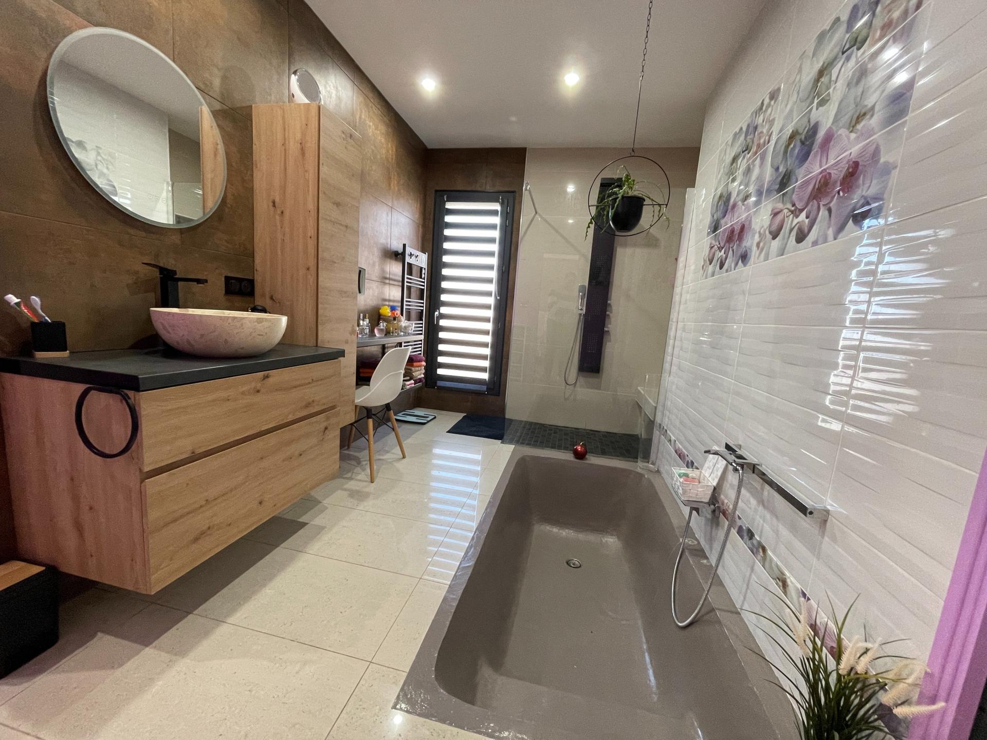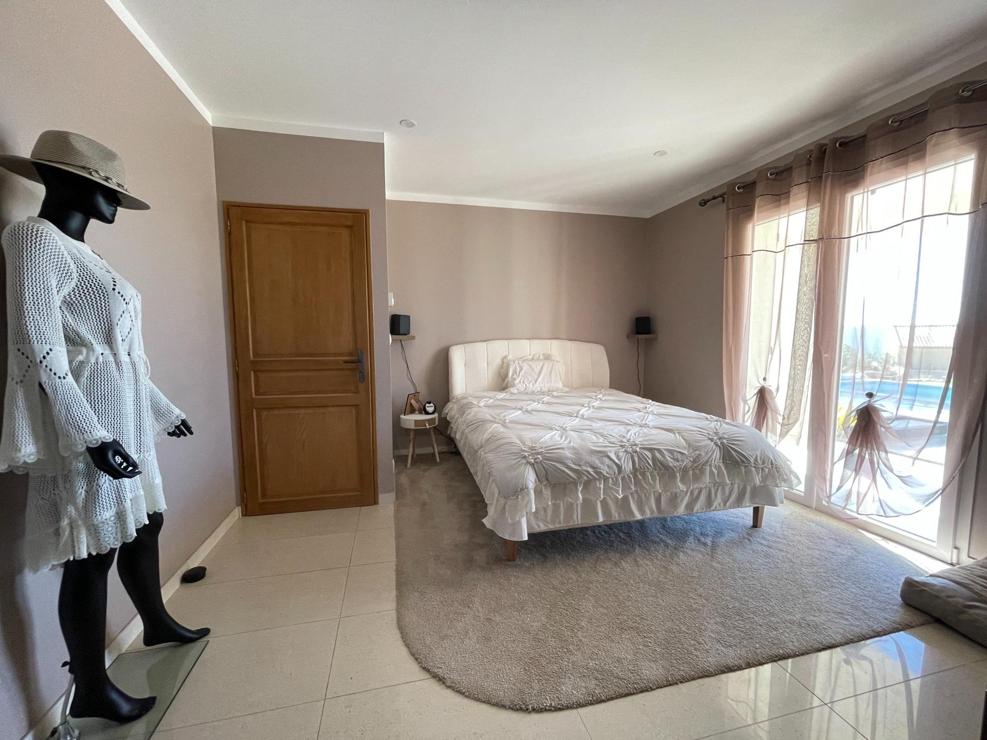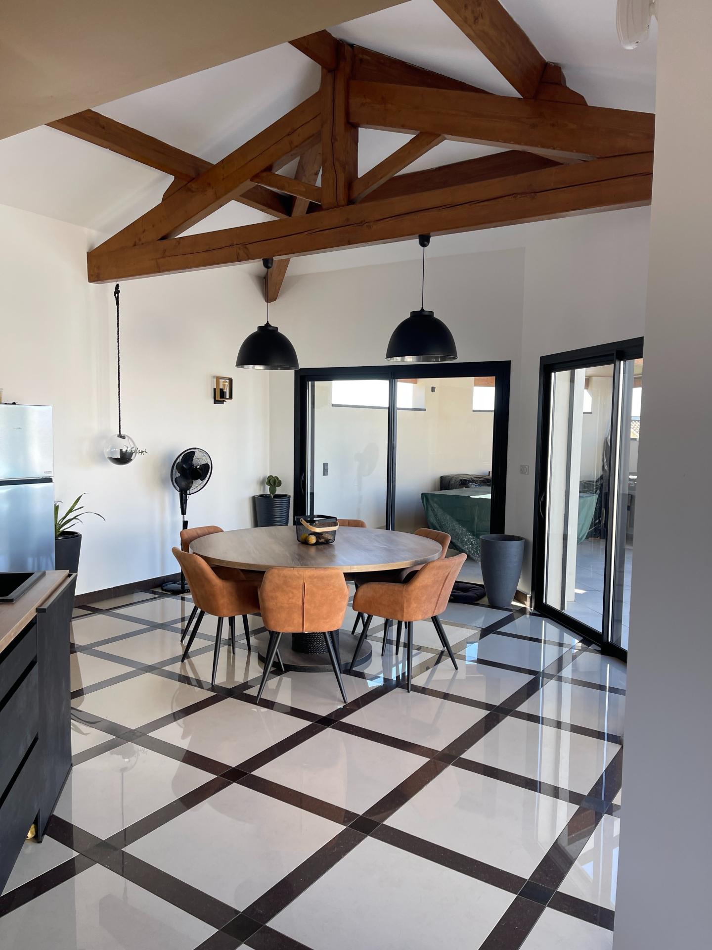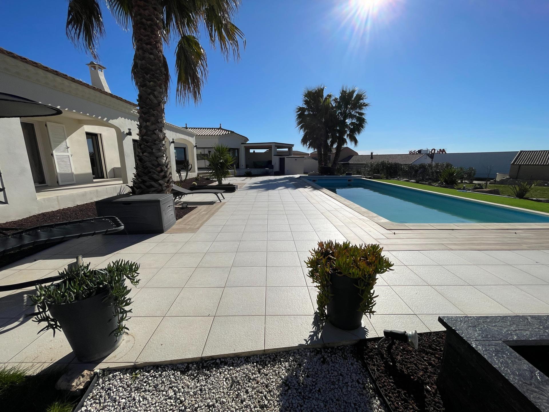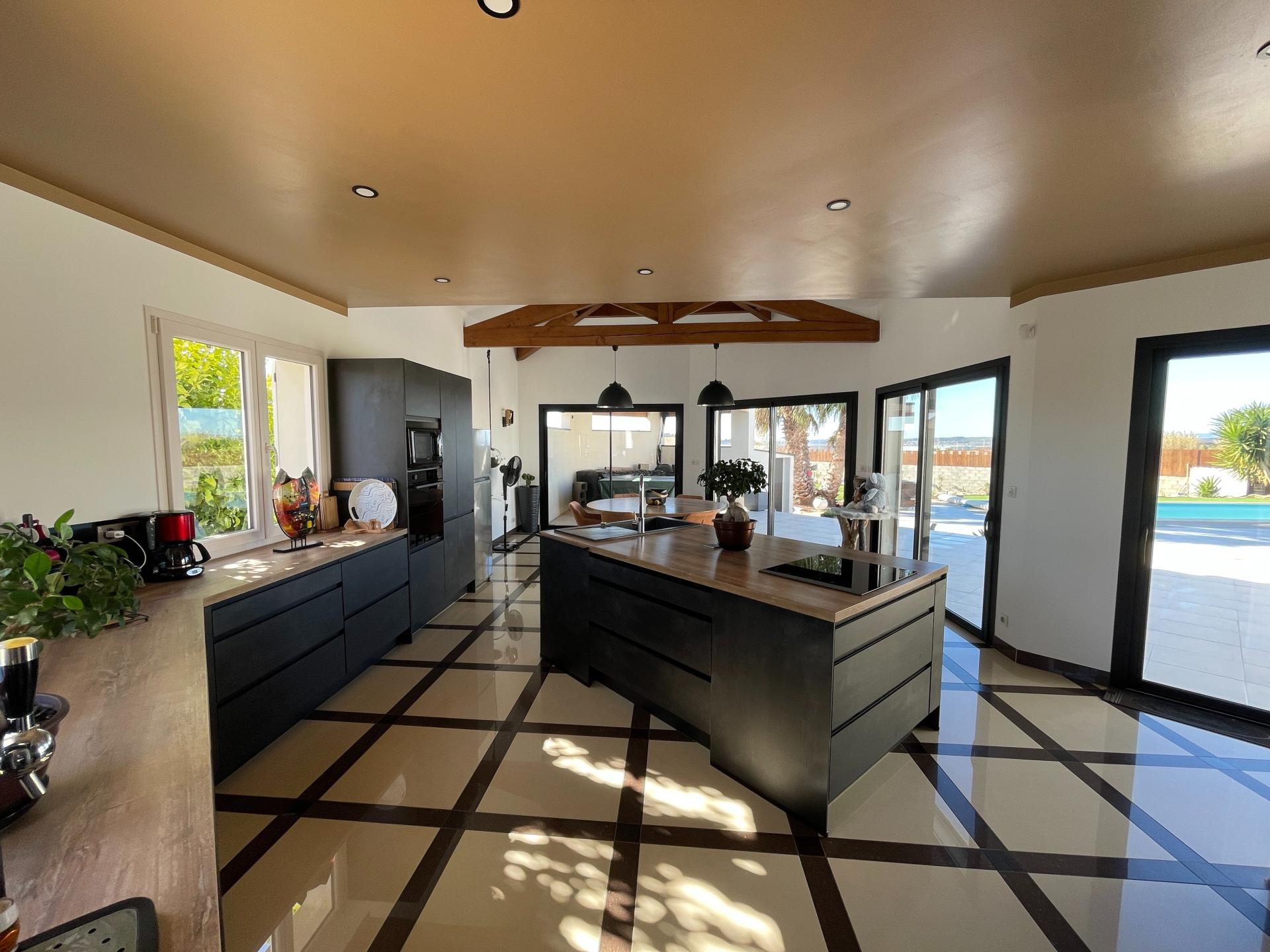Villa plain-pied de 172 m² – Prestations haut de gamme Située dans un cadre résidentiel calme, à proximité immédiate des commerces, cette villa d’architecte de 172 m² habitables est en parfait état. Elle est implantée sur un terrain arboré, clos et soigneusement entretenu de 2 500 m². La maison propose de vastes volumes, notamment une spacieuse cuisine ouverte avec cellier et un espace salle à manger. La partie nuit se compose de deux suites parentales avec salles de bains privatives et dressing commun. Un grand bureau, transformable en troisième chambre, ainsi qu’un second bureau idéal pour le télétravail et un salon télé convivial, complètent l'espace intérieur. L'alliance de la fonctionnalité et du confort contemporain est renforcée par des équipements de qualité : • Chauffage gainable réversible • Volets roulants et portail motorisés • Système d’alarme, vidéosurveillance et interphone À l’extérieur, vous profiterez d’une vaste terrasse orientée plein sud et d’une piscine au sel avec plage carrelée, le tout sans vis-à-vis. Un atelier indépendant et une salle à manger d'été viennent parfaire cet environnement verdoyant qui offre, par temps clair, une vue magnifique sur la chaîne des Pyrénées. À noter qu'un permis a été accordé pour la construction d'un garage indépendant de 65 m² et d'un carport de 27 m². Un bien rare alliant architecture moderne et art de vivre méditerranéen.