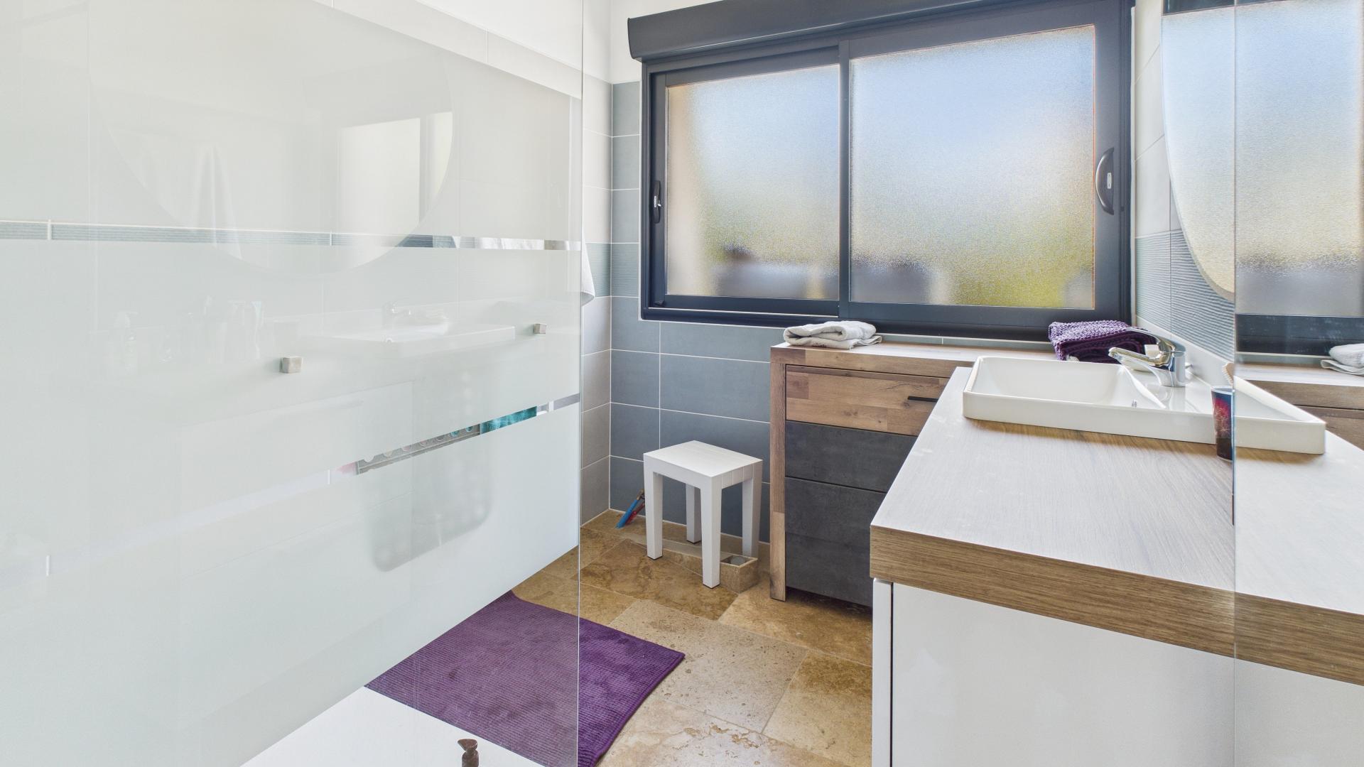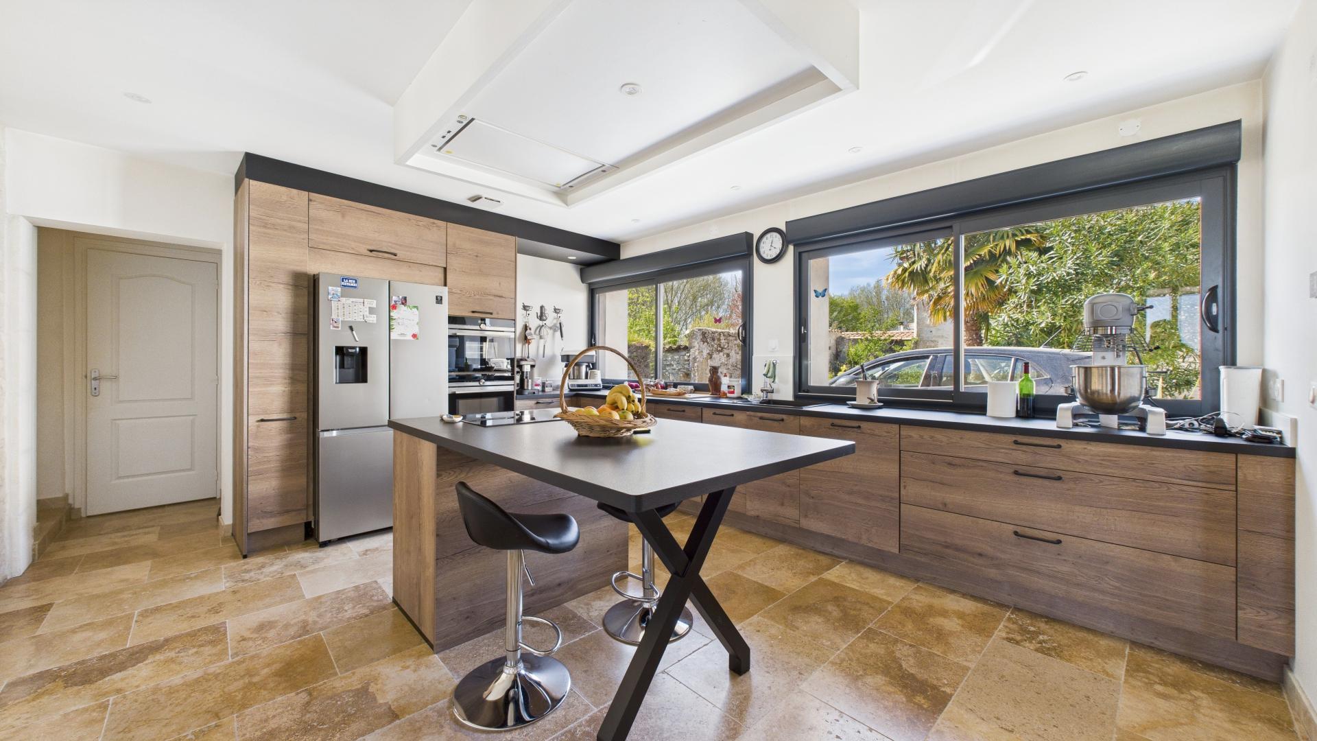 Maison principale mariant tradition/modernité (travertin, cheminée)
