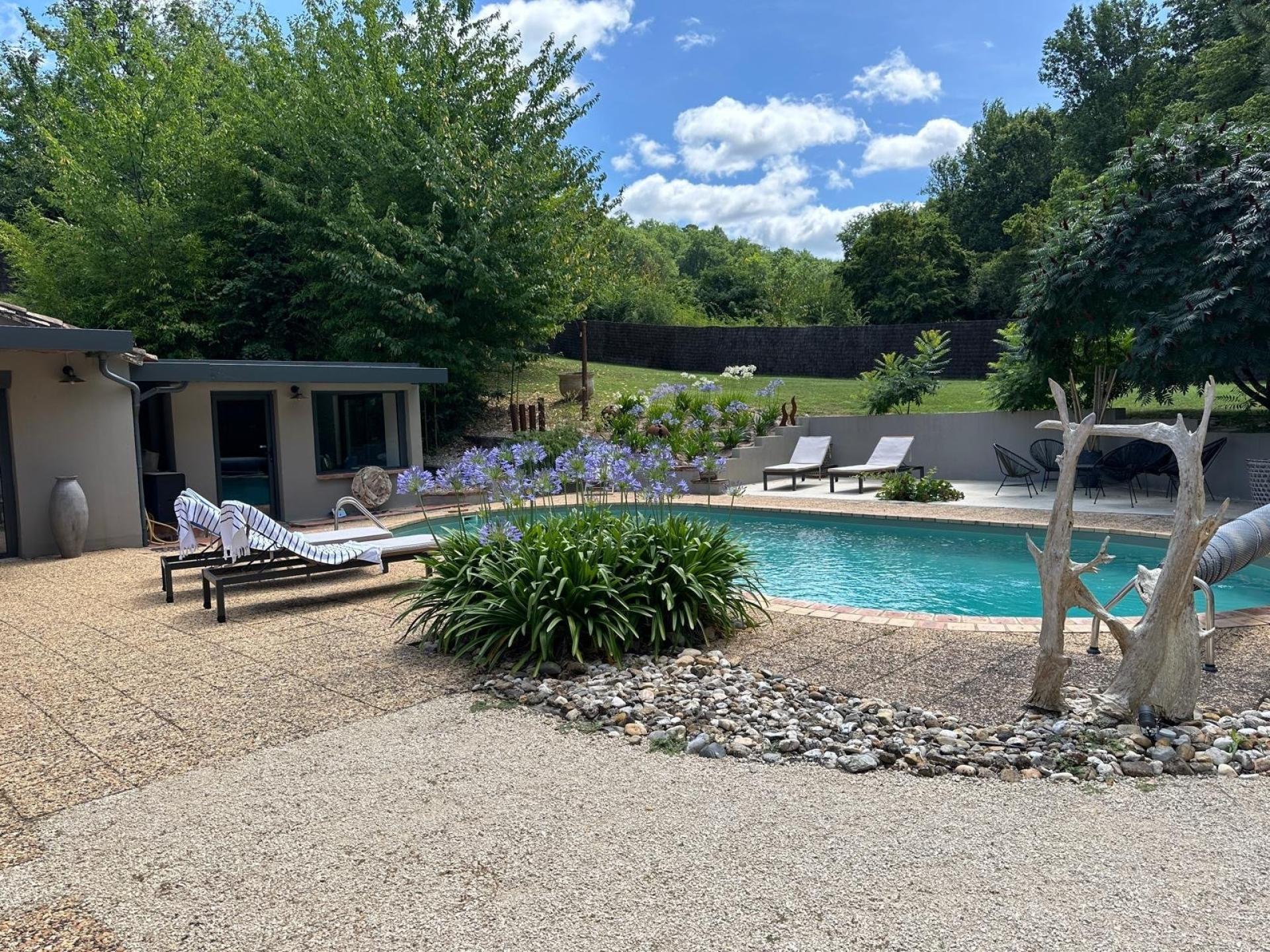 Située calme dans un écrin de verdure, tout en restant proche de commodités ou du centre ville, cette propriété entièrement rénovée (construite en 1870) saura assurément vous séduire. Edifiée sur un terrain de 4700 m2, elle se compose d'une habitation principale de 155 m2, d'un pool house de 75 m2 (aménagé en deux pièces avec bureau, cuisine et pièce de stockage) en bordure de piscine, et de trois gîtes indépendants avec chacun une terrasse et une piscine. L'habitation principale se compose d'un grand salon avec cheminée, d'une cuisine ouverte sur salle à manger, de deux chambres avec salle d'eau et toilette, et d'une suite parentales avec dressing, salle d'eau et toilette. Plusieurs terrasses pour parti couvertes permettent de profiter des espaces en bord de piscine (11 x 5,5 au sel), ou dans le jardin. Les trois gites (de 52, 58 et 69 m2) entièrement rénovés proposent des prestations très qualitatives y compris sur le mobilier contemporain qui restera attaché à la vente. Tout le confort moderne vous est sur ce bien proposé : Menuiseries aluminium en double vitrage / PAC Air-Air avec climatisation réversible / FIBRE / Sols en travertin et parquets / Cuisines contemporaines. Aucun travaux n'est à prévoir. L'assainissement (micro-station) et l'ensemble des toitures seront refaites pour la vente. A l'extérieur, vous profiterez également d'un cabanon de jardin (15 m2), de deux aires de stationnement pour une dizaine de véhicules, d'un puits avec arrosage automatique des massifs de son parc paysagé, d'un portail automatique sur entrée de propriété ou de l'éclairage des allées. Les deux robots tondeuse assureront l'entretien du parc. Au delà de toutes ces prestations à venir découvrir, si vous en maintenez l'activité des gîtes en place, vous pourrez prétendre à des revenus d'activité autour de 25 à 30 000 euros annuels. Pour plus de renseignements n'attendez pas pour me contacter.