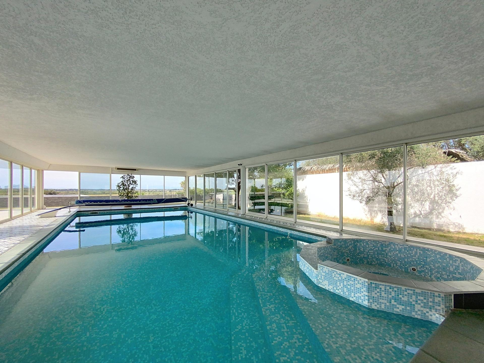 In Portiragnes, just minutes from the beaches and shops, discover this exceptional villa, nestled in a peaceful setting with panoramic sea views. Set on a magnificent landscaped plot of over 1,880 m², this rare property offers approximately 230 m² of living space. Upon entering, you'll be captivated by a bright living space of nearly 90 m², featuring a spacious living room, a dining room, and a fully equipped open-plan kitchen. This space naturally opens onto a large indoor pool (13.5 x 7.5 m) and a jacuzzi, allowing you to enjoy swimming in all seasons. The villa features three large bedrooms, two of which are on the ground floor with private bathrooms, and a superb master suite upstairs with a bathroom, shower, large dressing room, and office, all with access to a terrace offering breathtaking views. Outside, you'll enjoy privacy, two garages, a separate office, a carport, and multiple parking spaces. The amenities are worthy of the property: reversible air conditioning, aluminum joinery, motorized gate, well drilling, automatic watering, video intercom, and fiber optics. A unique villa, combining elegance, spaciousness, and functionality, ideal for those who love comfort and tranquility. For more information, contact me today at 06 11 12 37 45.