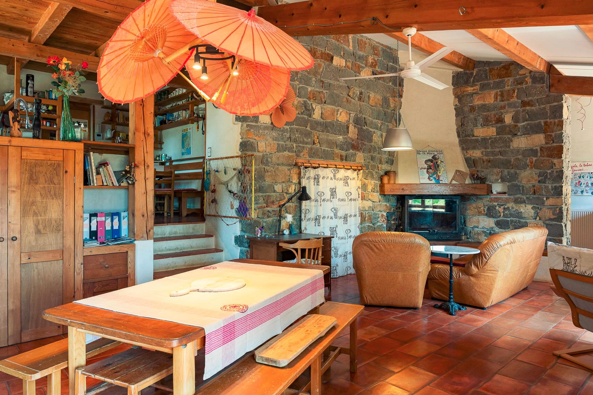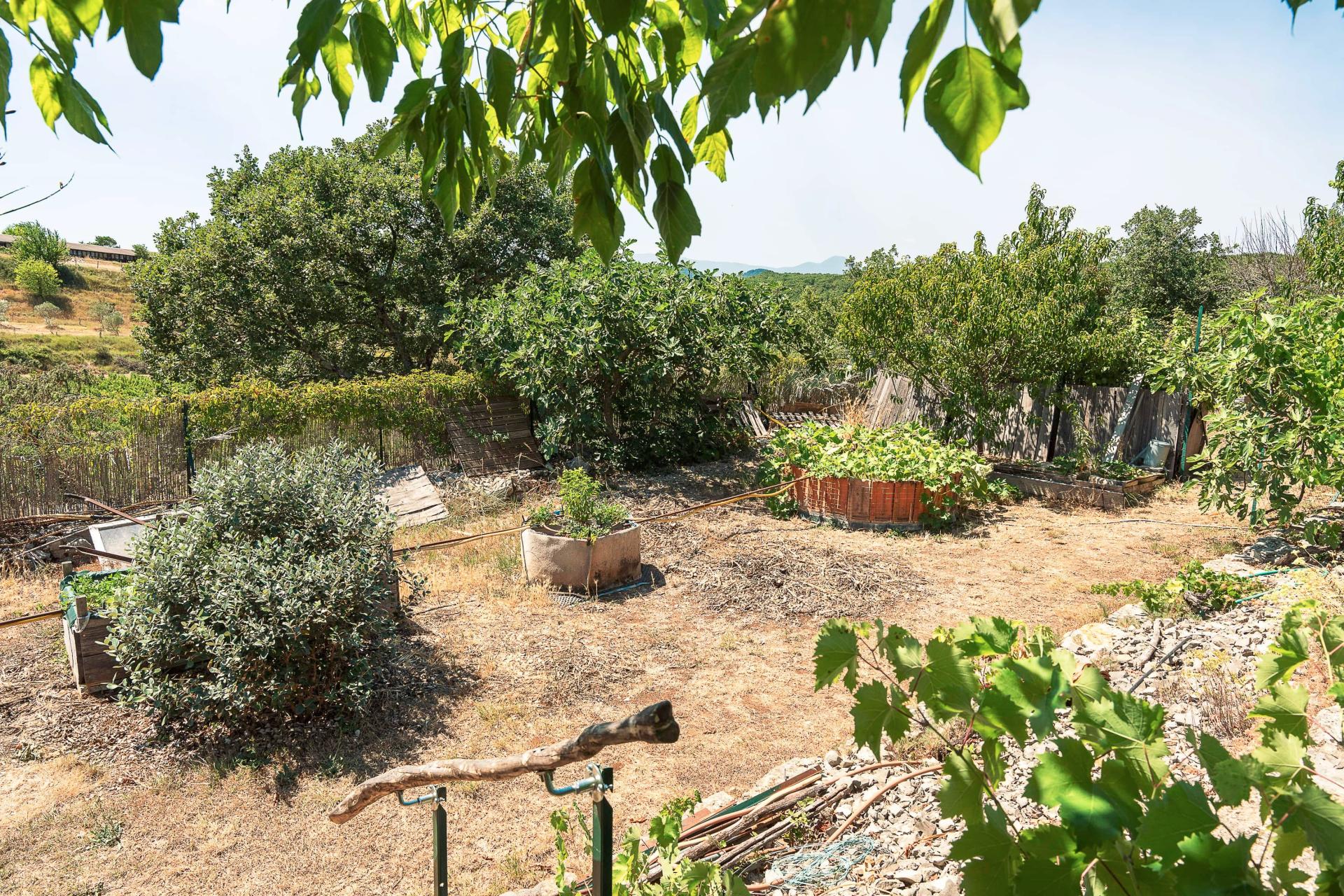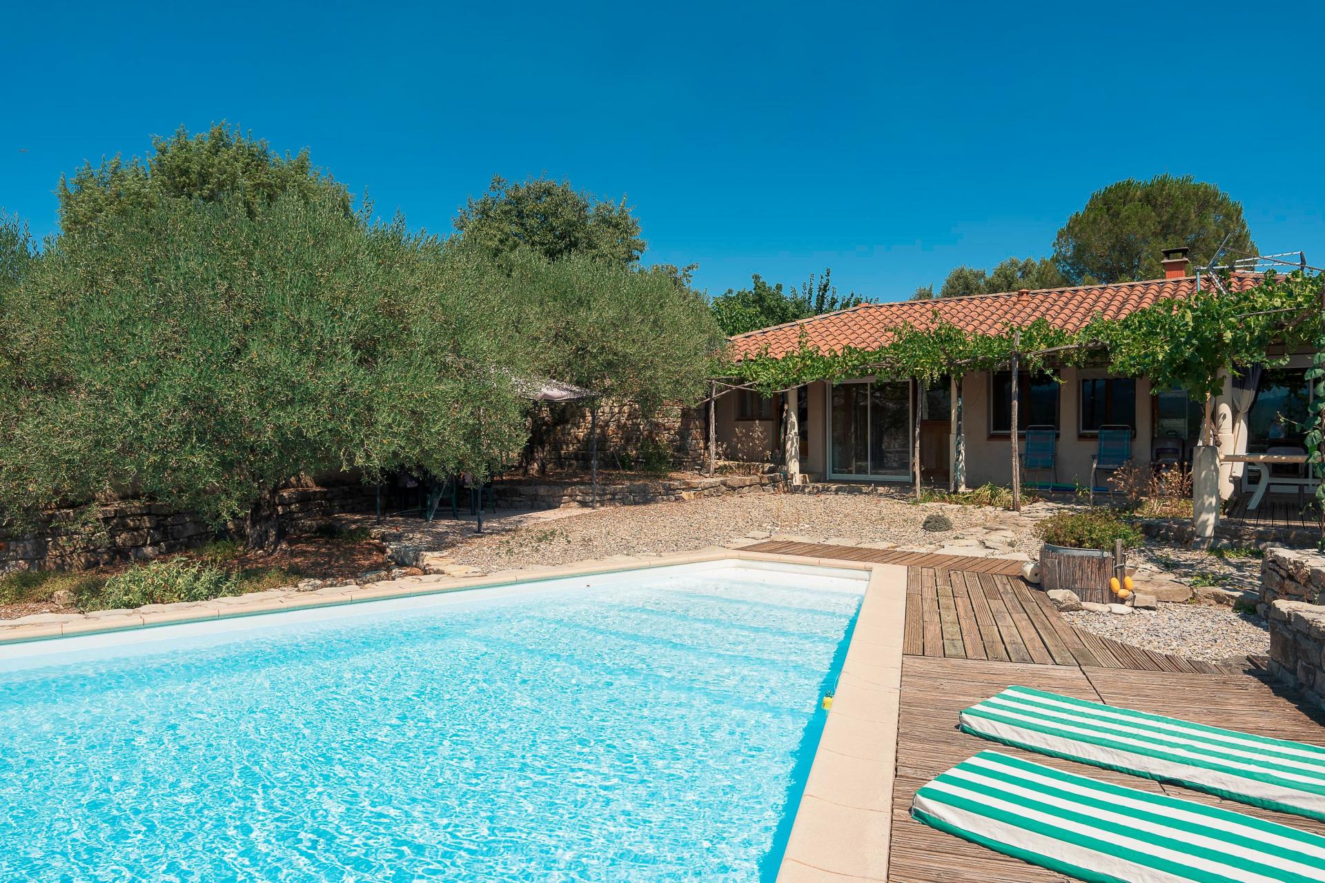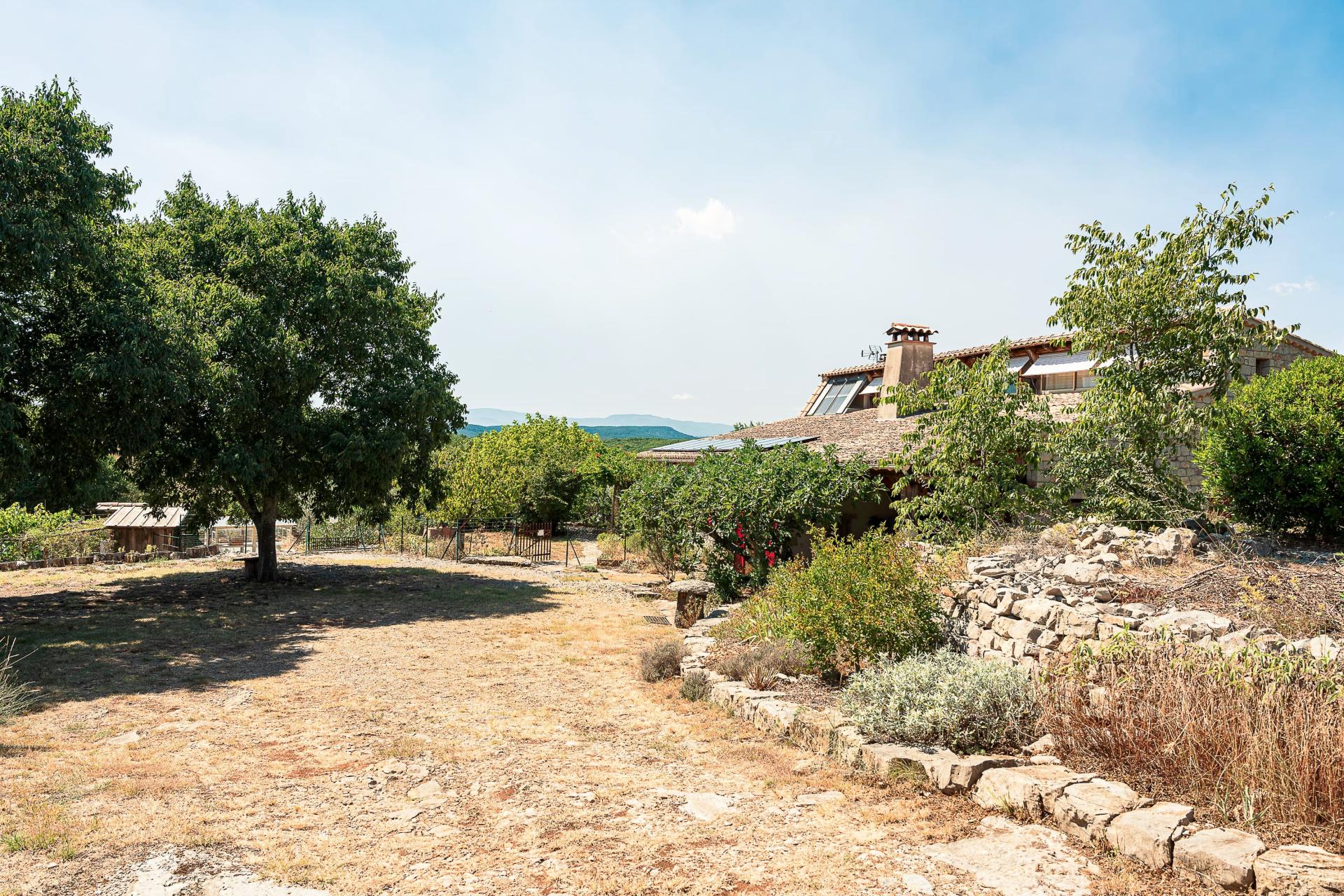 ear Barjac (07460), this house of 225 m2 on 4625 m2 of land offers a peaceful setting without vis-à-vis with an infinity pool and a panoramic view. The main house of approximately 190 m2 has 4 bedrooms, two bathrooms, a kitchen with bright dining room and living room with wood insert of 56 m2, a laundry room, a storeroom, two toilets and a workshop. Many terraces complete this property A guest house of 40 m2 added in 2011 offers an additional living space with a living room with kitchen, a bedroom en suite and a terrace with views, opening to many possibilities for reception. Designed in an ecological and autonomous approach with heating by heat pump, fuel, wood and solar, this property has autonomous management thanks to thermal and photovoltaic panels for optimal comfort, as well as two tanks of 60 m3 in total. You will also be seduced by the garden, its tall trees, its vegetable gardens, its fruit trees and the tranquility of the place.