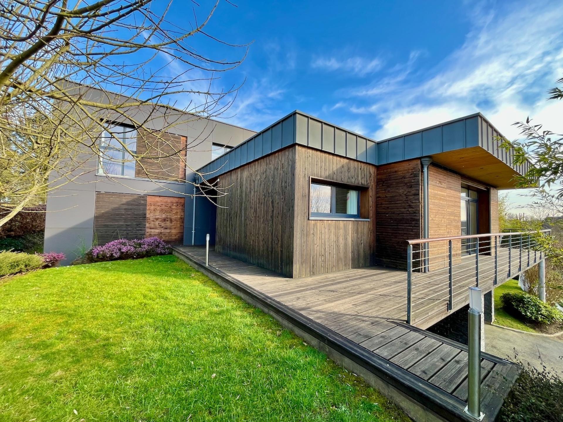 Située à Saint-Aubin-Épinay (76160), cette maison d'architecte ossature bois de 225 m² offre un cadre de vie calme et résidentiel proche de toutes les commodités. La ville bénéficie d'un environnement verdoyant et paisible, idéal pour les amoureux de la nature, tout en étant à proximité de commerces, écoles et transports en commun 15 minutes de Rouen et 10 mm du CHU. De plus, sa construction en 2009 garantit une modernité et une performance énergétique appréciables. Comprenant une entrée, très grande pièce de vie avec sa cuisine ouverte aménagée , une cave à vin climatisée , une arrière cuisine lingerie avec accès à un garage ,une chambre , une salle bain et douche, dressing et sauna . A l étage une mezzanine, 3 chambres lumineuses , un espace bureau , une salle de douche, wc . Une terrain de 803 m2 , un deuxième garage , deux grandes terrasses et un jardin paysage avec un beau bassin .