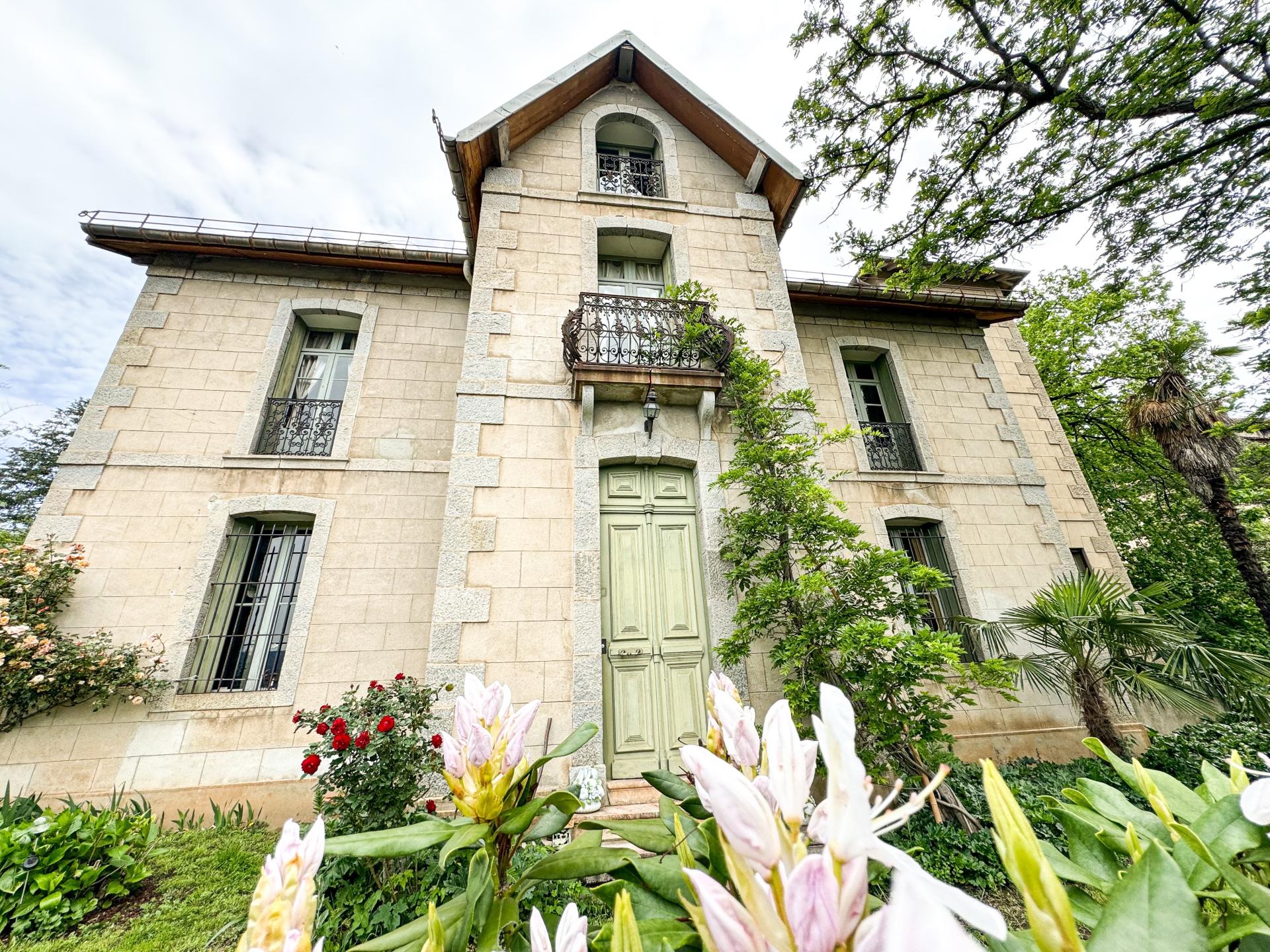 FANTASTIC ! Located in the illustrious spa resort of Vernet-les-Bains, this large mansion built on 3990 m² of land impresses with the charm of its architecture created by the illustrious Viggo Dorph-Petersen. Its cut stone facade and double-sloped slate roof are its signature. Its 350m² of living space spread over 10 rooms including 7 bedrooms and 3 bathrooms, charmingly combine the character of yesteryear and modern comfort. This exceptional property and its walled wooded park also include old stables which have become a garage and a concierge converted into three gîtes with a surface area of 100m2. Out of sight, an old pond has been converted into a swimming pool. A unique property for tourism projects, cultural exhibitions, wellness stays, or for a large family. 10 minutes from Villefranche - Vernet train station and 50 minutes from Perpignan - Rivesaltes airport.