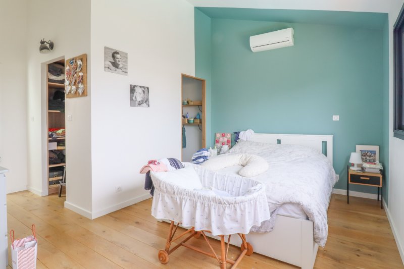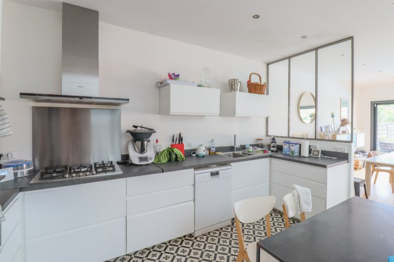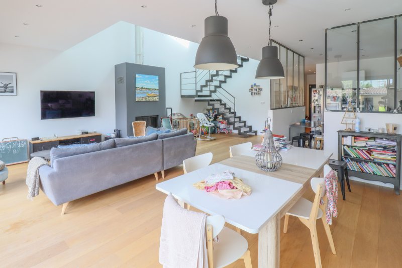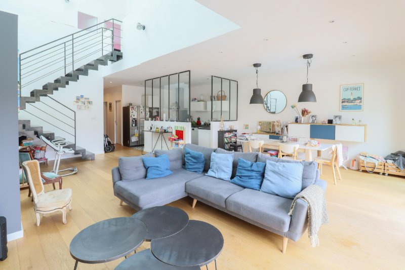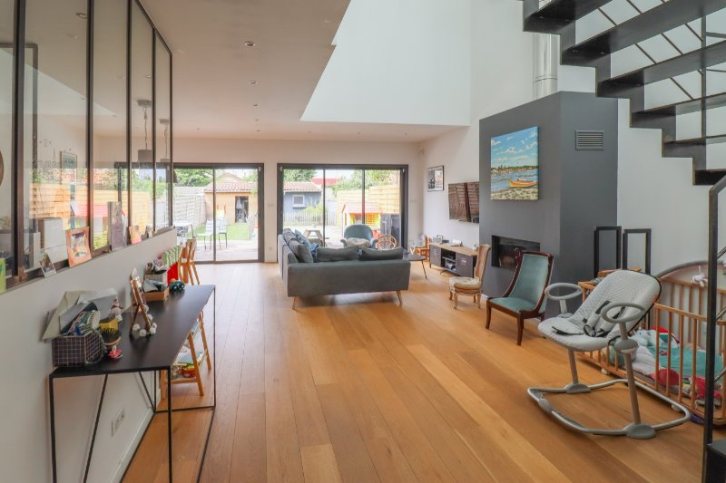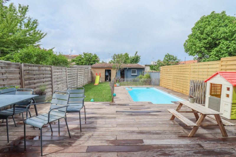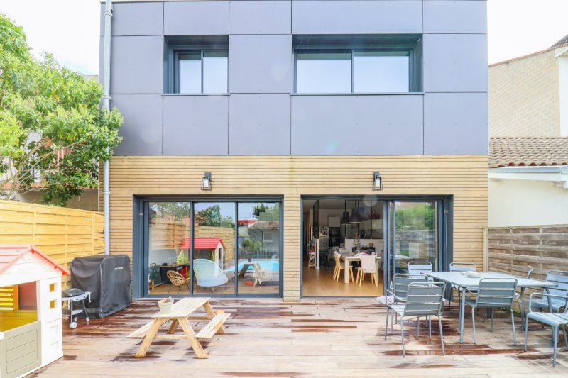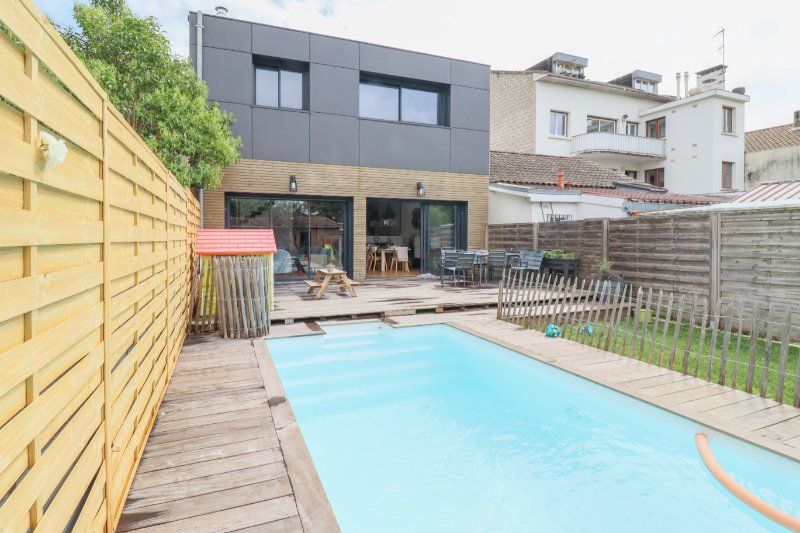 Proche du des Chartrons et du tramway ligne C (700m), dans une rue calme, venez découvrir cette magnifique maison contemporaine.<br/>Elle se compose d'un rez-de-chaussée avec un grand séjour avec belle hauteur sous plafond, une cuisine semi-ouverte, un cellier-buanderie, un wc et un garage attenant.<br/>A l'étage 2 grandes chambres avec placard, une salle de bain, un wc et une suite parentale avec salle d'eau et dressing.<br/>A l'extérieur, une terrasse avec piscine chauffée et un cabanon.<br/>Place de parking.<br/><br/>Les plus : neuf, poêle à bois, belles prestations, chauffage au sol.