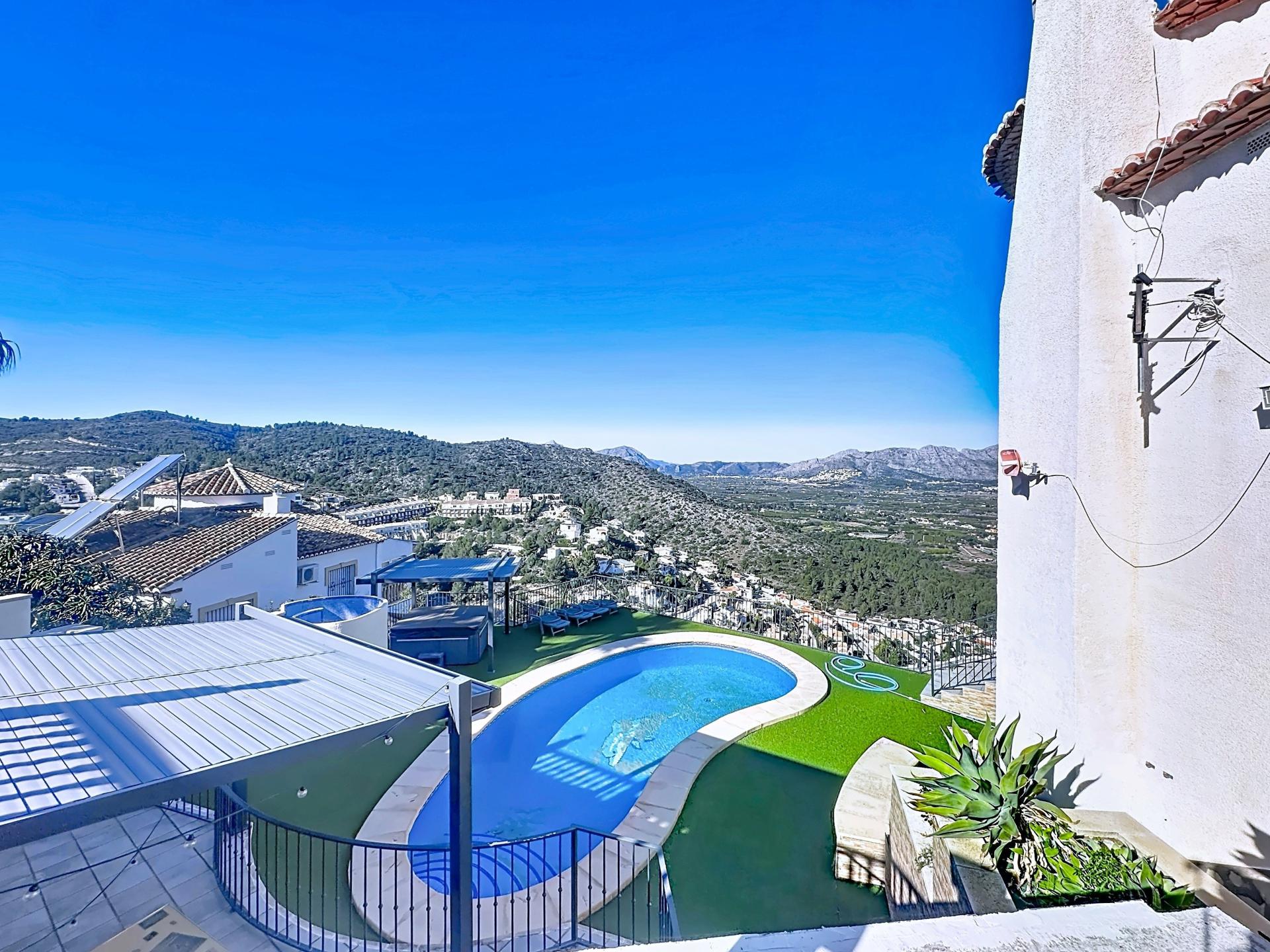 Imponente chalet en Pedreguer, a pocos minutos de Denia, con una ubicación privilegiada en lo más alto de la zona que regala una vista espectacular de la Costa Blanca, donde mar y montaña se funden en un mismo horizonte. Con una superficie de 300 m², esta propiedad combina amplitud, elegancia y confort. Dispone de 4 dormitorios, 4 baños completos y un toilette, ofreciendo el espacio ideal tanto para el día a día como para recibir invitados. Construida en 2002 y con un único propietario desde entonces, la casa se encuentra en excelente estado de conservación. Su diseño se complementa con zonas exteriores de ensueño: piscina privada, jacuzzi y terrazas abiertas que invitan a disfrutar del clima mediterráneo durante todo el año. Además, la proximidad al Centro Comercial La Marina aporta comodidad con acceso a tiendas, restaurantes y servicios.