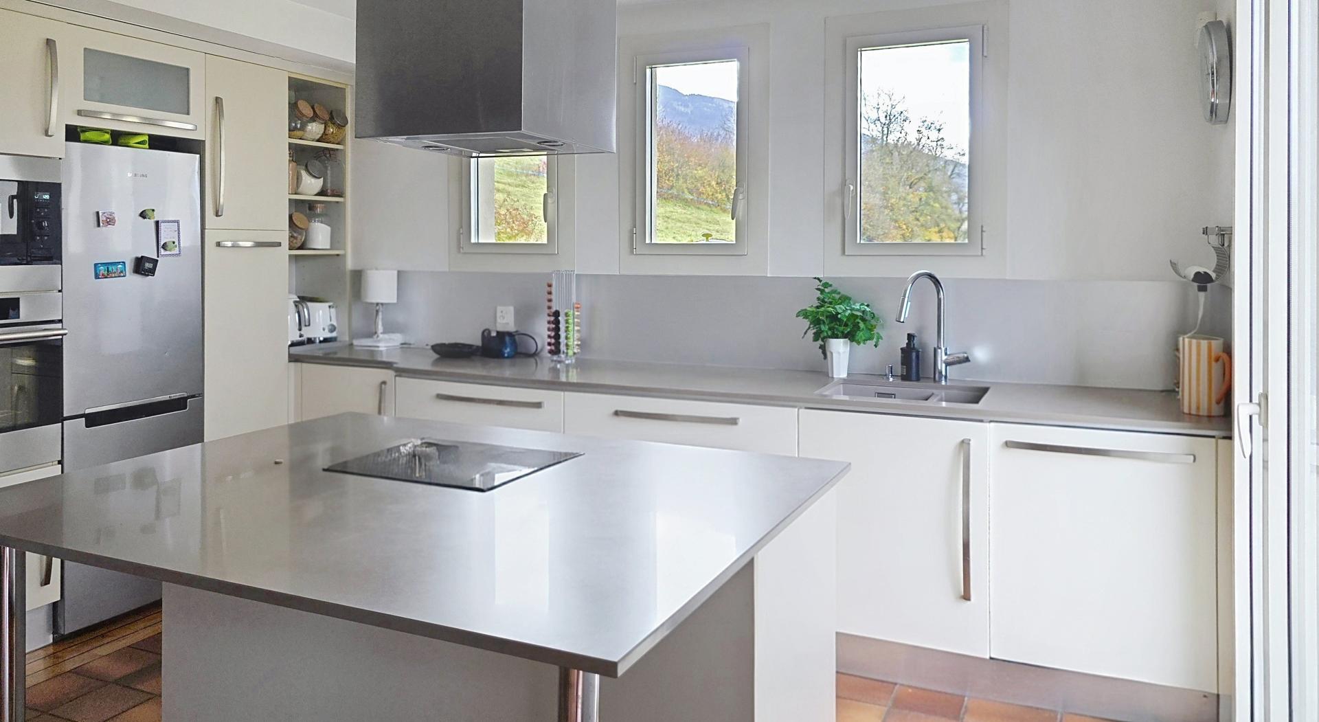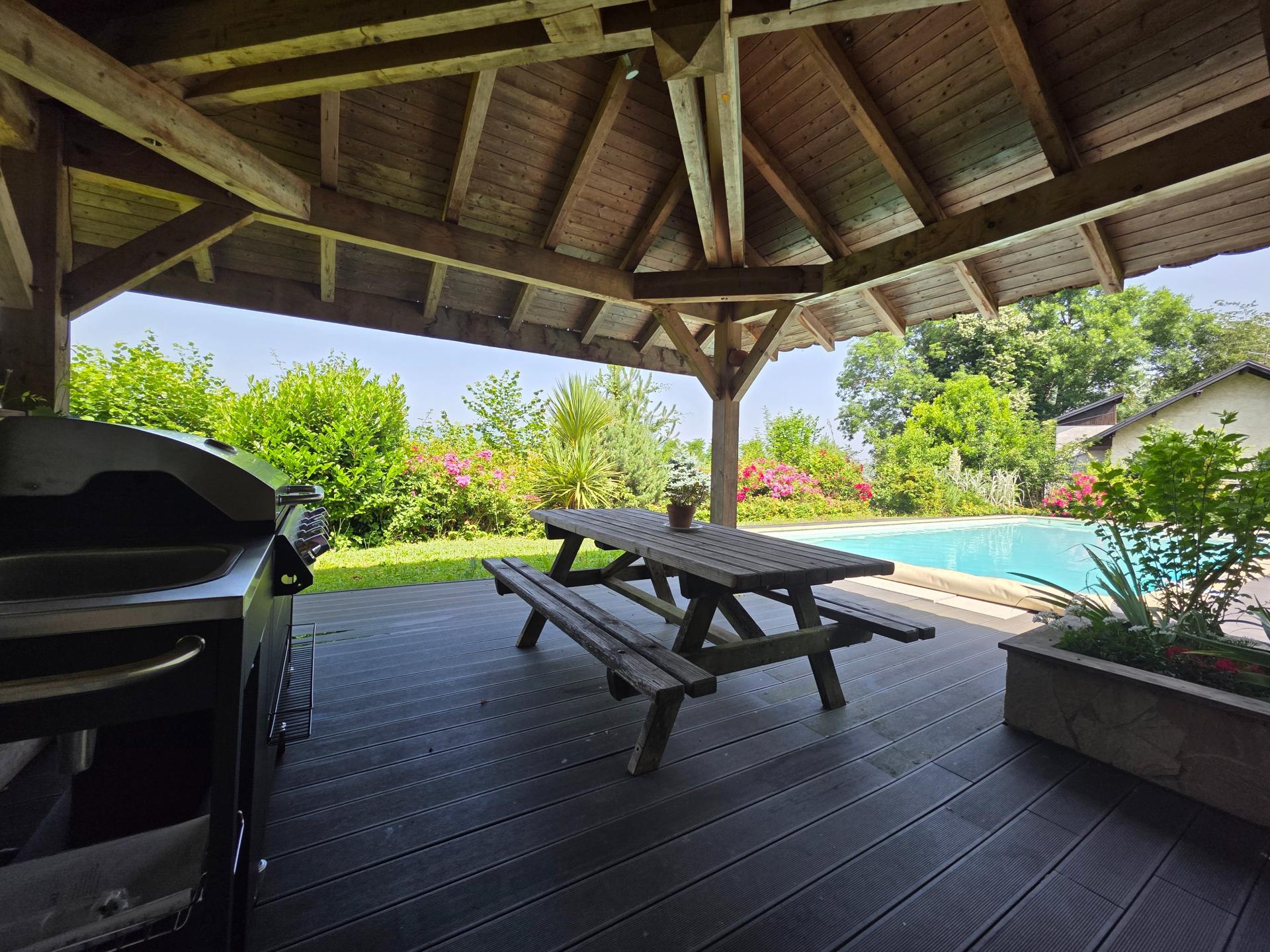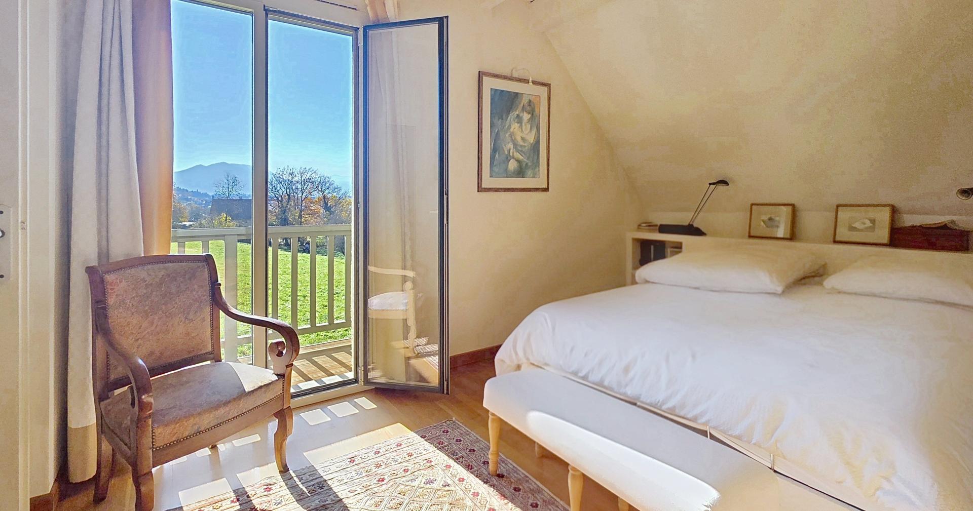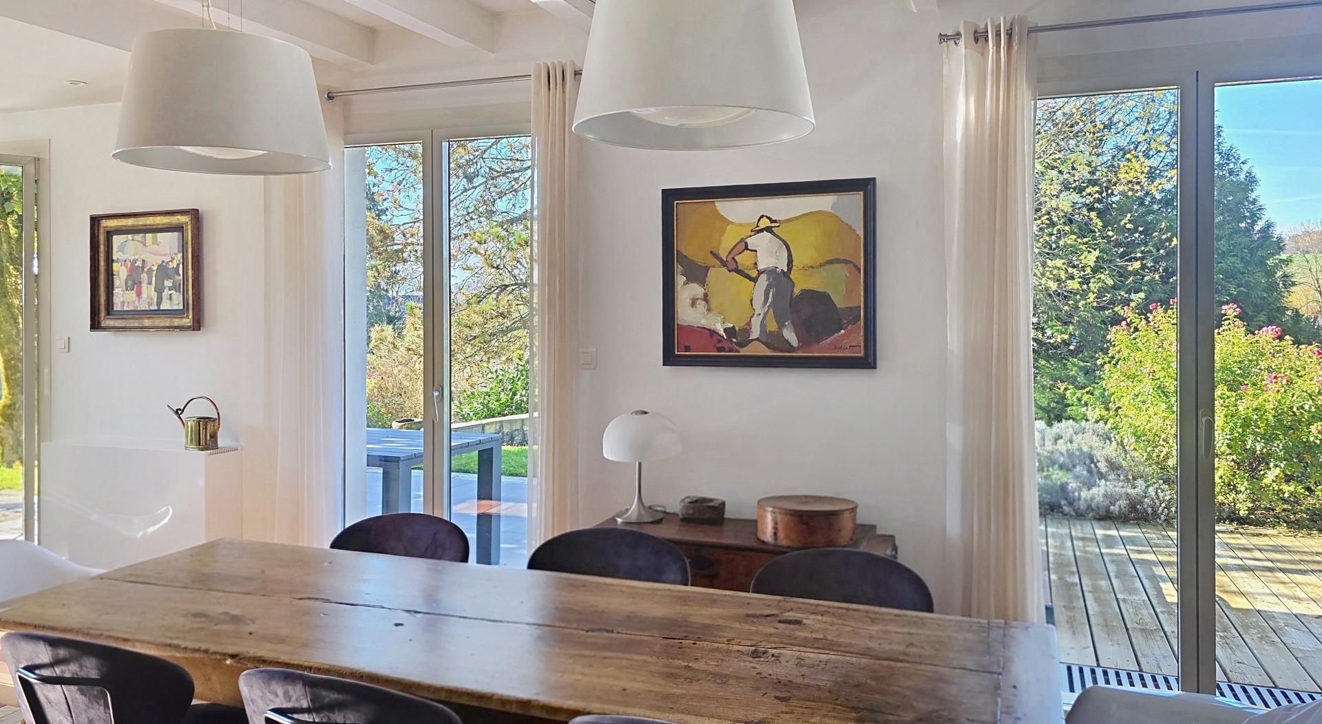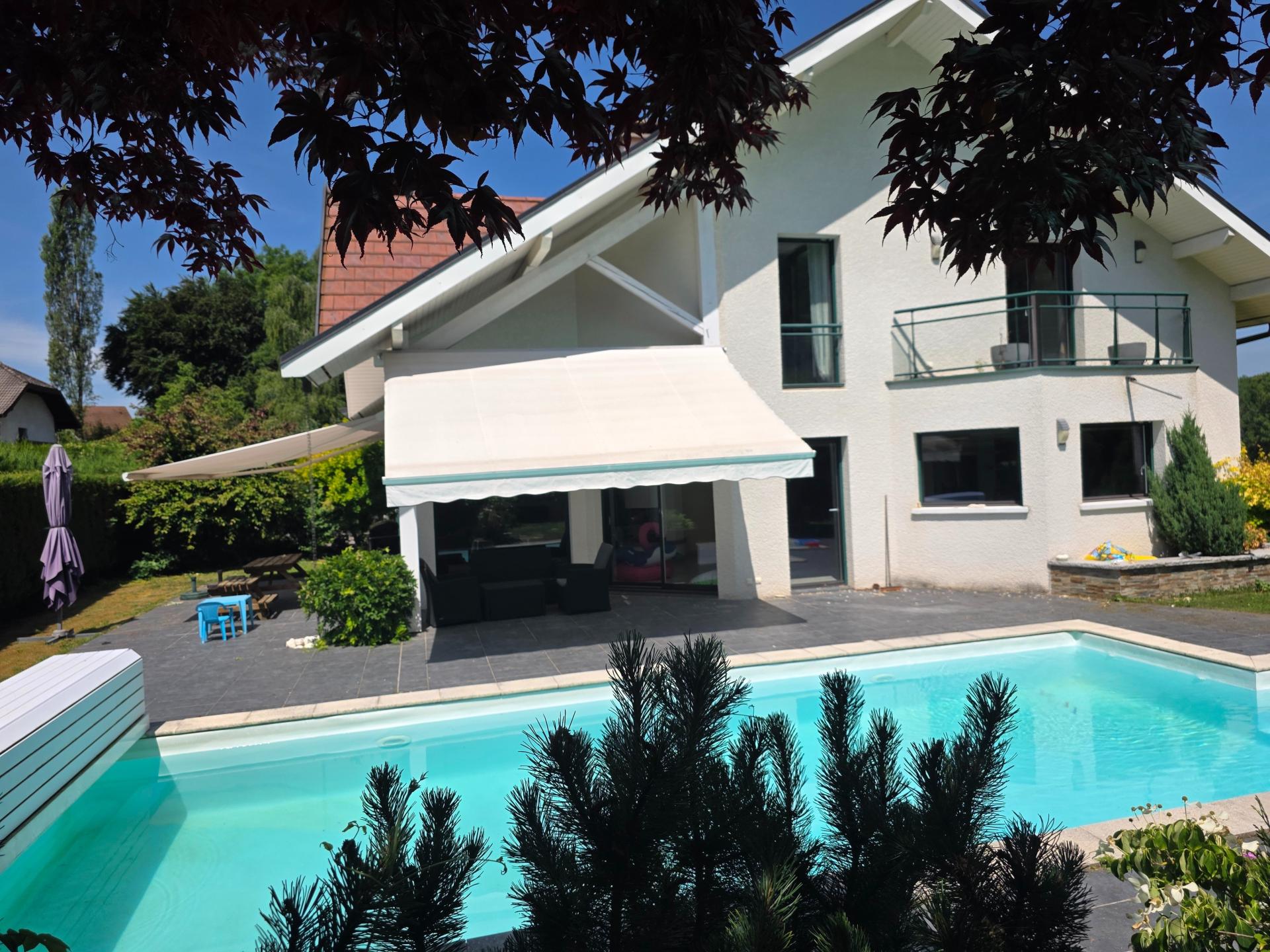 À seulement 10 minutes du lac d’Annecy et 30 minutes de Genève, cette élégante propriété se déploie au cœur d’un parc paysager de 3 100 m², entièrement arboré, offrant intimité, sérénité et une rare qualité de vie. La maison révèle dès l’entrée de généreux volumes baignés de lumière. La pièce de vie d’environ 60 m² accueille une cuisine contemporaine ouverte sur la salle à manger et un salon chaleureux doté d’un insert à granulés. Une mezzanine surplombe l’ensemble, idéale pour un bureau ou un espace media. Le rez-de-chaussée comprend également une chambre, une salle de douche et des toilettes. À l’étage, trois spacieuses chambres, une salle de bain et un WC indépendant composent l’espace nuit. Les prestations annexes renforcent son caractère exclusif : salle de sport, atelier, bureau indépendant, cave et vaste garage double. À l’extérieur, terrasses orientées Est–Sud–Ouest, cuisine d’été, espace potager et cabane de jardin. Terrain piscinable, fibre optique, chauffage central, adoucisseur et chauffe-eau thermodynamique complètent ce bien rare, conjuguant charme, confort et potentiel.