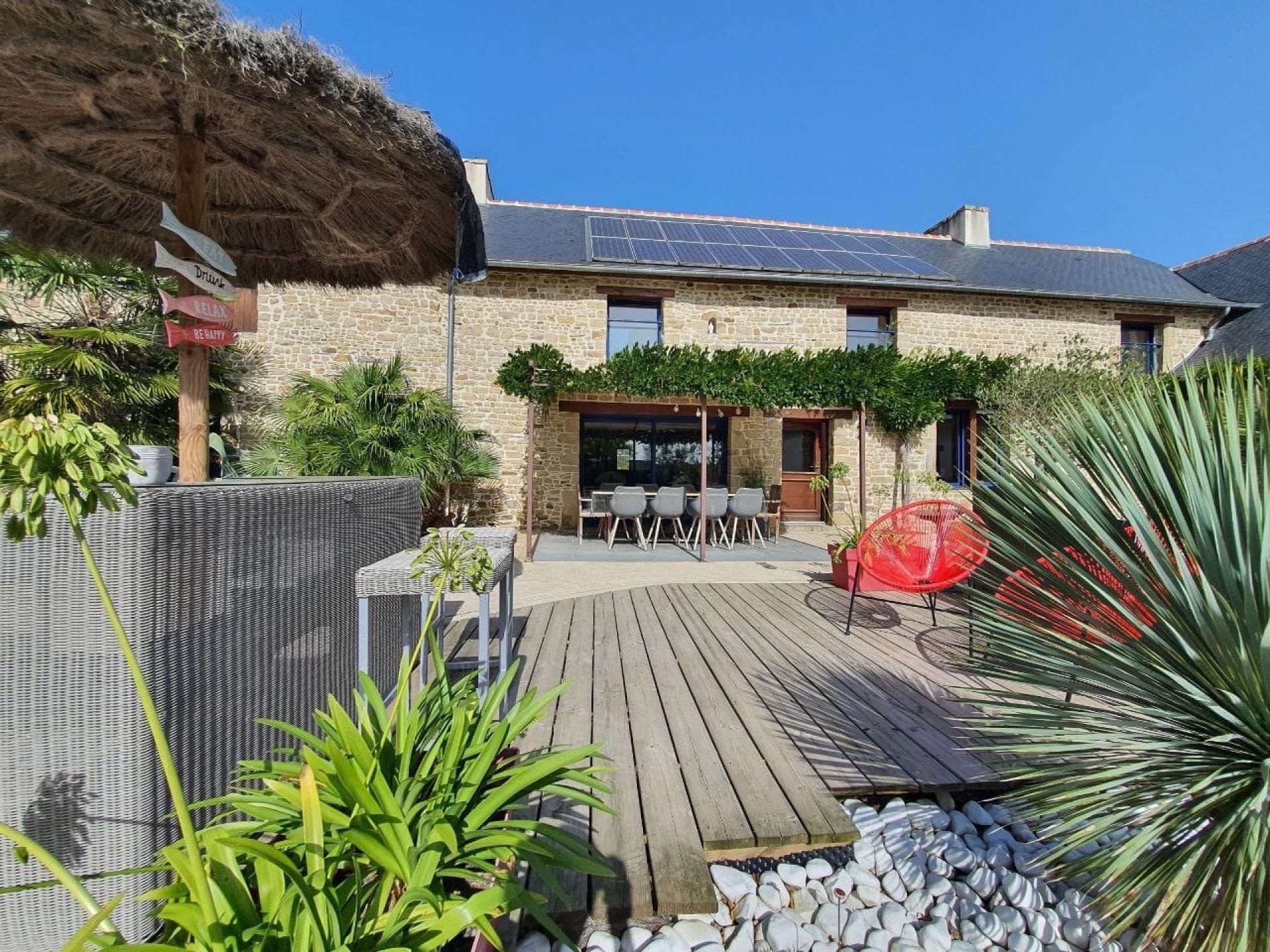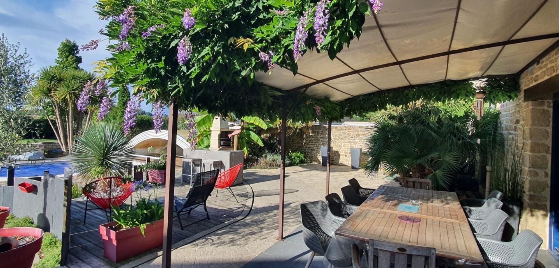 nichée à la campagne, à 3 mns des écoles et commerces de Bais ,à 25 minutes de l'entrée de Rennes et 15 minutes de Vitré, accès à la 2x2 voies Rennes/Laval/Paris en 8 mns . Vous aspirez à une vie saine ,au calme , cette maison est un havre de PAIX nichée au coeur d'un joli paysage de campagne à perte de vue.La propriété est entièrement clôturée , et s'ouvre sur un jardin joliment paysagé et aménagé de 2500 m2, belle piscine couverte donnant sur un vaste terrasse donnant sur une belle piscine couverte. Les aménagements paysagers et les plantes méditerranéennes florissantes ,donnent des airs de villa de vacances à cette belle demeure de caractère . L'entrée s'ouvre sur une vaste pièce de vie , les poutres en chêne et les belles pierres de tailles conservées ici et là témoignent de l'histoire de cette belle bâtisse. Une cuisine élégante et spacieuse de qualité promet de belles tablées familiale .Le salon est chaleureux grâce à la grande cheminée ,pièce maîtresse de cette belle pièce , belle luminosité , lumière traversante, la salle à manger. Suite parentale , chambre de 20m2 et sa vaste salle de bain . au rdc en sus: arrière-cuisine , buanderie, cave , et atelier. A L' ETAGE : L'escalier très élégant donne sur une mezzanine à usage de bureau ou espace loisir, quatre grandes chambres, deux dressings et un salon d'étage très" cocooning". Grenier aménageable. AU JARDIN: jolie serre en verre et potager vous donnerons envie de cultiver vos légumes. Un poulailler et un garage de plus 20m2 à l'arrière du terrain. 18 PANNEAUX SOLAIRES couvrant la consommation annuelle en électricité , toiture en parfait état, chauffage au sol partout, puits et réserve d'eau de pluie. Ce bien d'une qualité rare, offrira à votre famille de belles années de Joie et de partage. Au plaisir de vous le faire découvrir.
