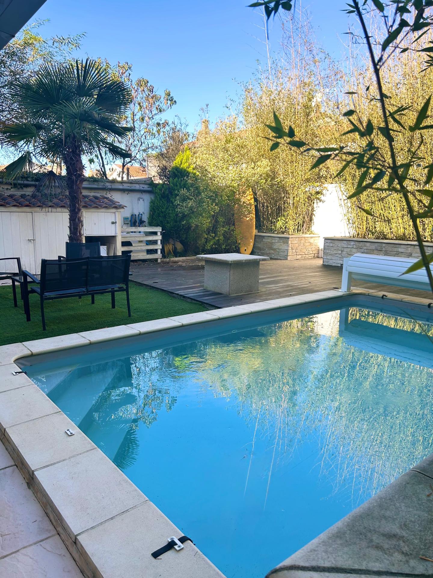 Située dans un secteur privilégié de Bègles, près du pont de la Maye, à proximité immédiate des ensembles scolaires, commerces, bus et tram, vous n'aurez plus qu'à poser vos valises dans cette agréable maison de 200m² environ, nichée sur une parcelle de 300m2. A l'extérieur, vous profiterez d'une agréable et spacieuse terrasse couverte donnant sur une piscine chauffée 5x3m. Côté intérieur, cette demeure vous offrira un vaste séjour/salle à manger (56m² environ) doté d'une belle cheminée. Sa grande cuisine (33m² environ) vous réservera des moments privilégiés en famille ou entre amis. Une entrée équipée de placards, un wc complètent le rez-de-chaussée. L'étage se décline en 4 chambres aux volumes agréables. La suite parentale de 31m² environ, se compose d'un espace nuit, d'une salle d'eau avec une douche à l'italienne et double-vasques, ainsi qu'un dressing. Une seconde salle d'eau, un bureau, un wc séparé, ainsi que l'espace mezzanine, complètent l'étage. Coup de cœur assuré!