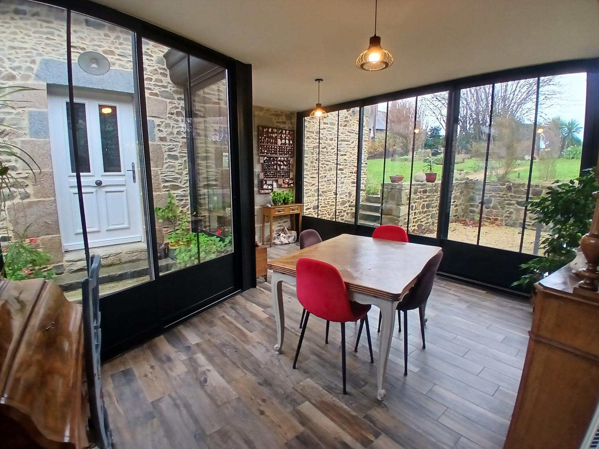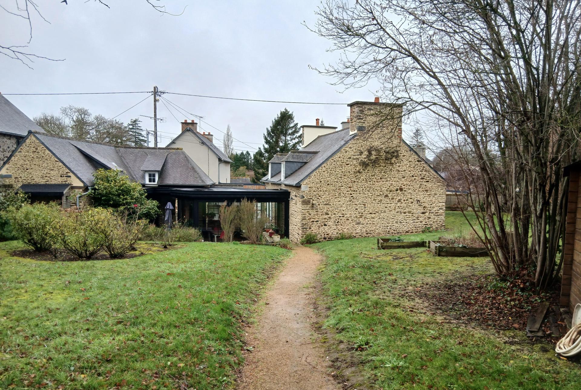 Maisons réunies par une belle véranda ouvrant sur le jardin paysagé