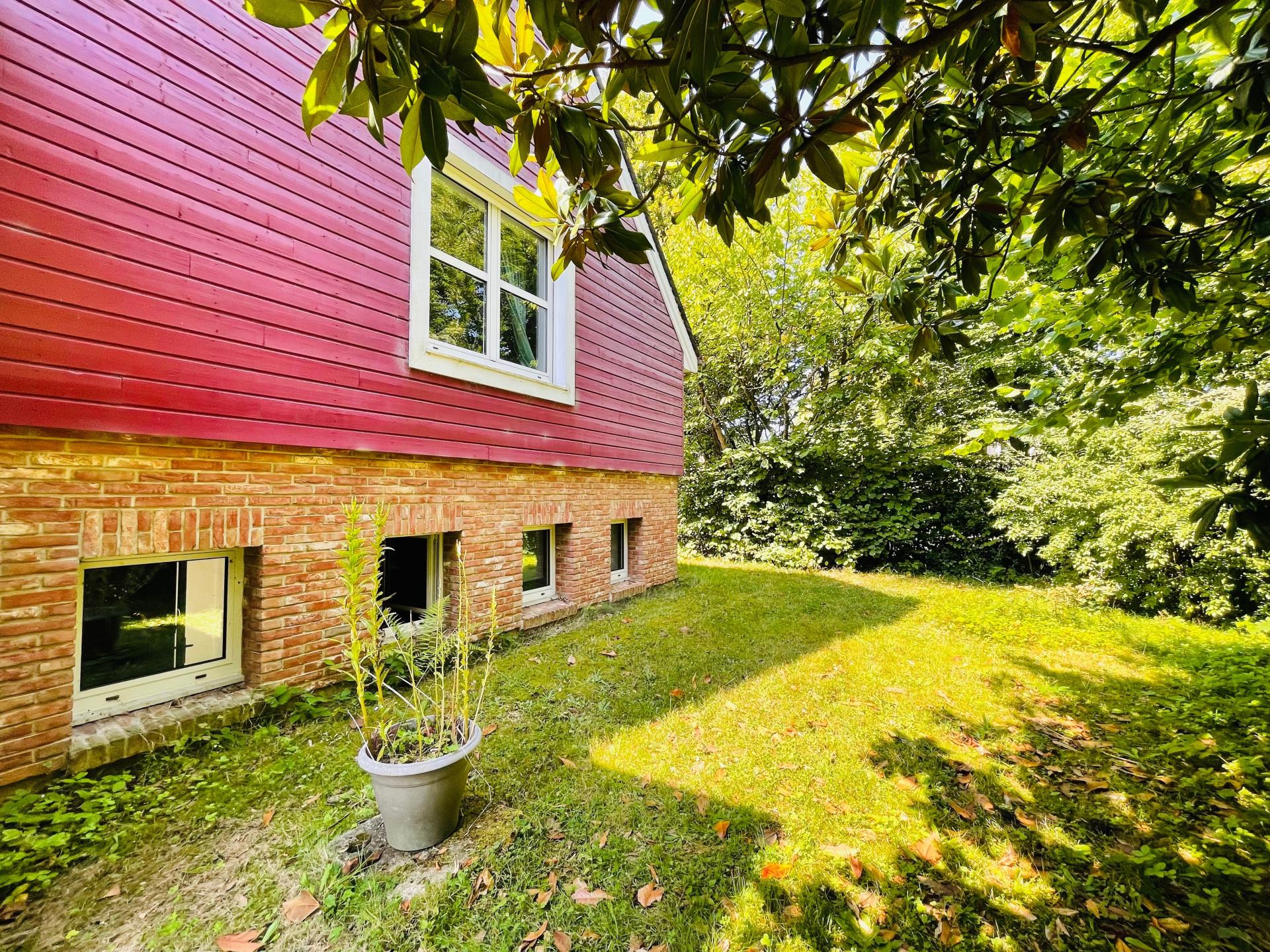 Quartier des Portes de la Forêt à Bois Guillaume, Nichée à l'abri des regards, au coeur d'un environnement paisible, cette maison d'architecte de 210 M2 développe un espace de vie lumineux et spacieux où toute la famille trouvera aisément sa place. Dés l'entrée la lumière s'impose, le hall d'accueil au plafond cathédrale nous conduit au vaste double séjour de 60 M2 baigné de lumière grâce à ses larges baies vitrées et s'ouvre sur la terrasse et le jardin paysager comme une invitation vers l'extérieur. Pour les soirées hivernales, Un magnifique poêle à granulés connectés diffuse une agréable chaleur douce. La cuisine ouverte, entièrement équipée, s'intègre parfaitement à la pièce de vie. En demi-étage, un palier dessert une chambre parentale d'environ 25 M2 avec sa grande salle de douche et son dressing, une seconde chambre équipée de sa propre salle de douche et un toilette séparé. A l'étage, un large palier pouvant accueillir un bureau ou une salle de jeux, dessert à son tour deux grandes chambres, un dressing, une salle de bain et un toilette séparé. Le demi-sous-sol offre une cinquième chambre ou bureau en souplex, très lumineux grâce à ses quatre fenêtres. Une buanderie, essentiel pour les familles et un immense garage pouvant contenir 2 deux voitures. La visite intérieure se termine au sous-sol avec un cellier et une belle cave à vin. A l'extérieur le Jardin richement fleuri et arboré d'essences d'arbres multiples se révèle être un véritable havre de paix sur 827 M2. Côté énergie, une pompe à chaleur assure le confort de toute la maison.