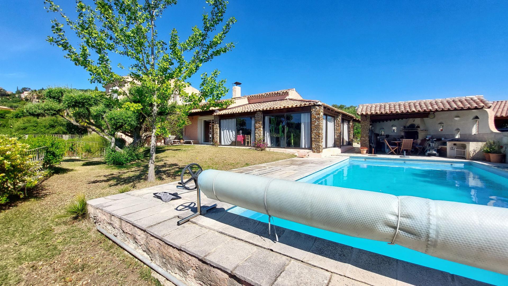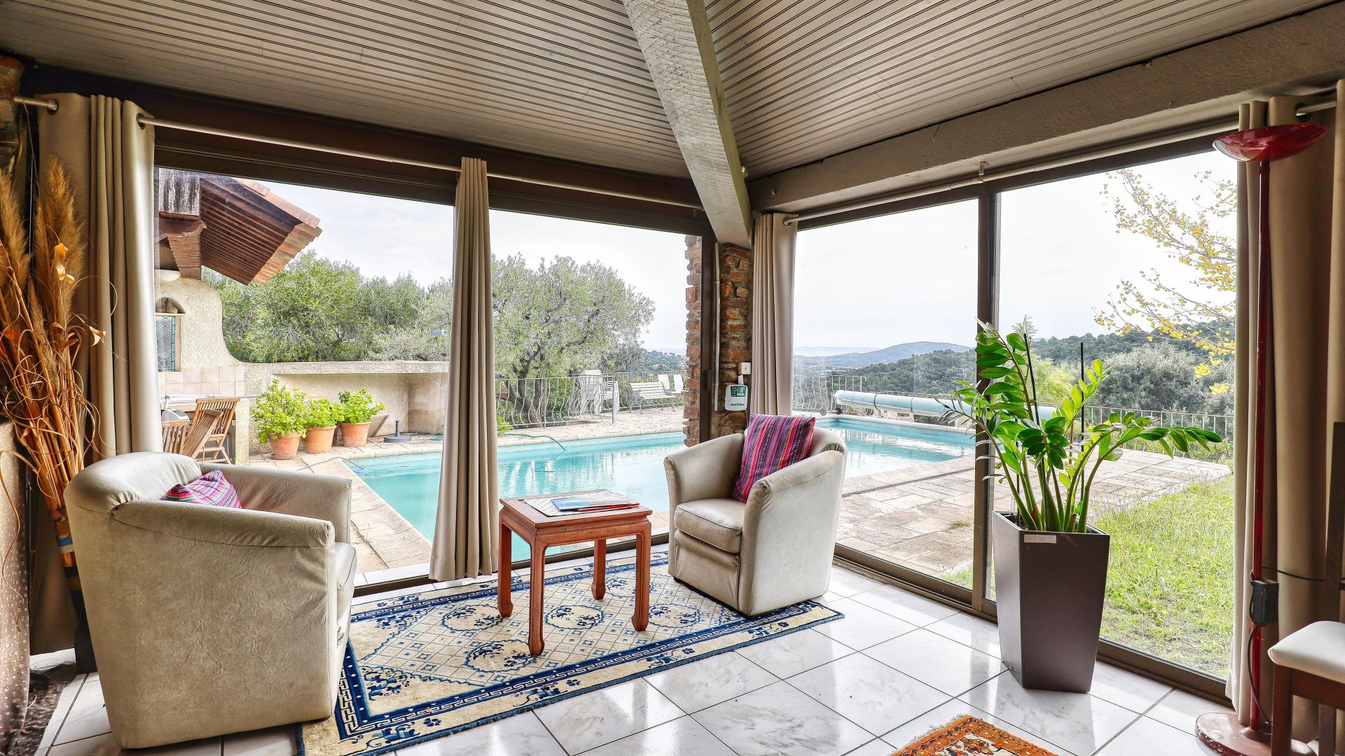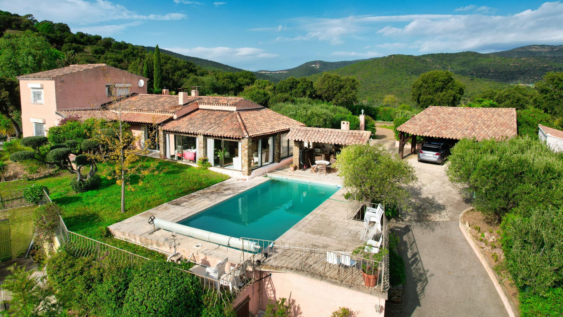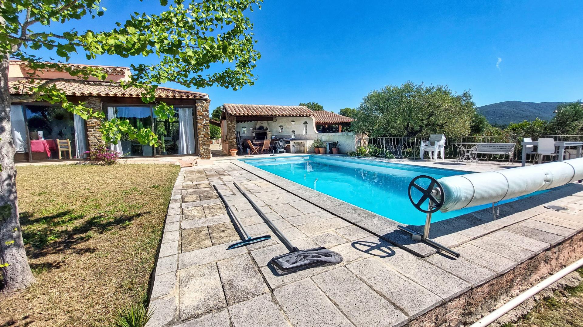 Sur les hauteurs de Bormes les Mimosas, charmante villa Provençale de 162 m2 habitable et studio indépendant de 20m2, bâtis sur un terrain de plus de 4000 m2, exposée Sud en position dominante. Elle comprend au RDC : cuisine équipée récente, salon-séjour triple avec espace bureau, master suite de 38 m2 avec 2 dressing, buanderie, chaufferie, espace détente couvert et chauffée de 34 m2 habitable autour d’une grande piscine de 45 m2, cuisine d’été et terrasses attenantes. A l'étage : palier, 2 chambres, salle d'eau . A l’extérieur : studio indépendant de 20 m2, annexe technique, atelier, abri 2 voitures (carport) et stationnement de nombreux véhicules, puits de forage, arrosage automatique, autres dépendances. Dans un cadre verdoyant à l’abri des regards, la propriété offre une vue dégagée panoramique sur mer et collines avoisinantes, un magnifique jardin parfaitement entretenu et une quarantaine d’oliviers producteur d’olives. Coup de cœur assuré. A visiter sans tarder ...