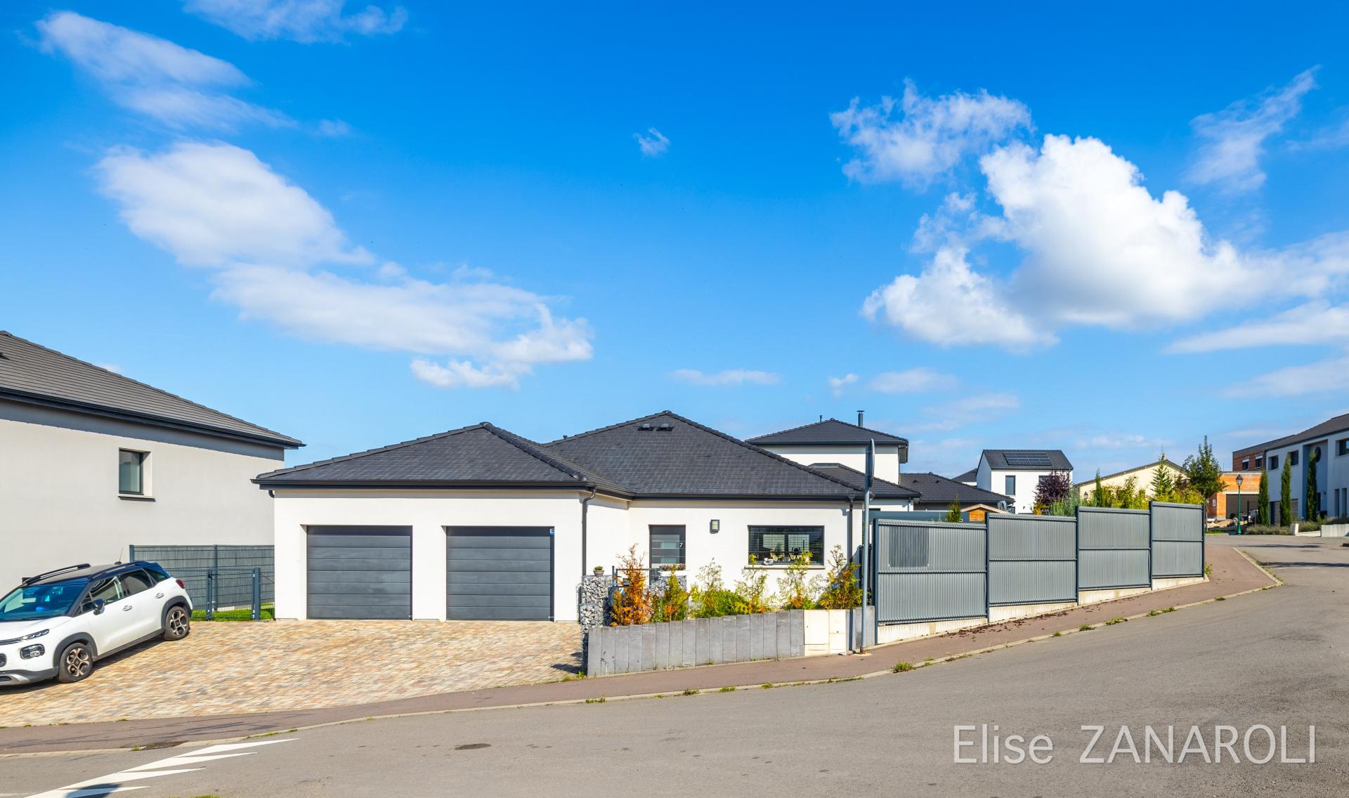 En exclusivité à Breistroff-la-Grande, charmant village situé à seulement 7 km de la frontière luxembourgeoise (Frisange / Mondorff), Élodie FRANK vous propose cette magnifique maison individuelle de 177 m², construite en 2011 et édifiée sur une parcelle de 7,55 ares. Au rez-de-chaussée, l’entrée cathédrale dessert une agréable pièce de vie de plus de 50 m², avec cheminée, offrant un accès direct au jardin. Cet espace est ouvert sur une cuisine équipée, prolongée par un cellier. Ce niveau comprend également un bureau, des rangements ainsi que des WC séparés. À l’étage, l’espace nuit se compose de quatre chambres, dont une suite parentale avec salle d’eau et dressing, ainsi qu’une salle de bains équipée d’une baignoire et de WC. Le garage, permettant le stationnement de deux véhicules en enfilade, communique directement avec le cellier. Un grenier y a été aménagé afin d’optimiser les espaces de stockage. Il est également possible de stationner des véhicules dans la cour. À l’extérieur, le jardin entièrement clôturé dispose d’une terrasse, d’une pergola et d’un abri de jardin, permettant de profiter pleinement de la nature environnante. Cette maison fonctionnelle offre un cadre de vie agréable et vous séduira par ses volumes généreux et ses nombreuses ouvertures, laissant entrer une belle luminosité. Vidéo disponible sur demande après premier contact téléphonique.