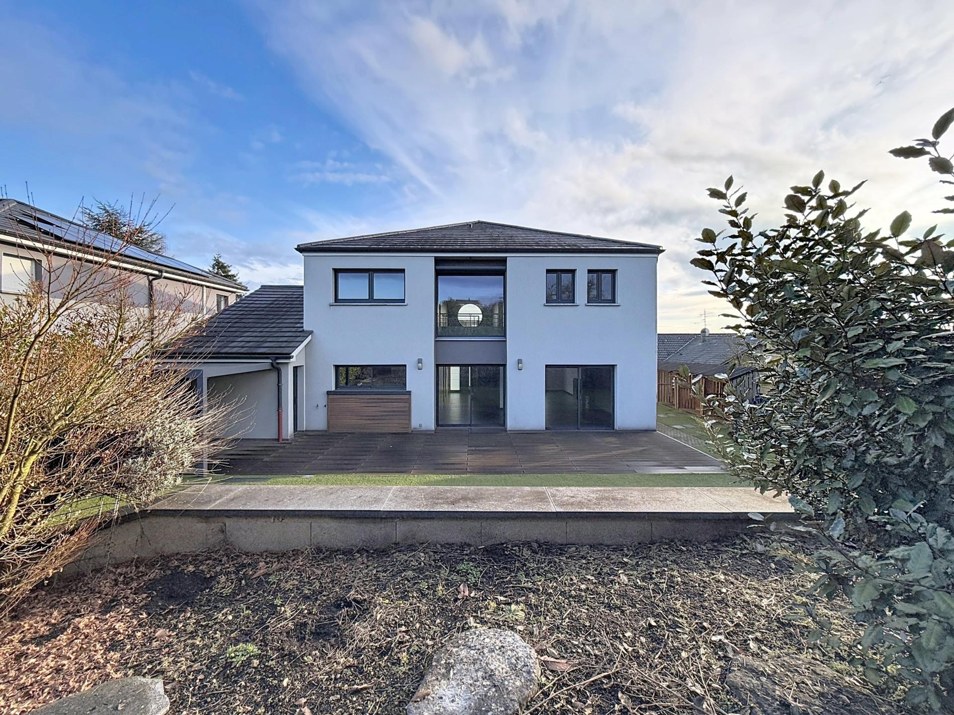 En exclusivité à Breistroff-la-Grande, charmant village situé à seulement 7 km de la frontière luxembourgeoise (Frisange / Mondorff), Élodie FRANK vous propose cette magnifique maison individuelle de 177 m², construite en 2011 et édifiée sur une parcelle de 7,55 ares. Cette maison fonctionnelle offre un cadre de vie idyllique et vous séduira par ses volumes généreux et ses nombreuses ouvertures, laissant entrer une belle luminosité. Au rez-de-chaussée, l’entrée cathédrale dessert une agréable pièce de vie de plus de 50 m², avec cheminée, offrant un accès direct au jardin. Cet espace est ouvert sur une cuisine équipée, prolongée par un cellier. Ce niveau comprend également une chambre ou un bureau, des rangements ainsi que des WC séparés. À l’étage, l’espace nuit se compose de quatre chambres, dont une suite parentale avec salle d’eau et dressing, ainsi qu’une salle de bains équipée d’une baignoire et de WC. Le garage, permettant le stationnement de deux véhicules en enfilade, communique directement avec le cellier. Un grenier y a été aménagé afin d’optimiser les espaces de stockage. Il est également possible de stationner des véhicules dans la cour. À l’extérieur, vous trouverez un très beau jardin entièrement clôturé ainsi qu'une terrasse, une pergola et un abri de jardin, permettant de profiter pleinement de la nature environnante. Vidéo disponible sur demande après premier contact téléphonique.
