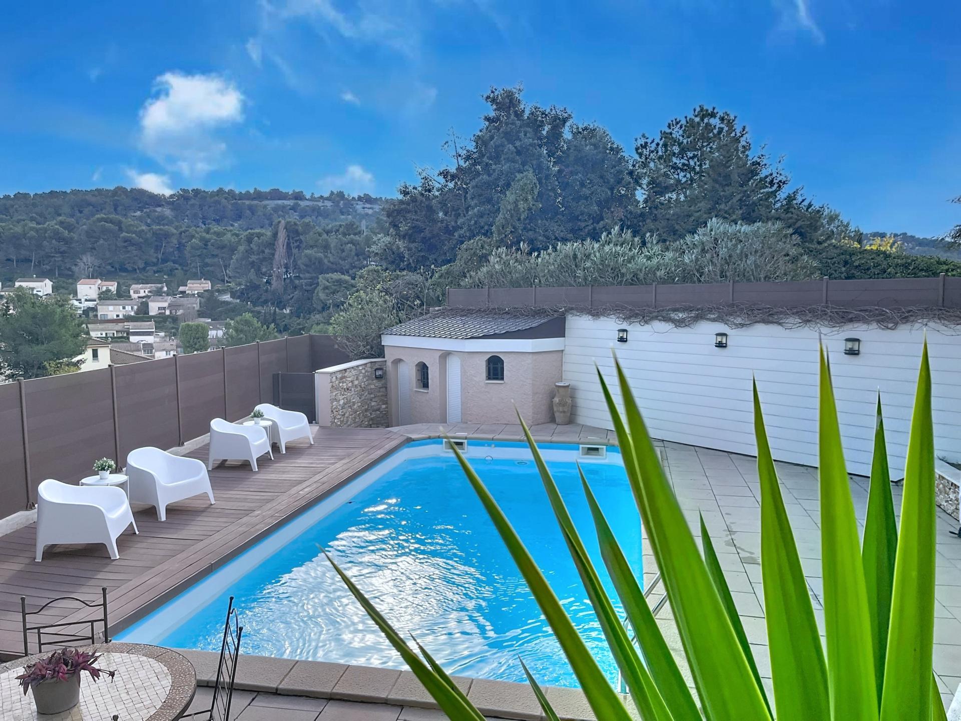 Située à Carnoux-en-Provence à deux pas des calanques de cassis, cette maison offre un cadre de vie paisible , tout en restant proche des commodités telles que les transports en commun, les divers axes routiers,les écoles, et les commerces. Bénéficiant d'une exposition sud et d'une vue dégagée, ce bien offre un environnement très agréable. Avec un terrain de 411 m² , cette maison de 127 m² dispose de deux belles terrasses paysagées, dont une avec piscine et cuisine d'été à aménager . De beaux moments de convivialité vous y attendent pour l'été prochain. À l'intérieur, la maison sur deux niveaux comprend en rdc un hall d'entrée pourvu d'un dressing, un double salon - salle à manger lumineux grâce aux larges baies vitrées et bénéficiant d'une belle hauteur sous plafond , une grande cuisine déjeunatoire semi-ouverte entièrement équipée avec son espace buanderie/cellier et son bureau attenant, ainsi qu'un WC. A l'étage trois chambres à l'esprit cocooning,un dressing pour les fans de shopping,une salle d'eau avec une belle douche à l'italienne, et un WC; Aménagements faits avec goût et matériaux de qualité.Nombreux espaces de rangement; Un abri moto et deux places de stationnement avec borne de charge , ainsi qu'un cabanon de jardin complètent les aménagements extérieurs. Etude faite et acceptée pour positionner un garage.A visiter sans tarder.