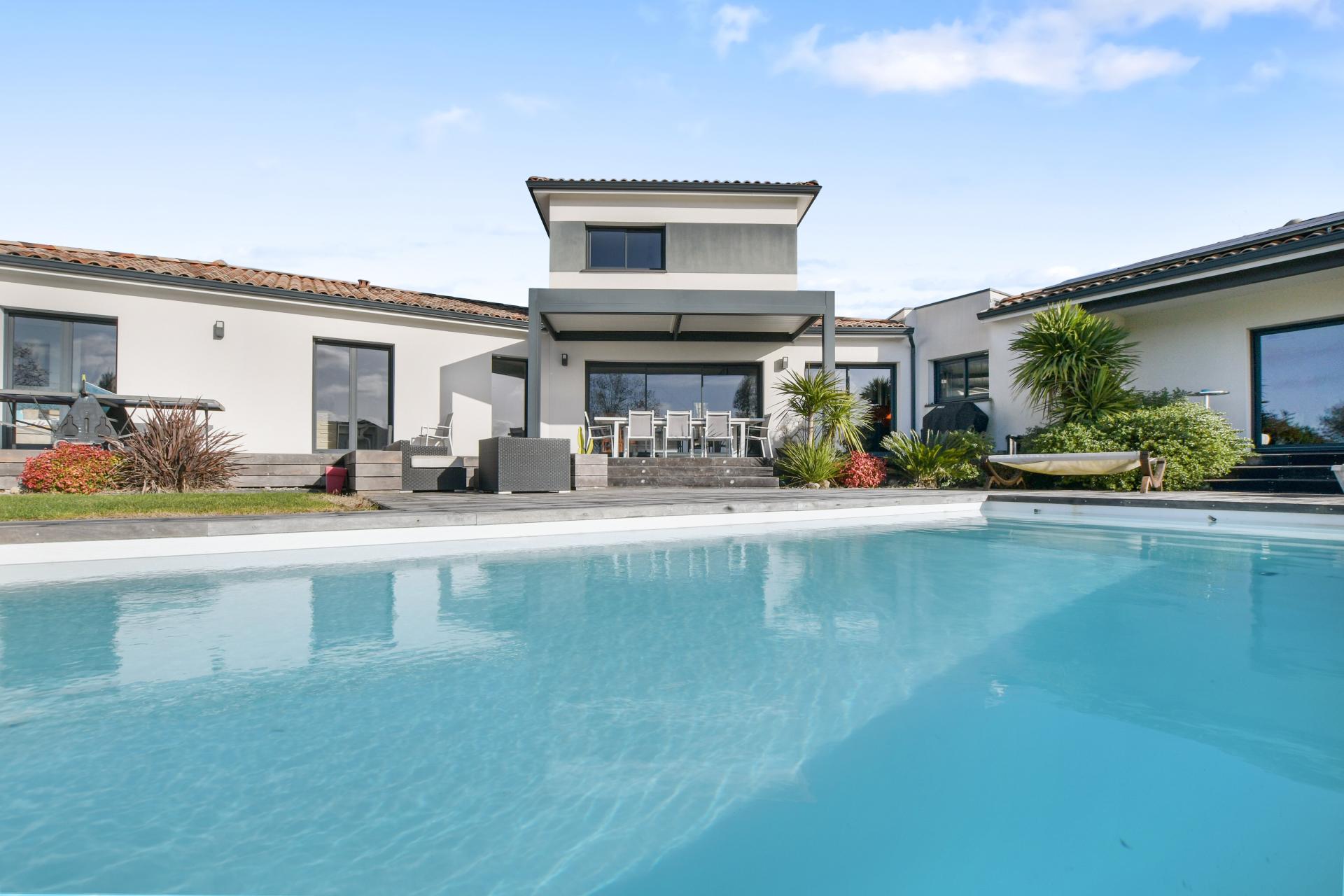 Belle contemporaine encore sous garantie décennale qui apporte tout ce dont une famille a besoin : piscine, boulodrome, aire de jeux enfants