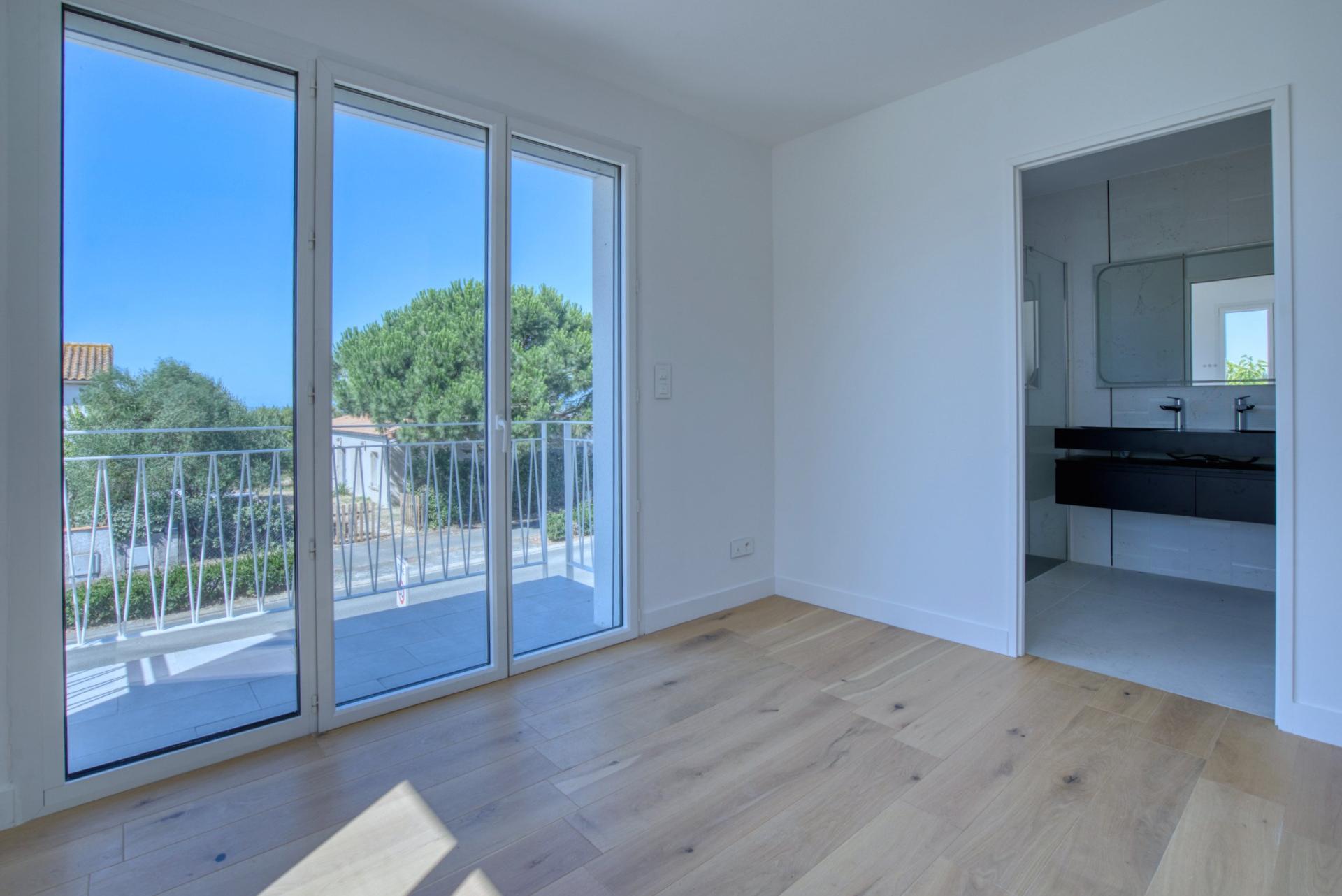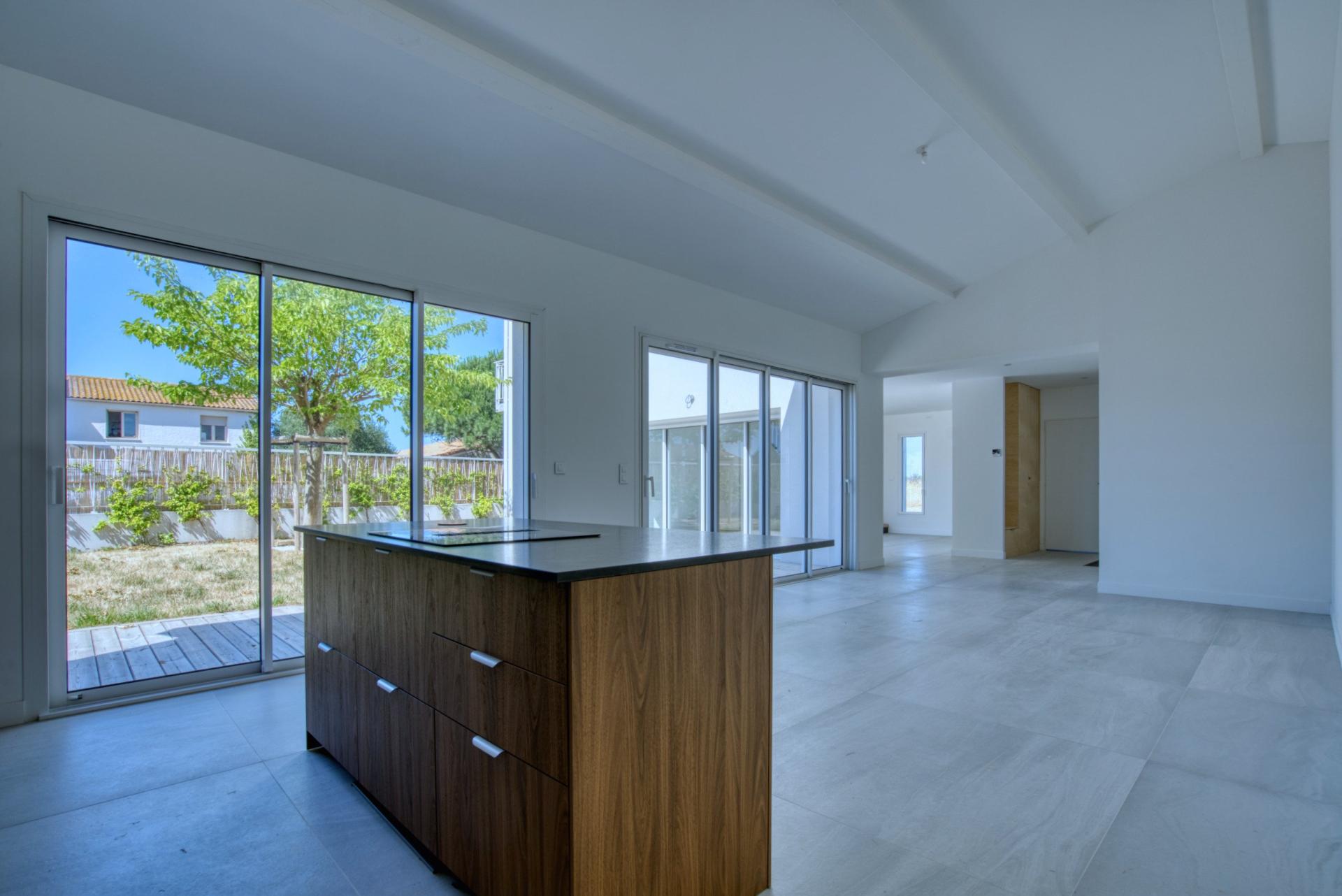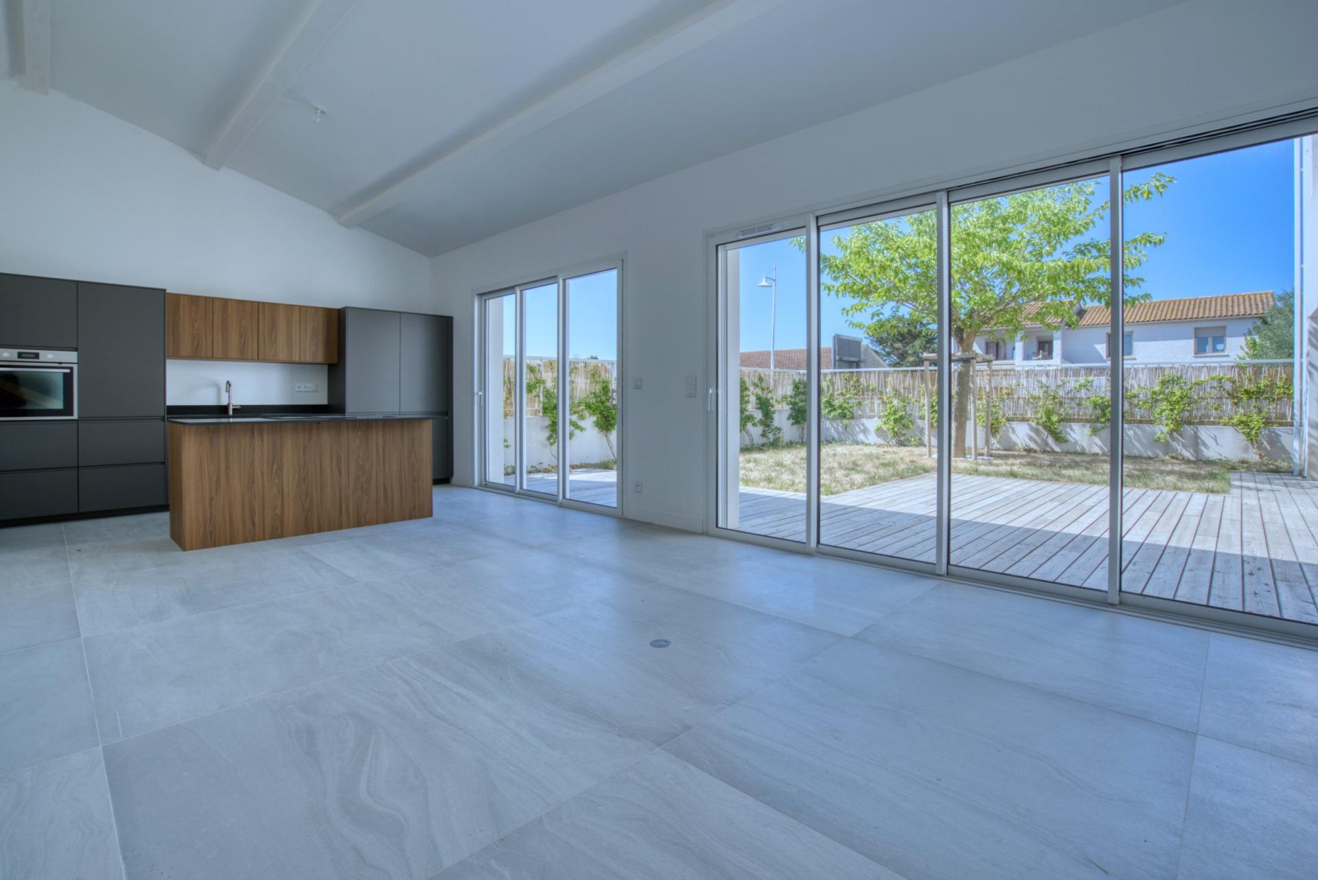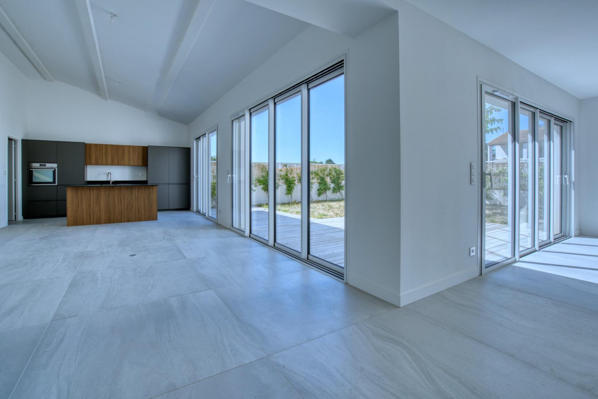 À Châtelaillon-Plage, à moins d’un kilomètre de la plage et à 3 minutes des commerces d’Angoulins, découvrez cette maison neuve de 154 m² habitables de 4 chambres dont 2 suites, jamais habitée, livrée clé en main. Vous profitez ici d’une maison prête à vivre, disponible immédiatement, avec l’avantage des frais de notaire réduits et sans taxe foncière pendant les premières années. Le rez-de-chaussée se compose d’une entrée avec placard, d’un WC séparé aux normes PMR, et d’un grand espace de vie traversant articulé en deux parties : salon et salle à manger. La cuisine ouverte, entièrement aménagée et équipée (hotte à aspiration centrale, four, frigo-congélateur, lave-vaisselle), est prolongée par un cellier-buanderie donnant accès à un garage carrelé et isolé. Toujours au rez-de-chaussée, une première suite parentale avec salle d’eau privative et accès direct au jardin. À l’étage, une seconde suite parentale avec dressing, salle d’eau et balcon vue mer, deux chambres supplémentaires, un WC indépendant avec lave-mains, et une salle de bain avec baignoire et douche. Un stationnement privé est prévu devant le garage. Chauffage par pompe à chaleur (DPE : A), carrelage au sol. Emplacement recherché, à proximité immédiate des transports, écoles et commerces. Gare de Châtelaillon à 3 minutes. Une maison neuve et disponible sans attendre, parfaitement située pour une résidence principale ou secondaire. À très vite pour une visite !