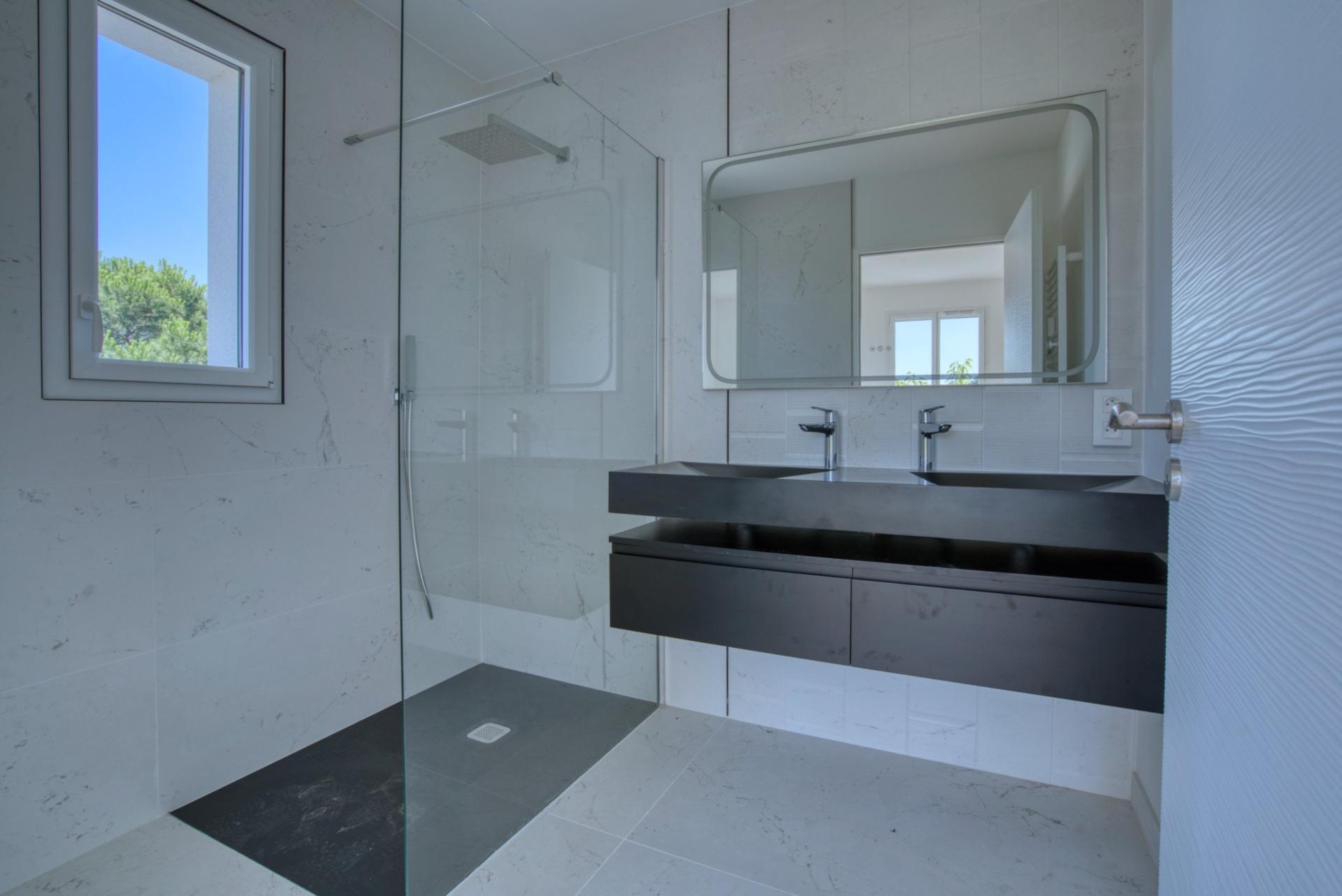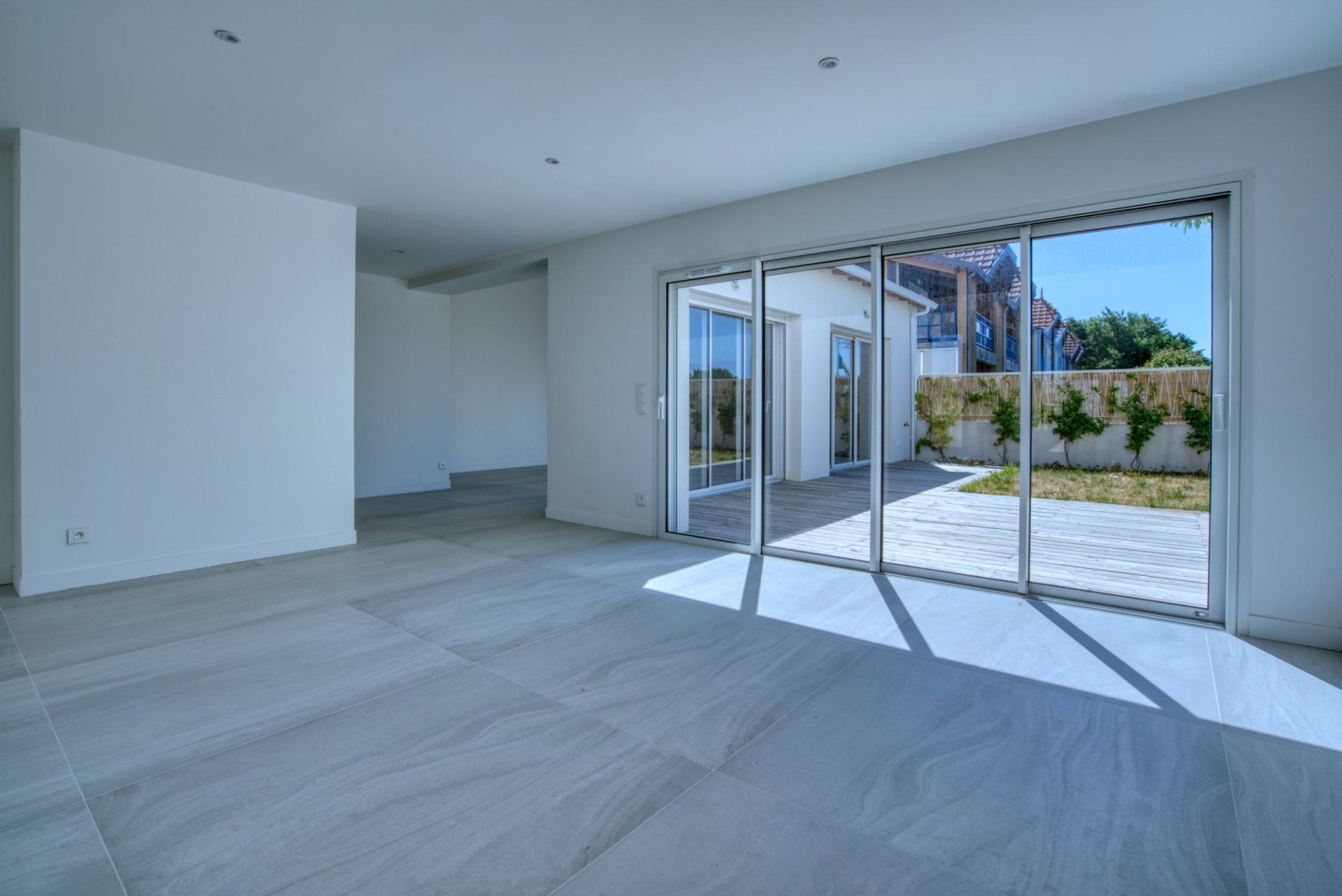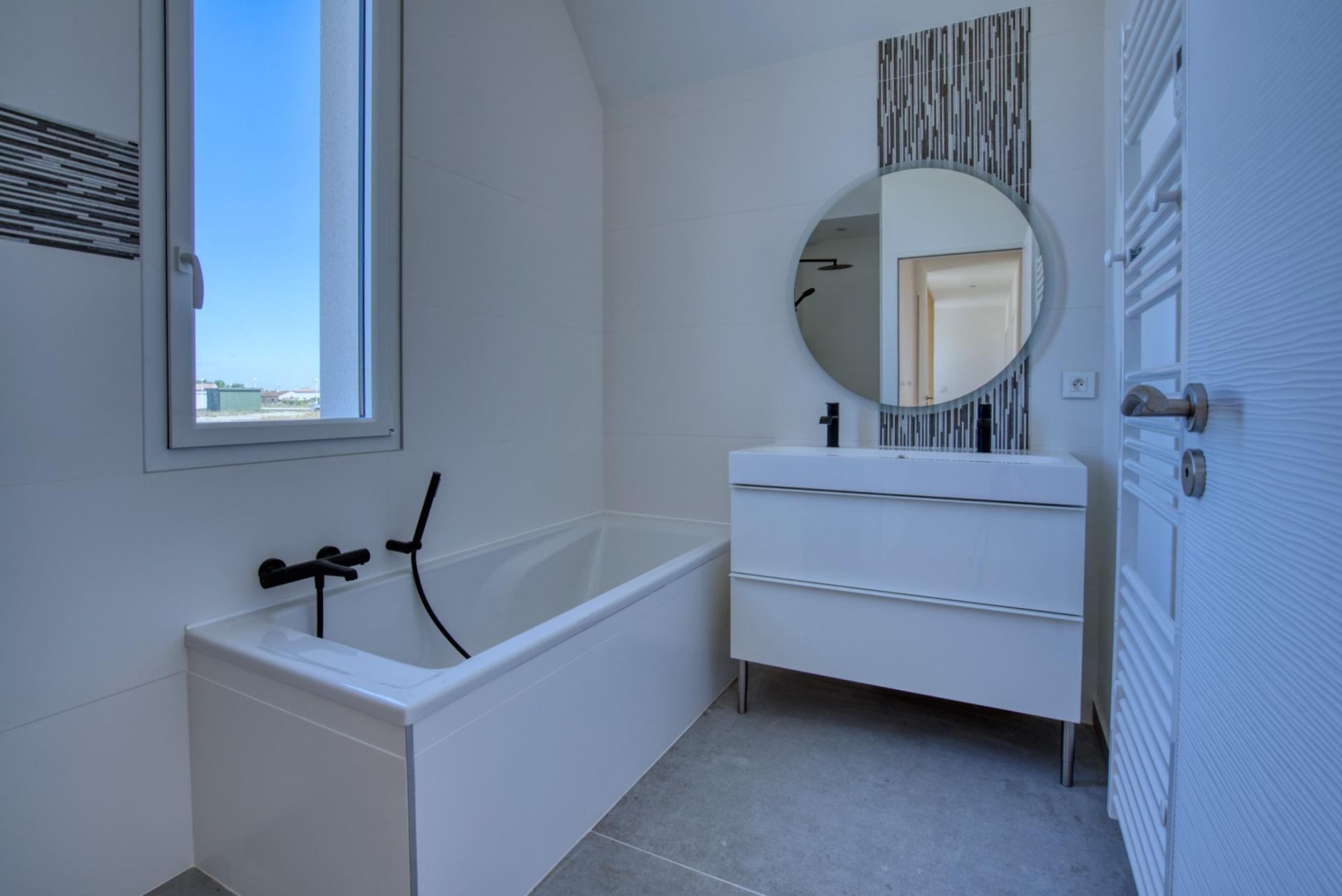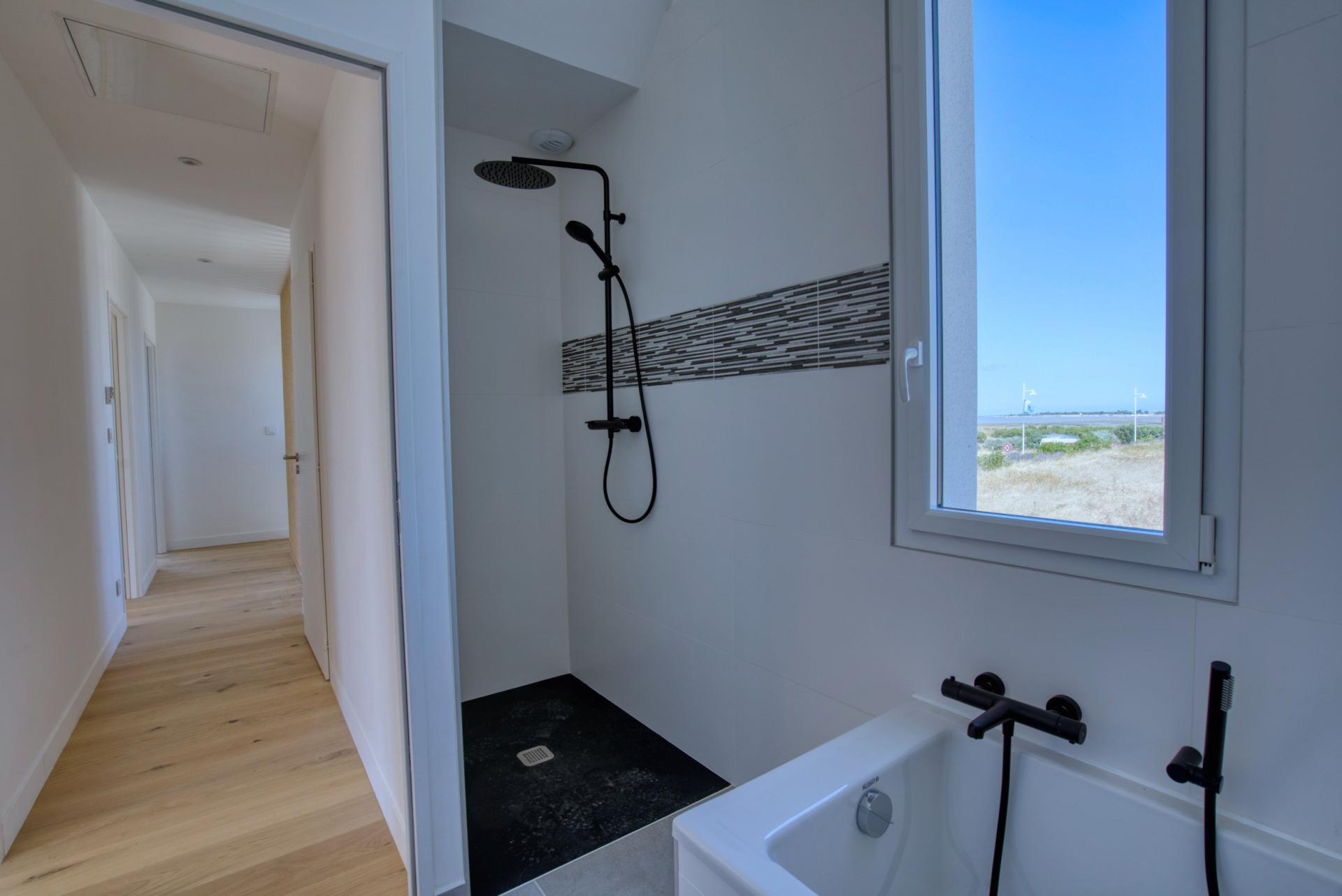 À Châtelaillon-Plage, à moins d’un kilomètre de la plage et à 3 minutes des commerces d’Angoulins, découvrez cette maison neuve de 154 m² habitables de 4 chambres dont 2 suites, jamais habitée, livrée clé en main. Vous profitez ici d’une maison prête à vivre, disponible immédiatement, avec l’avantage des frais de notaire réduits et sans taxe foncière pendant les premières années. Le rez-de-chaussée se compose d’une entrée avec placard, d’un WC séparé aux normes PMR, et d’un grand espace de vie traversant articulé en deux parties : salon et salle à manger. La cuisine ouverte, entièrement aménagée et équipée (hotte à aspiration centrale, four, frigo-congélateur, lave-vaisselle), est prolongée par un cellier-buanderie donnant accès à un garage carrelé et isolé. Toujours au rez-de-chaussée, une première suite parentale avec salle d’eau privative et accès direct au jardin. À l’étage, une seconde suite parentale avec dressing, salle d’eau et balcon vue mer, deux chambres supplémentaires, un WC indépendant avec lave-mains, et une salle de bain avec baignoire et douche. Un stationnement privé est prévu devant le garage. Chauffage par pompe à chaleur (DPE : A), carrelage au sol. Emplacement recherché, à proximité immédiate des transports, écoles et commerces. Gare de Châtelaillon à 3 minutes. Une maison neuve et disponible sans attendre, parfaitement située pour une résidence principale ou secondaire. À très vite pour une visite !