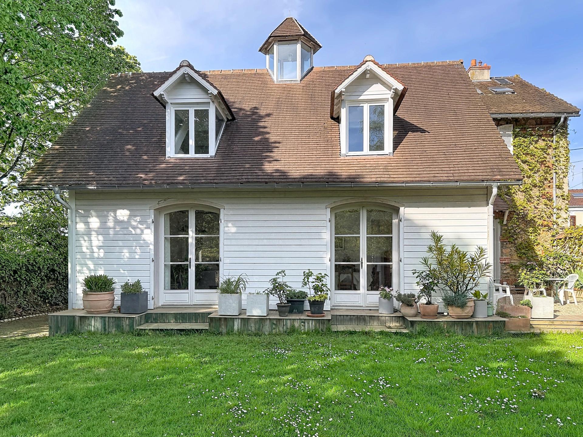 EXCLUSIVITE - CHATOU à 13 minutes à pied de la gare RER A, venez découvrir cette belle propriété de 192m² habitables implantée sur un terrain de 800m² plat, arboré, sans vis à vis et exposé SUD. La maison est constituée d'une partie ancienne (~1880) et une extension (2010). L'ensemble comporte de vastes espaces de vie avec un salon de 60m², une grande cuisine/salle à manger de 30m² donnant sur la TERRASSE, un bureau en mezzanine, une grande entrée avec rangement, wc et buanderie. Vous trouverez en étage: 3 CHAMBRES au 1er avec 2 salles d'eau, WC et une CHAMBRE parentale au 2ème étage avec dressing et salle de bain. Vous bénéficierez d'un SOUS-SOL TOTAL de 110m² comprenant atelier, bureau, grande pièce de rangement et possibilité d'aménager une surface de 55m² en salle de sport, salle de cinéma ou chambre/bureau (HSP2.60m) en créant un accès direct depuis le salon. Stationnement extérieur à l'avant et grand JARDIN plat et arboré au clame, sans vis à vis, exposé SUD. Vous serez charmés par le caractère de la maison dès son entrée, les volumes des pièces de vie, la luminosité, son extérieur paysagé et la proximité du centre-ville.