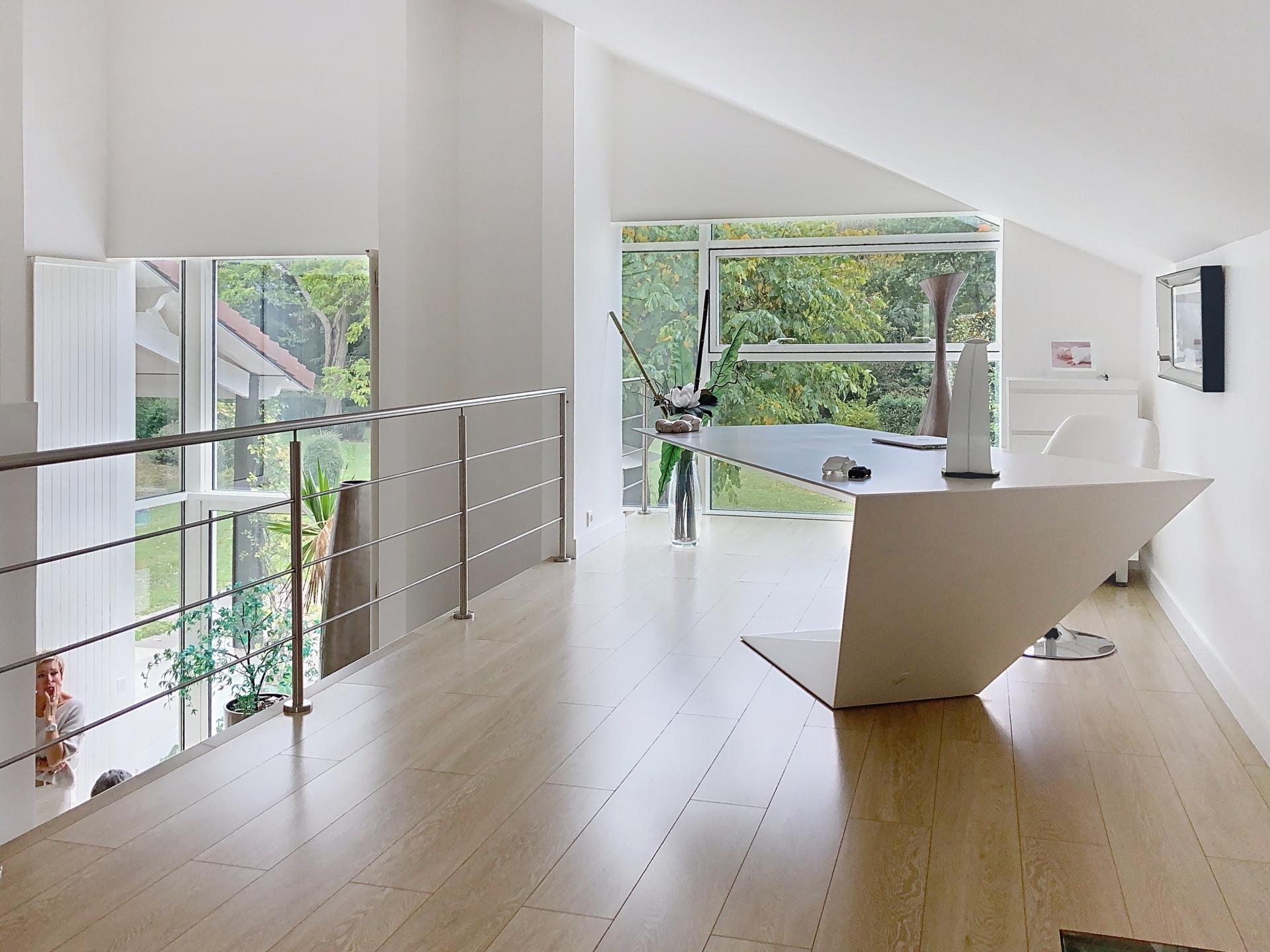 Amoureux de lumière, d’espace et de nature ? Cette maison d’architecte de 260 m² habitables entièrement rénovée avec des matériaux haut de gamme, vous séduira par son élégance contemporaine et ses volumes impressionnants. C'est ce qui marque à peine la porte poussée. Ses volumes. Sa luminosité. Ce qu’on aime : • Le triple séjour cathédrale de 75 m², baigné de lumière et ouvert sur le jardin et son plafond cathédrale incroyable de 8 mètres de hauteur • L’espace parental de 46 m² en rez-de-jardin avec cheminée, dressing et salle de bains balnéo • Une cuisine dernier cri pensée pour les moments en famille • Le jardin paysager avec sa piscine au sel chauffée de 6x12 et son potager clos • Le sous-sol total et garage de 150 m² : un vrai plus pour les familles actives • Le terrain partiellement constructible, idéal pour un projet annexe (100 m2+R1). ? Écoles réputées accessibles en bus : Blanche de Castille, Saint-Jean-Hulst, Lycée international de St-Germain-en-Laye. ? Accès rapide Paris La Défense/St-Lazare (30-45 min ligne L) Une maison pensée pour l’harmonie entre vie familiale, nature et confort moderne.