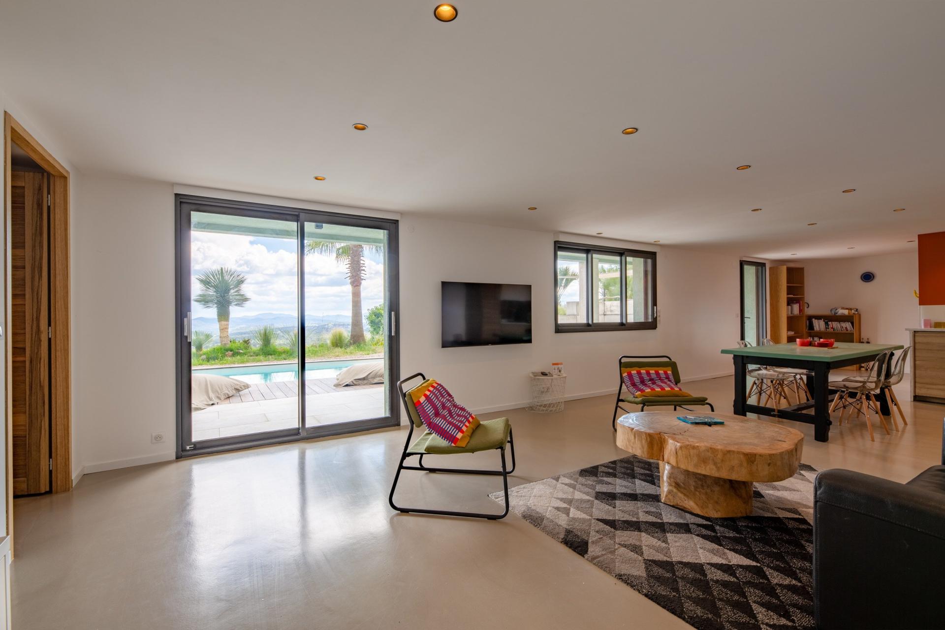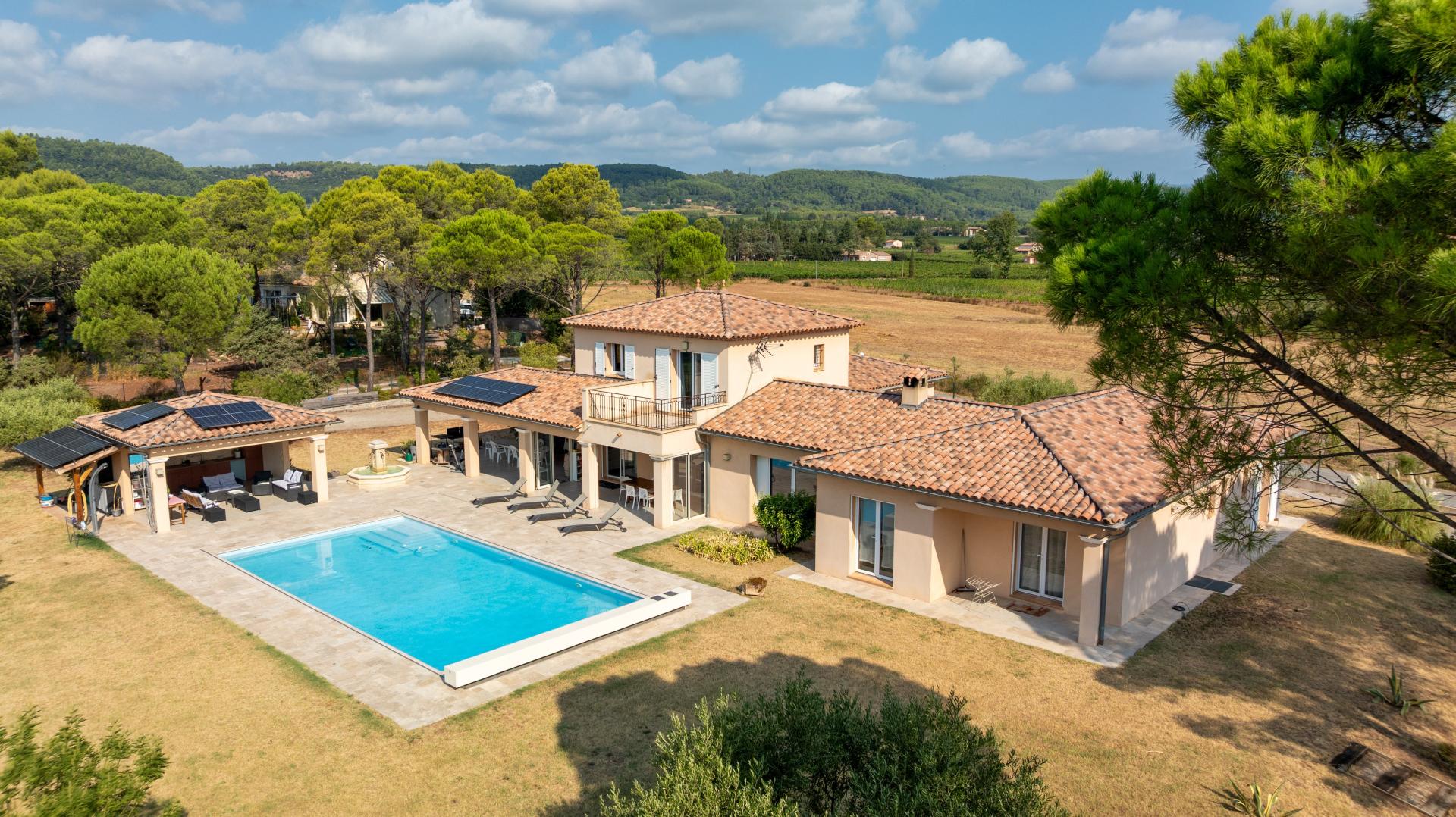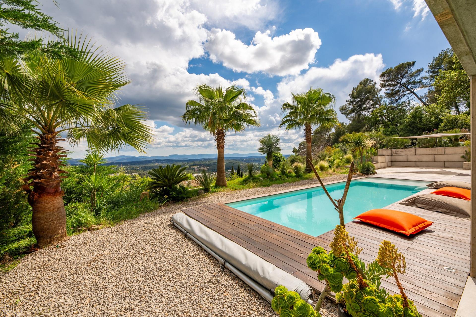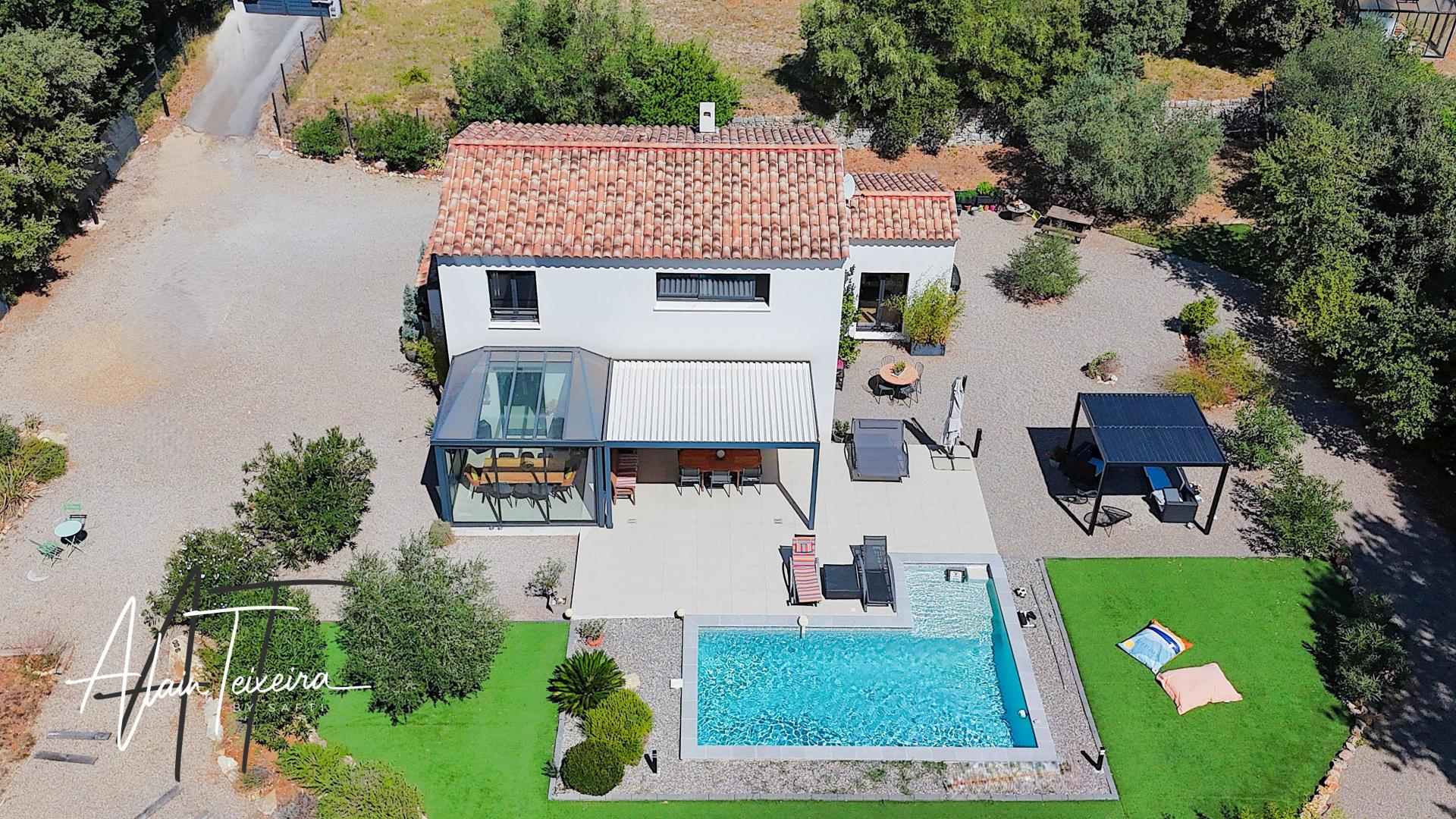 A vendre – Maison contemporaine avec vue panoramique à Draguignan Nichée au cœur d’un environnement préservé, cette magnifique maison contemporaine vous séduira par son architecture moderne, ses prestations haut de gamme et sa vue exceptionnelle à couper le souffle. Édifiée sur une vaste parcelle de 4000 m², sans aucun vis-à-vis, elle offre un cadre de vie rare et privilégié. Dès l’entrée, vous découvrirez une spacieuse pièce de vie baignée de lumière, avec de grandes ouvertures sur l’extérieur, un poêle à bois pour les soirées d’hiver, et une cuisine ouverte entièrement aménagée. Un cellier équipé complète cet espace de vie convivial. La partie nuit propose trois belles chambres, dont une suite parentale, conjuguant confort et intimité. Un espace rez-de-jardin accueille un grand appartement T2 indépendant, parfait pour une dépendance, de la location saisonnière ou un revenu complémentaire. Les extérieurs sont tout aussi remarquables : piscine d’un bleu turquoise merveilleux, terrasse panoramique, carport, et une salle d’eau indépendante avec espace bien-être et salle de sport. Climatisation, confort thermique, beaux volumes, prestations soignées… Cette propriété est une invitation à la détente dans un cadre d’exception. Un bien rare à Draguignan, alliant élégance, sérénité et potentiel. Contactez-nous pour une visite privée.