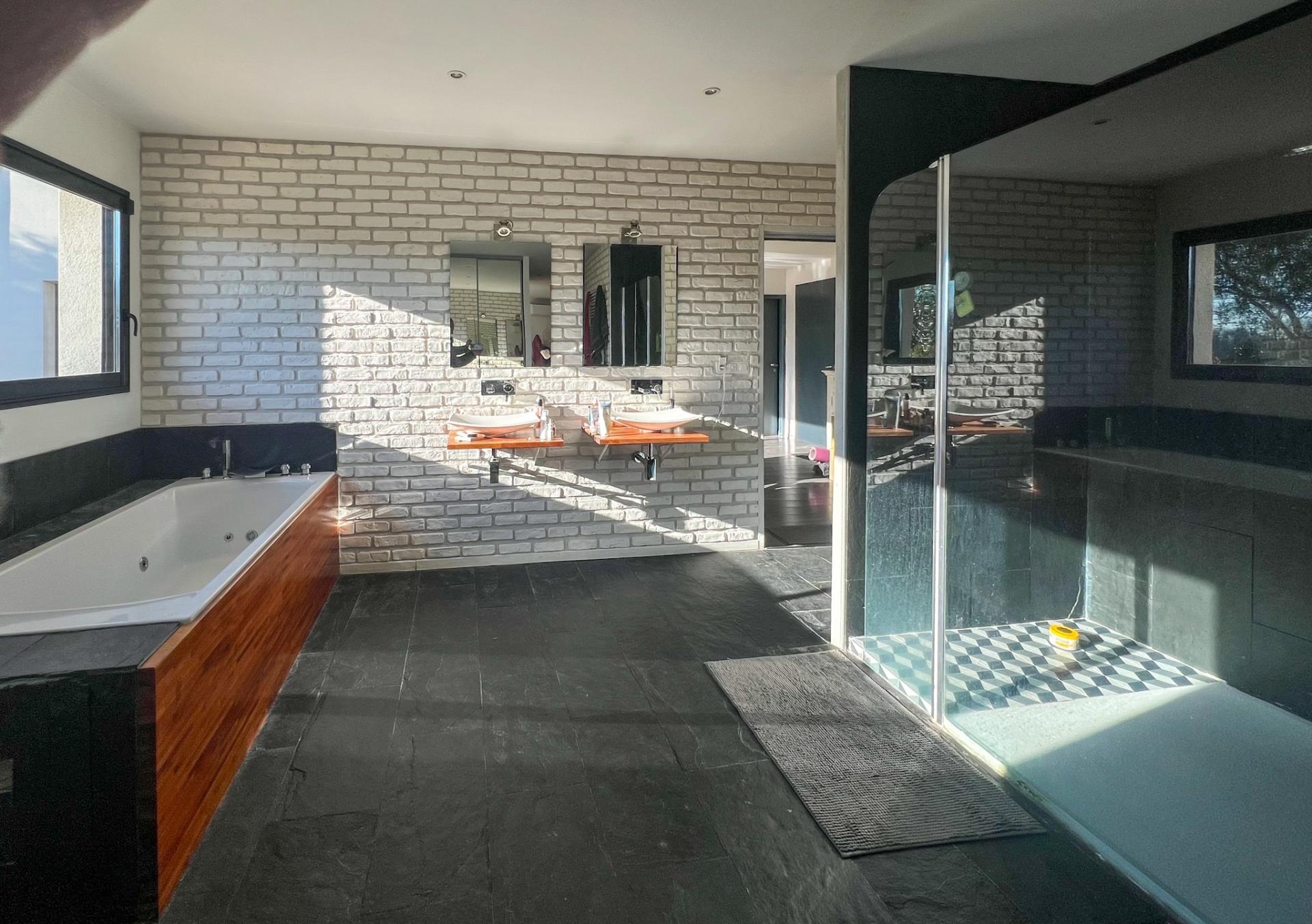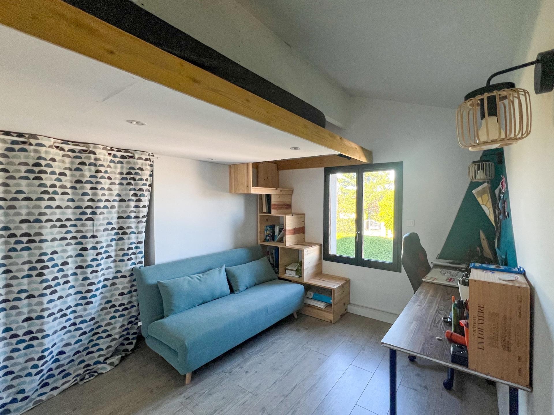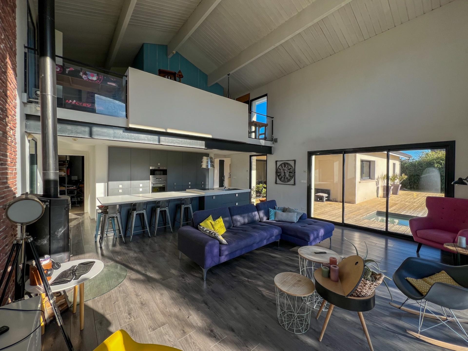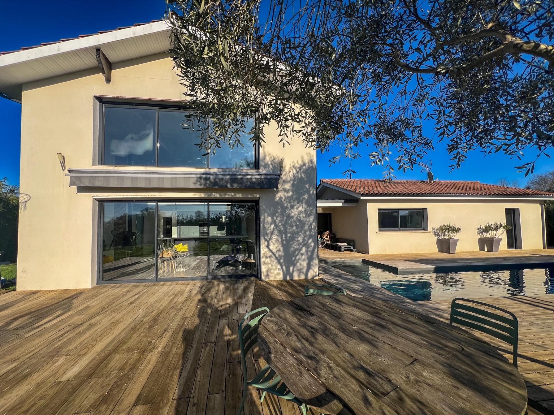 LIGNAN-DE-BORDEAUX (33360) Nicolas MADRELLE - SAFTI vous présente une maison d’exception avec vue dégagée et belles prestations. Dans un environnement paisible et sans aucun vis-à-vis, découvrez cette maison contemporaine de 170 m² sur un terrain paysagé de 1900 m² avec piscine chauffée 10x3, terrasse bois de 120 m², pool house équipé et dépendance bois isolée d'environ 60 m². À l’intérieur de la maison vous découvrirez un RDC conçu en deux parties avec entrée, WC, patio donnant sur une terrasse intimiste et piscine avec, d' un côté une lumineuse pièce de vie de 50 m2 et plafond cathédrale à 6 m, comprenant une cuisine équipée avec îlot central pouvant accueillir 10 convives, 1 chambre, WC, cellier, buanderie et double garage attenant de 35 m2 et, de l'autre côté, 1 suite parentale avec salle de bain (baignoire, douche et WC), dressing et chambre donnant accès à la piscine. A l'étage, 2 chambres, SDE, WC indépendant et vaste mezzanine qui vous permettra d'aménager un bureau ou une salle de jeux. Le confort est assuré par un plancher chauffant, un poêle à bois et la climatisation réversible dans chaque chambre. Un bien rare alliant volumes, modernité et cadre naturel préservé, tout en étant proche des commodités, école primaire à 800 m, arrêt de bus desservant collège et lycée à 50 m, accès par bus direct vers le tramway Bordeaux centre et Gare St-Jean en 20 min, œnotourisme Saint-Emilion à 30 min.