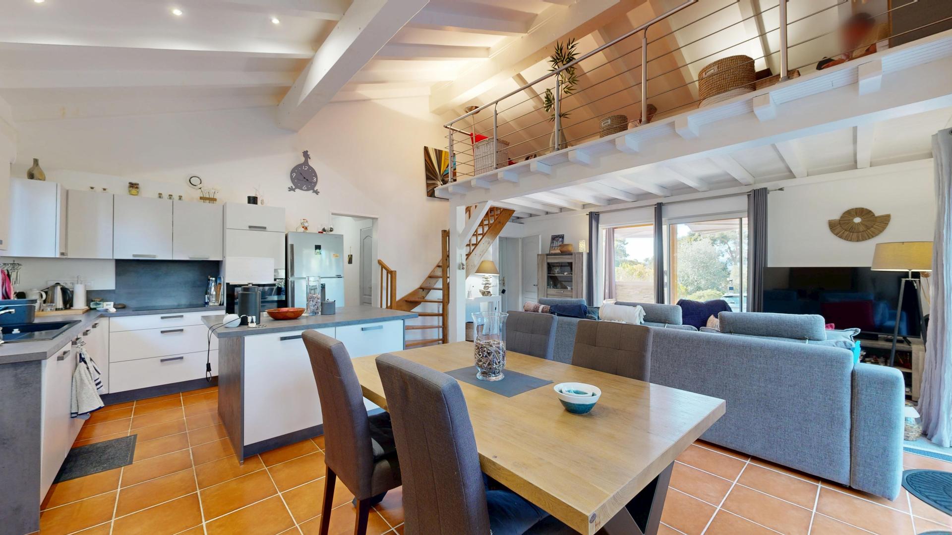 À Figari, découvrez cet ensemble immobilier composé de deux maisons offrant de nombreuses possibilités. La première maison, un T4 de 137 m², comprend un vaste salon avec cuisine ouverte, un cellier-buanderie, trois chambres dont deux à l’étage, chacune avec sa salle d’eau. Une mezzanine de 14 m² et deux terrasses, dont une en partie couverte type véranda, complètent l’ensemble. La seconde maison, un T3 indépendant de 43m2, dispose d’un salon avec cuisine ouverte, de deux chambres, d’une salle d’eau et d’une terrasse couverte. L’ensemble, très bien entretenu, est bâti sur une parcelle arborée de 1560 m² avec portail électrique. Idéal pour une grande famille ou pour un projet locatif : les deux chambres à l’étage disposent d'une d’entrée indépendante, parfaites pour une activité de chambres d’hôtes, en plus de la maison T3 autonome. Visite virtuelle 3D disponible pour ce bien