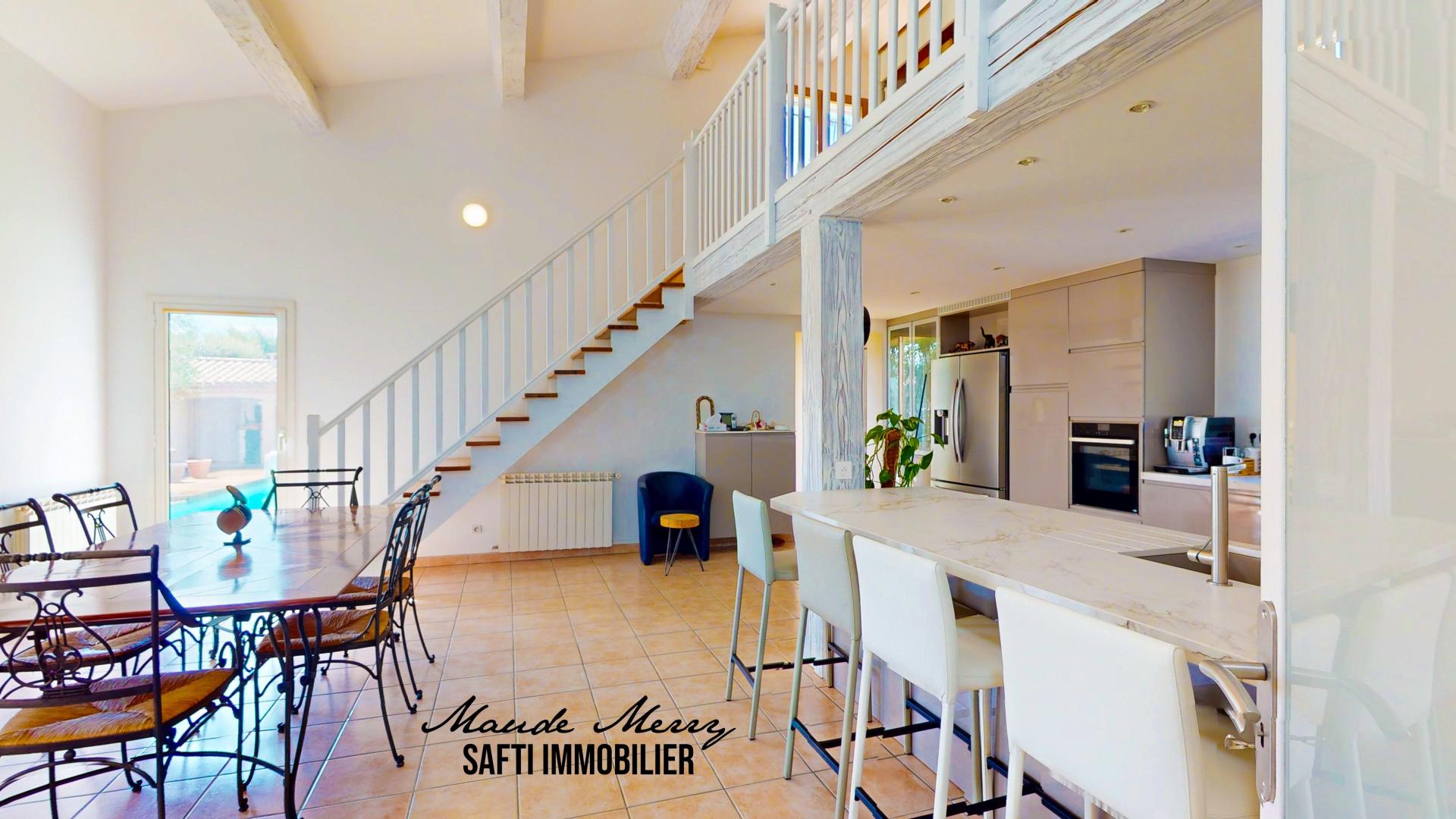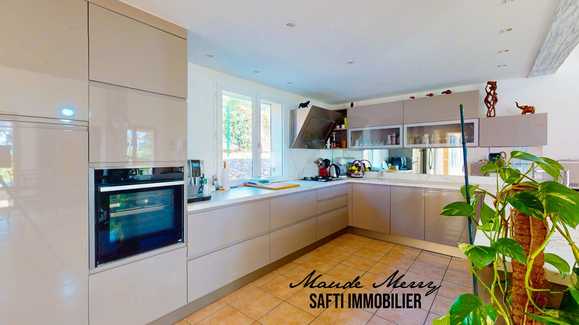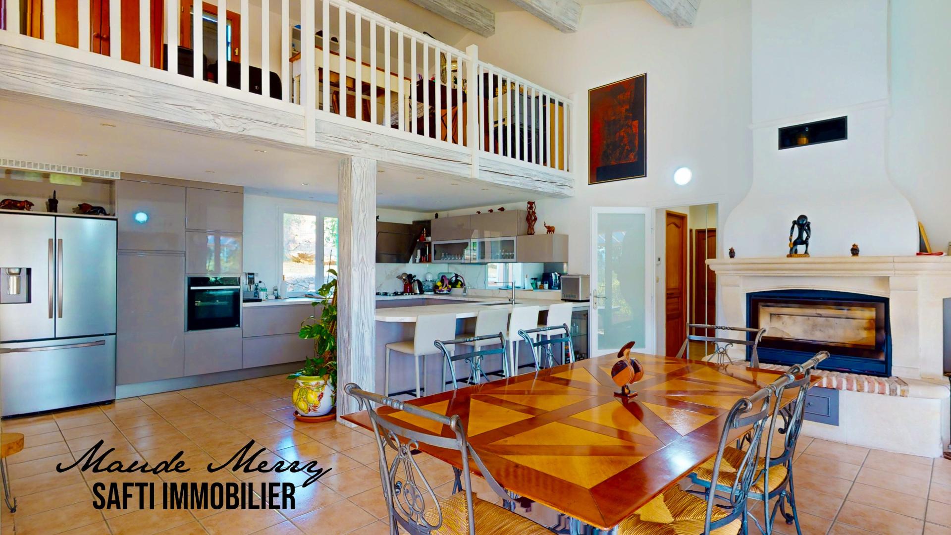 Très belle villa de plain pied avec dépendance, le tout d'une surface habitable totale d'environ 170 m2, aux prestations soignées bénéficiant d'une vue dominante dont l'exposition est idéale : plein sud, au calme et sans aucun vis-à-vis ! La villa se compose d'un hall d'entrée s'ouvrant sur un vaste séjour et sa superbe cuisine ouverte haut de gamme de près de 45 m2 avec cheminée/insert surplombé par une grande mezzanine de 18 m2 ainsi qu'un salon indépendant très cocoon de 27 m2 avec poêle Godin. Un premier espace nuit comporte une première suite parentale de 21 m2 avec un grand dressing aménagé et sa salle d'eau privative d'un peu plus de 6 m2 avec wc, une buanderie et un deuxième w-c séparé. On découvrira ensuite un deuxième espace nuit indépendant composé d'une chambre d'un peu plus de 12 m2 avec salle d'eau et wc. La visite s'achèvera par une belle dépendance de 26 m2 composée de deux chambres avec chacune son coin douche privatif ainsi qu'un wc séparé. Le terrain paysagé d'une surface d'environ 1650 m2 vous charmera avec sa jolie piscine entourée d'une grande plage en teck, une cuisine d'été aménagée avec douche extérieure et wc. Un grand abri voiture et un deuxième abri voiture/bateau/camping car se trouve également sur la propriété profitant d'un accès aisé. Y Déposer ses valises et profiter semble être la formule la plus appropriée pour cette superbe propriété ! !!! VISITE VIRTUELLE DISPONIBLE... Contactez-moi !!!