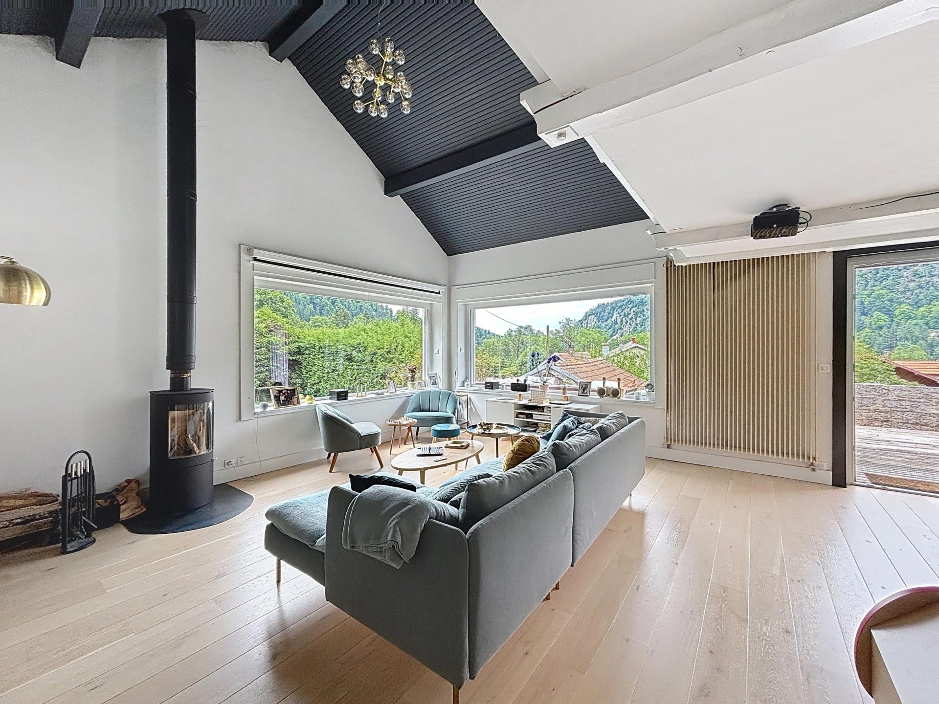 Située à La Cluse-et-Mijoux (25300), cette remarquable maison bourgeoise, rare sur le secteur, profite d’un emplacement recherché avec une vue dégagée et exceptionnelle sur le Château de Joux. Son cadre paisible et verdoyant séduira les amoureux de nature, tout en restant proche des commerces de proximité et des services indispensables. Idéalement située, elle offre également un accès rapide aux principaux axes. Édifiée au début des années 1900, cette maison de maître de 280 m² habitables prend place sur un terrain clos et soigneusement aménagé de 1 491 m², offrant un environnement spacieux, lumineux et parfaitement entretenu. Répartie sur trois niveaux, la demeure dévoile son authenticité dès l’entrée, qui mène à un vaste séjour au charme préservé. Vous profiterez également d’une cuisine haut de gamme, riche en rangements, complétée par un cellier, ainsi que d’un salon doté d’une belle hauteur sous plafond, apportant élégance et volume à l’ensemble. Le majestueux escalier en bois conduit à un palier distribuant une suite parentale avec salle d’eau et dressing, deux chambres supplémentaires, une salle de bain ainsi qu’un WC indépendant. Le second étage dispose quant à lui de trois nouvelles chambres, d’une salle d’eau, d’un WC et d’un grenier. Avec ses 7 chambres, 3 salles de bain, 3 WC et un total de 14 pièces, cette propriété offre de multiples possibilités d’aménagement. Les rénovations récentes, incluant l’amélioration phonique et le remplacement intégral des fenêtres, assurent un confort de vie optimal. Alliant charme de l’ancien et prestations modernes, cette maison d’exception saura conquérir les amateurs de biens uniques et authentiques.
