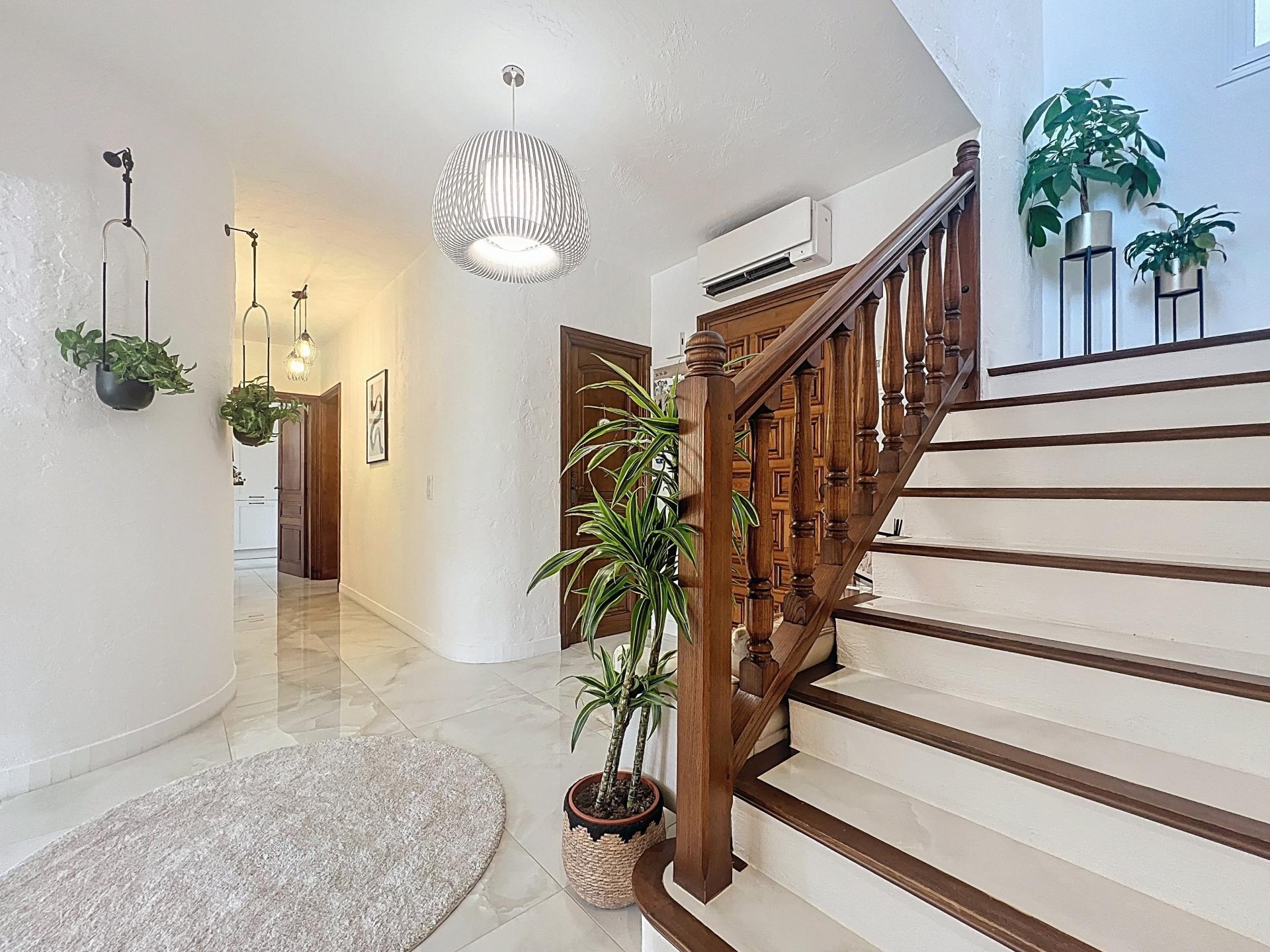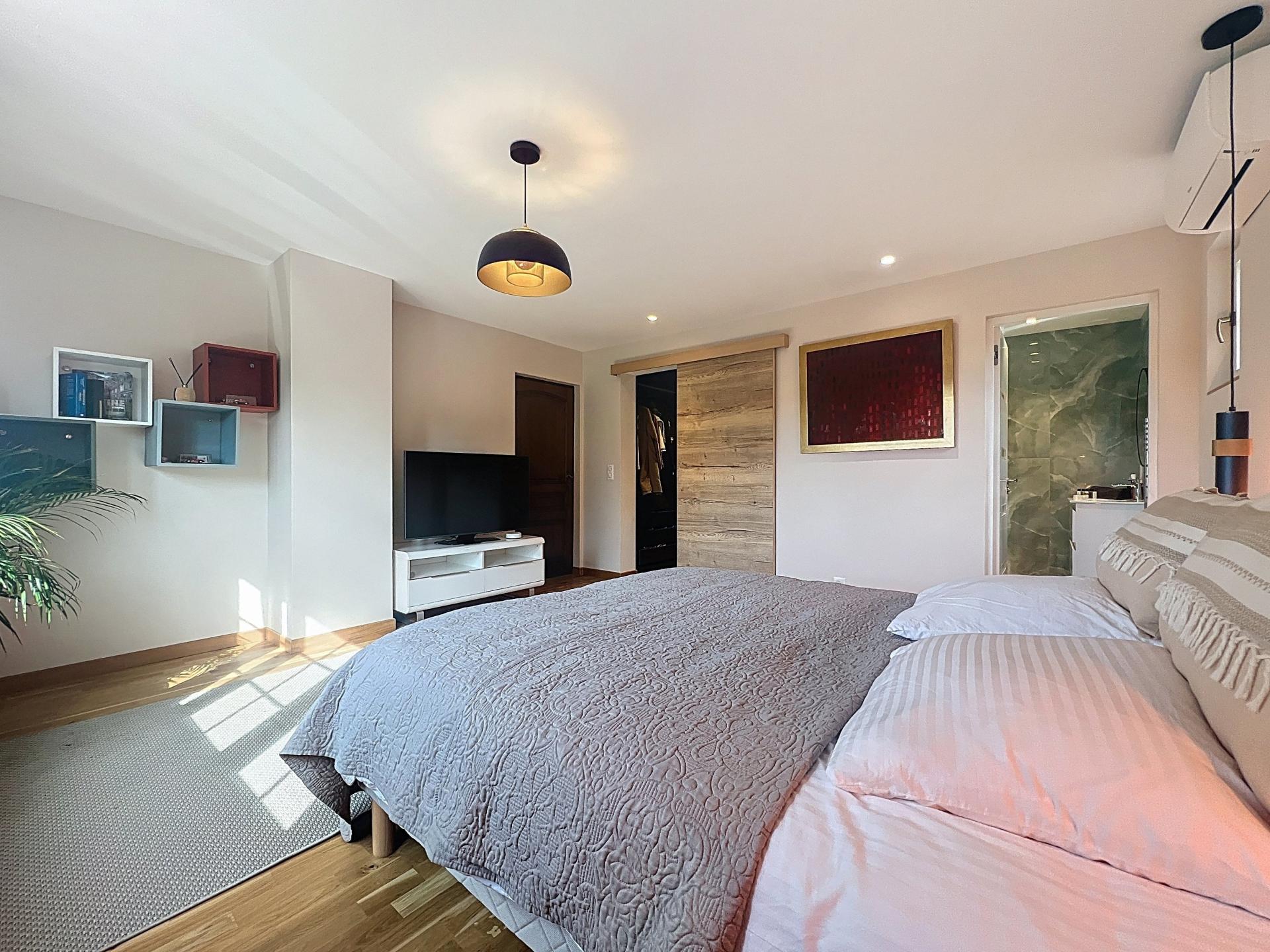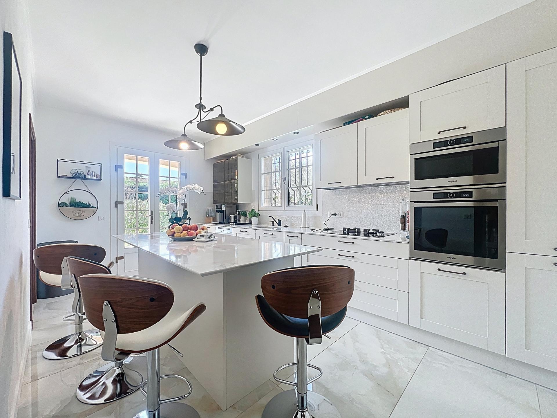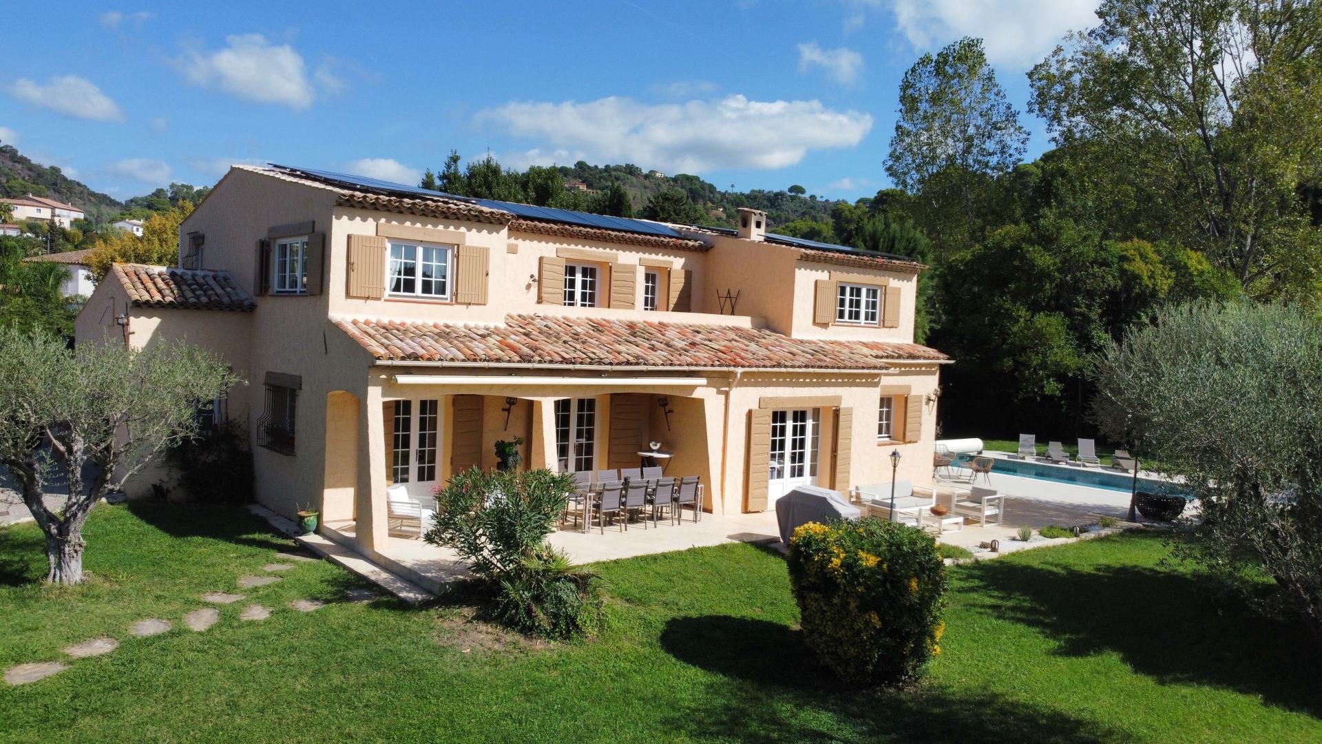 Délégation Cannes-Soleil : La Roquette-sur-Siagne À quelques minutes des commerces et des axes routiers, découvrez cette magnifique villa individuelle de 220 m² (8 pièces), implantée sur un terrain plat de 2 122 m², sublimé par un jardin paysager aux essences méditerranéenne et une piscine au sel 9 x 4 m. Ce bien conjugue avec harmonie authenticité provençale et prestations contemporaines de qualité. Elle propose : une entrée raffinée habillée de pierre d'Égypte, une vaste salle à manger et un salon lumineux avec cheminée, une superbe cuisine entièrement équipée, s'ouvrant sur une large terrasse plein Sud, trois chambres de plain-pied, une salle de douches et des toilettes ; À l'étage : deux chambres en suite avec dressing, une pièce polyvalente (chambre ou salon), une terrasse offrant une vue panoramique sur les collines environnantes. Les plus : Jardin agrémenté d'arbres d'ornement rares, idéal pour profiter de l'ombre et de la sérénité des lieux ; Garage carrelé avec borne de recharge ; Plusieurs places de stationnement ; Villa autonome grâce à ses panneaux solaires et à un puits privé pour une station d'arrosage automatisée (wifi). Un havre de paix où élégance, confort moderne et charme provençal s'unissent à la perfection… À visiter sans tarder ! Contactez-nous dès à présent pour découvrir ce bien d'exception.