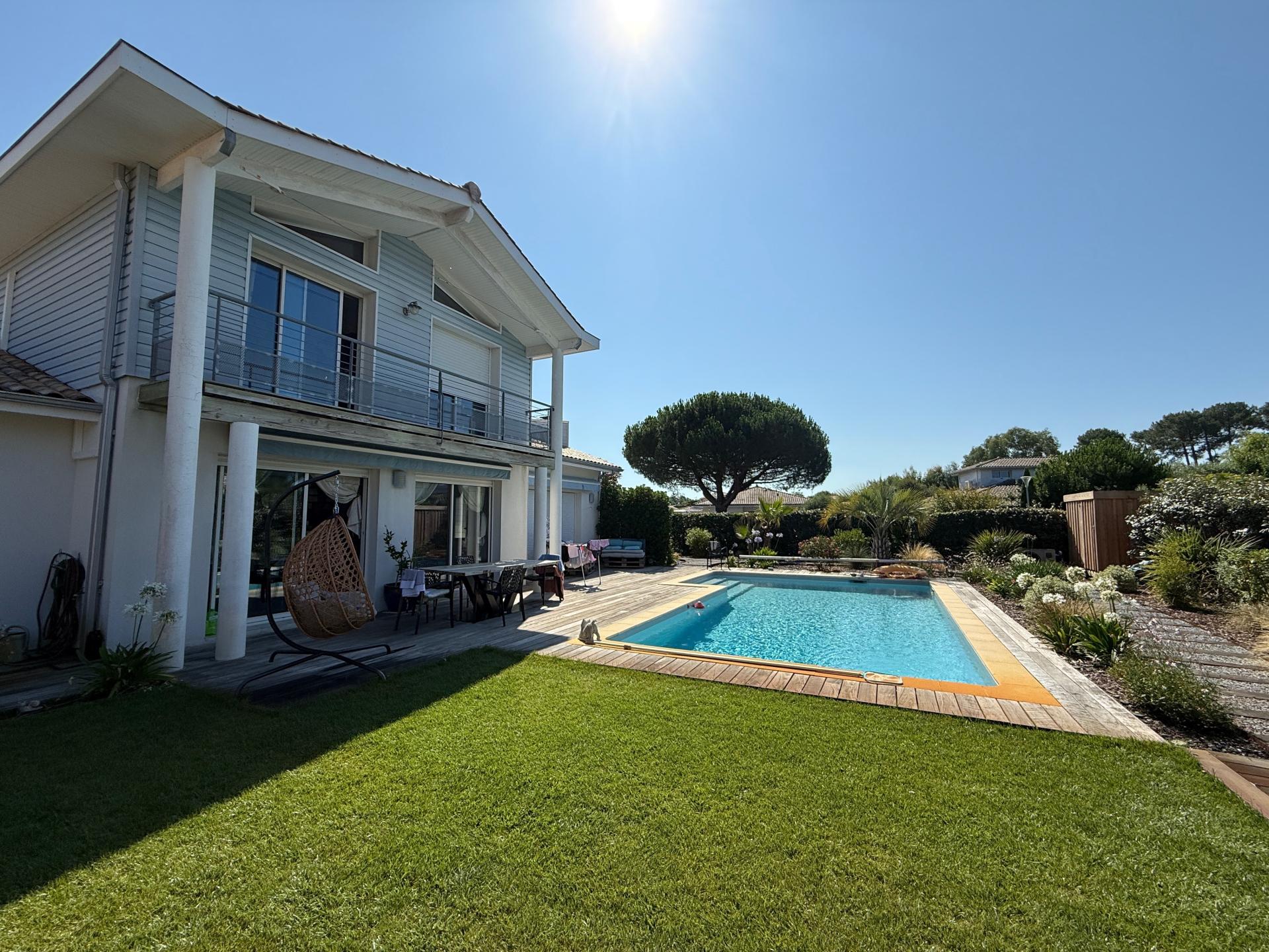 Beaucoup de charme pour cette villa au calme d'environ 190 m², proposant un agencement fonctionnel sur deux niveaux avec au rez de chaussée, une lumineuse pièce de vie avec de beaux volumes, une cuisine équipée spacieuse, un cellier, 2 chambres, 1 salle d'eau et toilettes indépendants. A l'étage, 2 chambres dont une avec balcon et de nombreux placards, un bureau avec rangement, une salle de bain (baignoire et douche), 1 wc et une mezzanine servant d'atelier artistique. Cheminée au salon, pompe à chaleur avec splitz dans la pièce de vie et panneaux photovoltaïques qui générent des revenus. Grande parcelle de terrain mettant en valeur la maison grâce à son jardin arboré et ses espaces extérieurs bien entretenus avec plusieurs terrasses et une piscine, augurant de belles soirées d'été. Le double garage et les dépendances pour une superficie totale d'environ 85 m² (dont un local rénové de 25 m² pouvant accueillir du public) offrent praticité et espace de rangement supplémentaire, tout en préservant l'esthétique soignée de la propriété. Son plus : possibilité de garer plusieurs véhicules, un bateau et/ou camping car. Dépendance aménagé pouvant convenir pour une profession libérale, artisan. Bien d'exception aux multiples atouts et aux volumes généraux dans un cadre privilégié entre l'océan Atlantique et le bassin d'Arcachon, réputé pour ses plages de sable fin et sa nature préservée. Négociation possible !