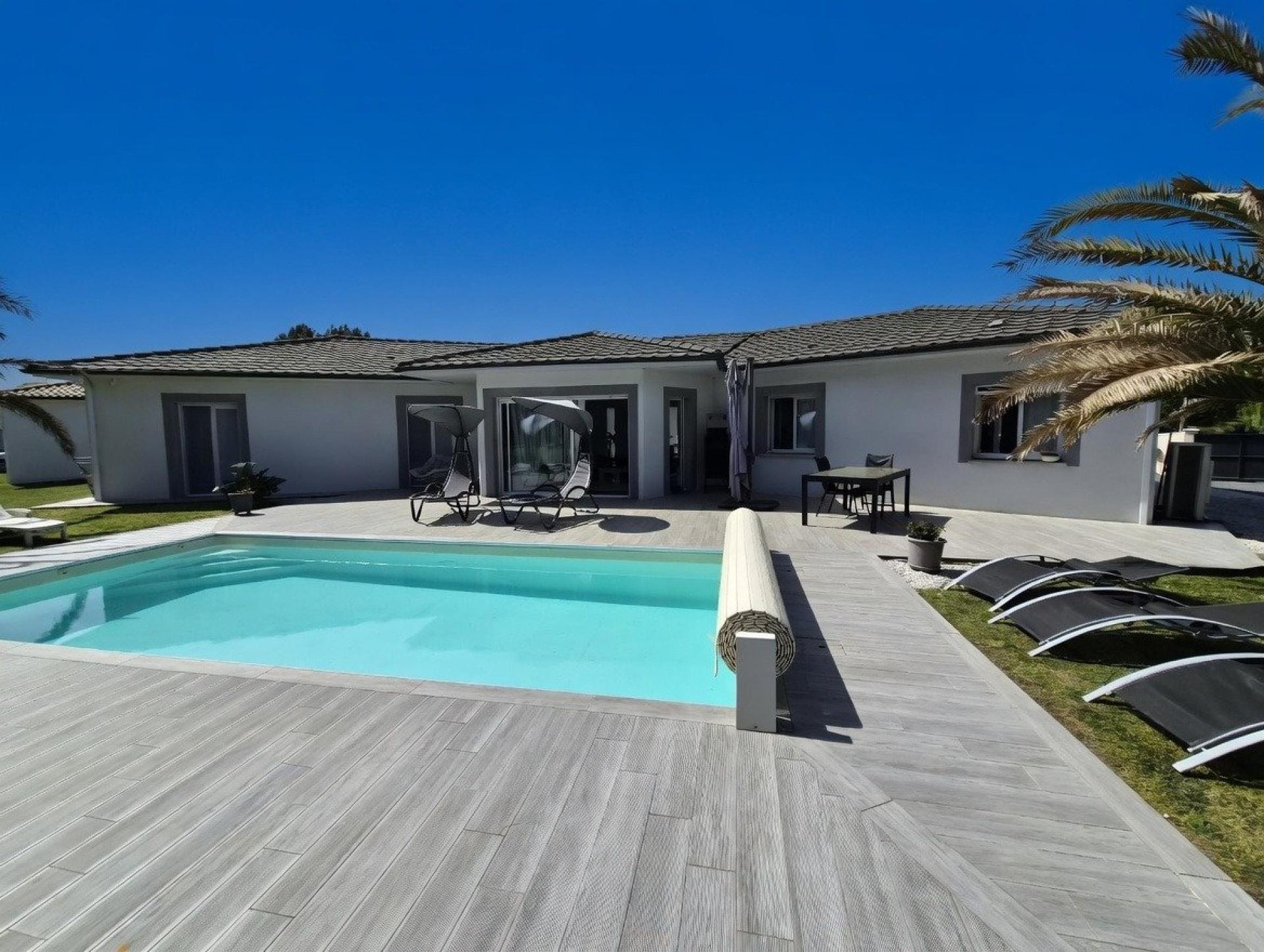 Idéalement située au centre de Lesparre-Médoc, à 1h15 de l'aéroport de Bordeaux et 20 mn des plages océanes. Découvrez cette superbe maison contemporaine de 2019 développant environ 180 m2 habitables, aux prestations soignées et matériaux de qualité. Dés l'entrée, vous serez séduits par une magnifique pièce de vie d'environ 80 m2 avec cuisine ouverte offrant de très beaux volumes, un cellier, une buanderie, un bureau, quatre chambres, une salle de bains avec baignoire/balnéo et douche à l'italienne, un WC avec lave-main. A l'extérieur sur une parcelle entièrement clôturée d'environ 3200 m2 avec un double accès, vous trouverez une piscine chauffée et sécurisée par un rideau de protection, un pool-house, un double garage d'environ 60 m2 et un abri de jardin. Un bien coup de coeur alliant confort moderne, volumes généreux et prestations premium.