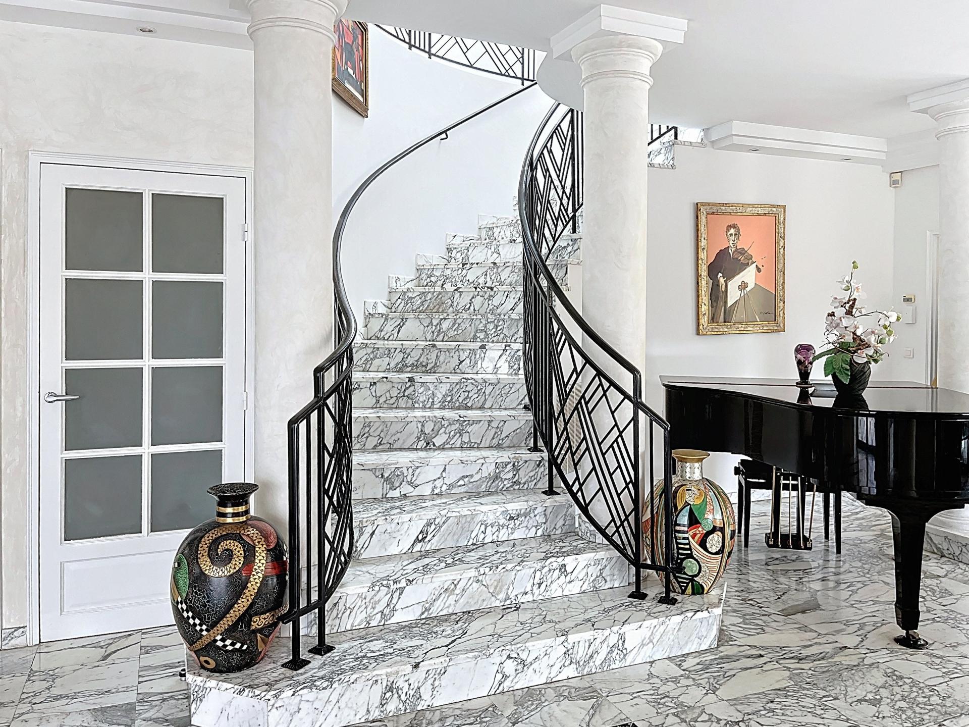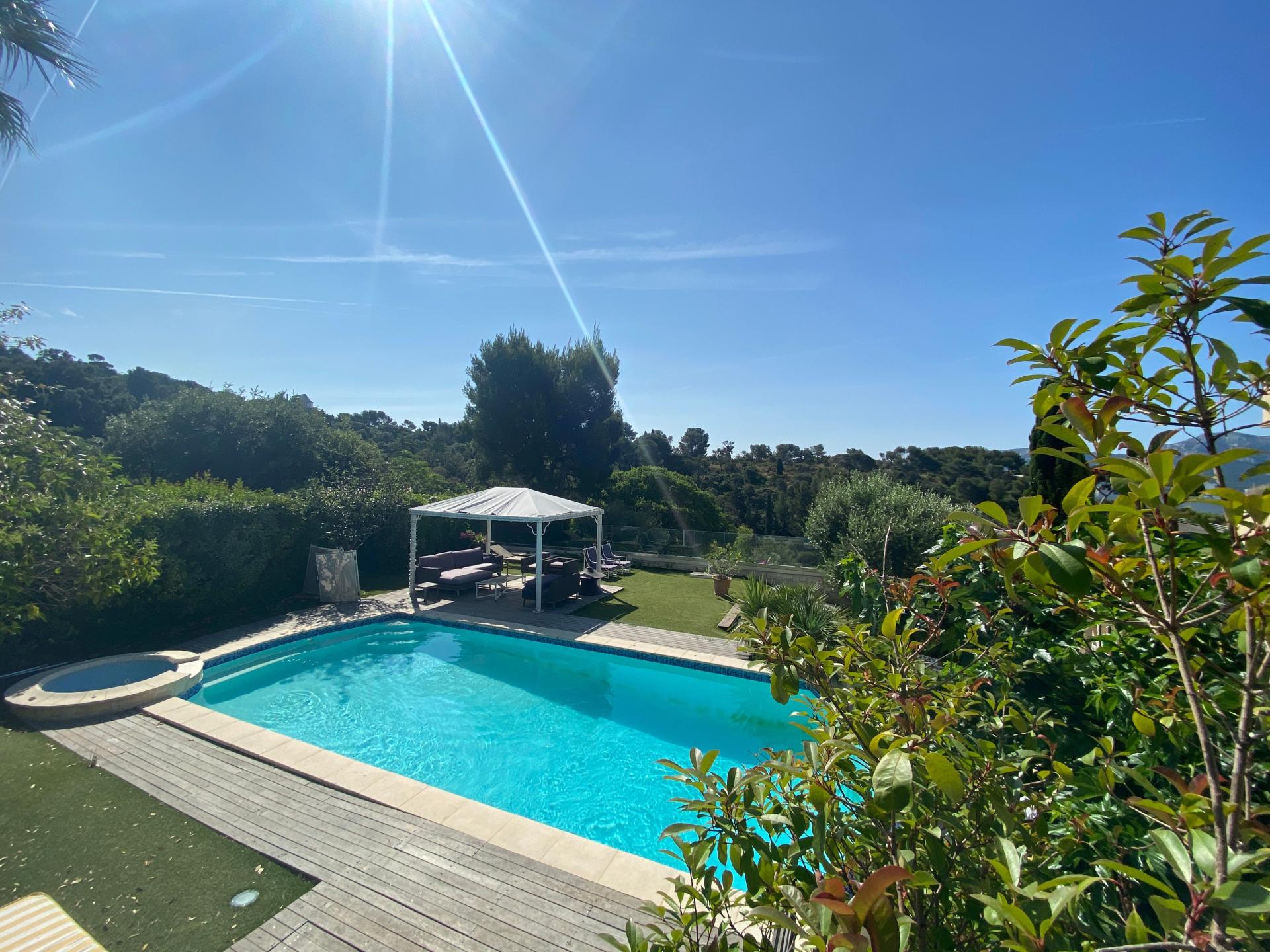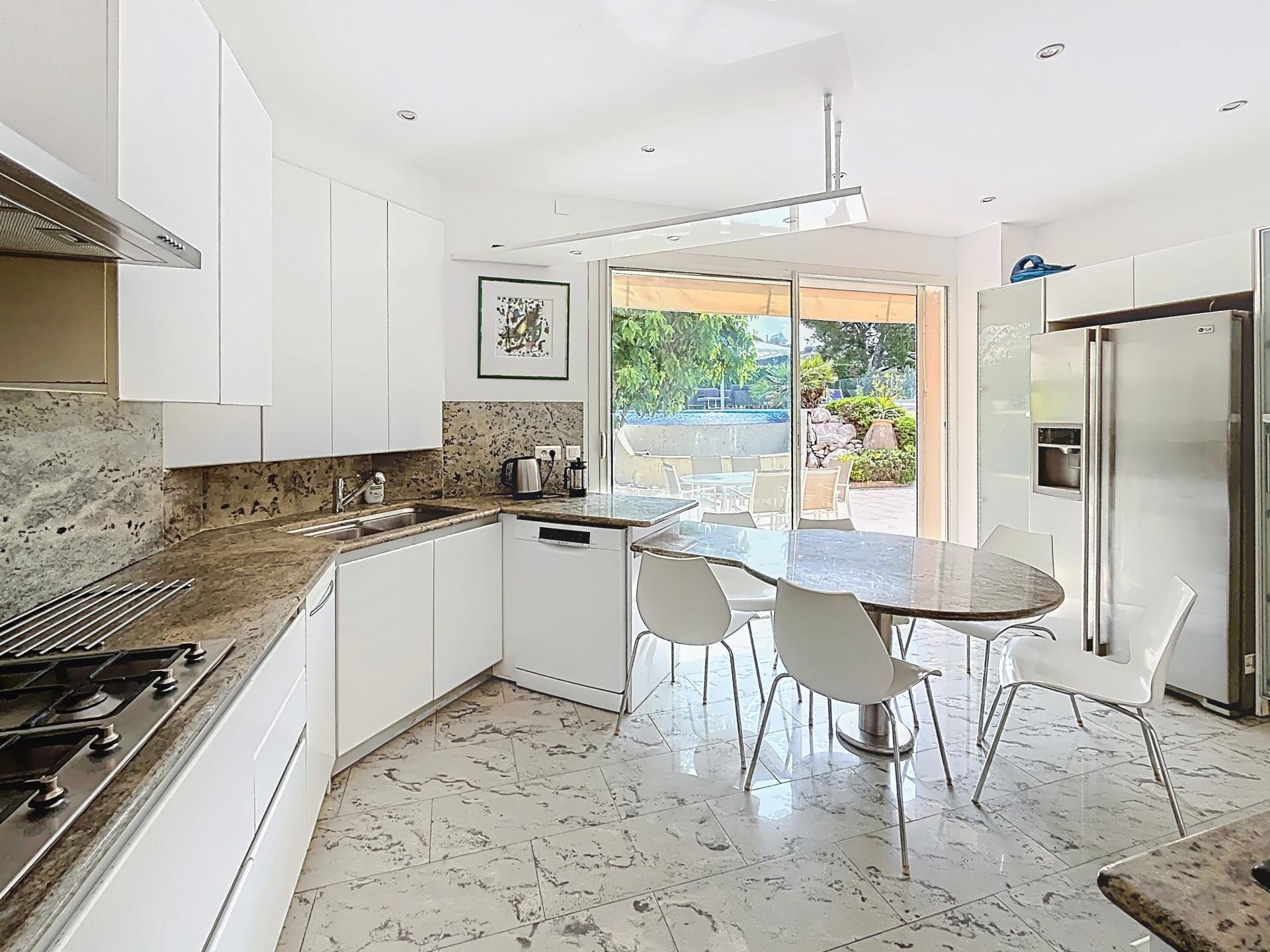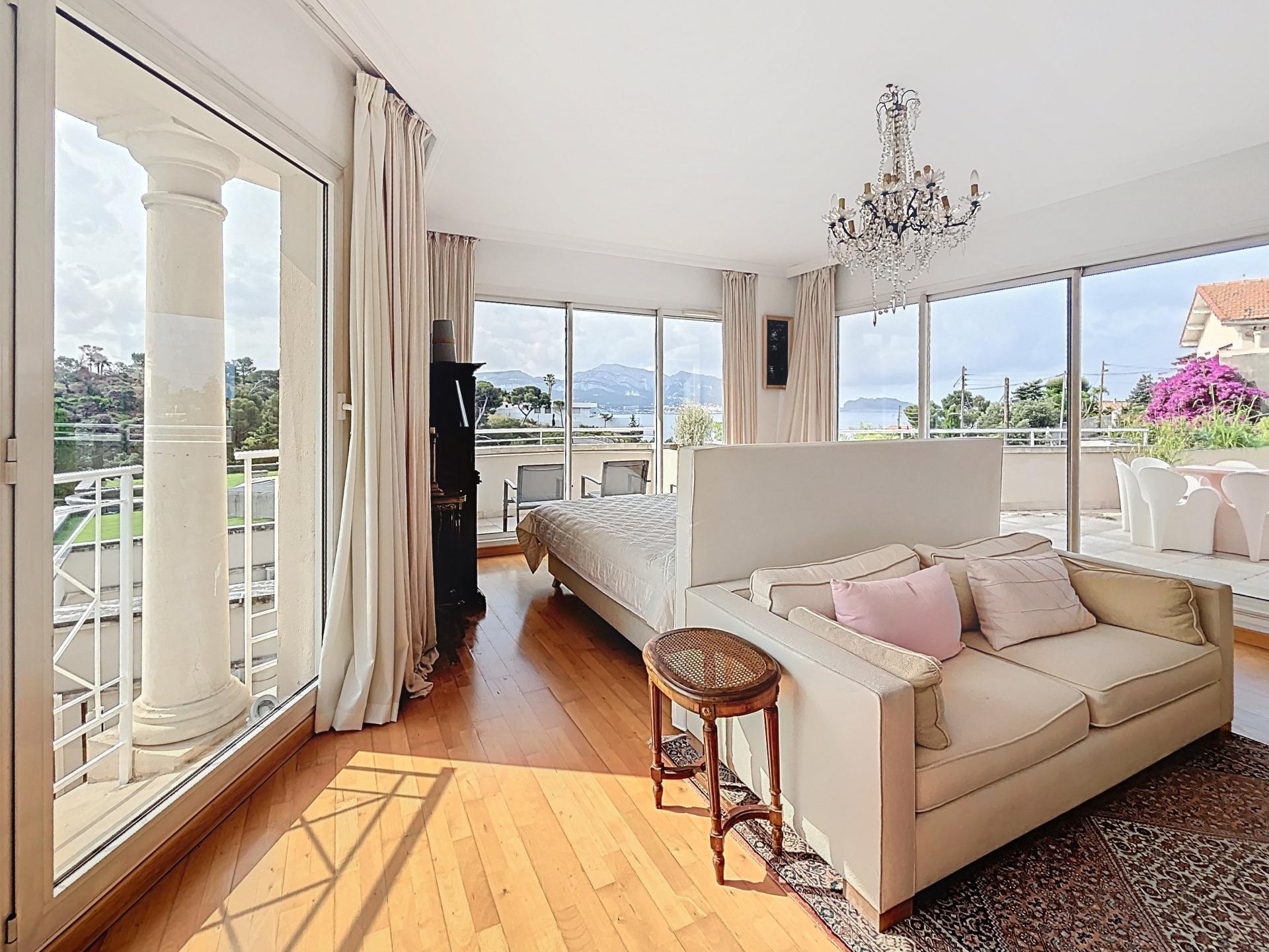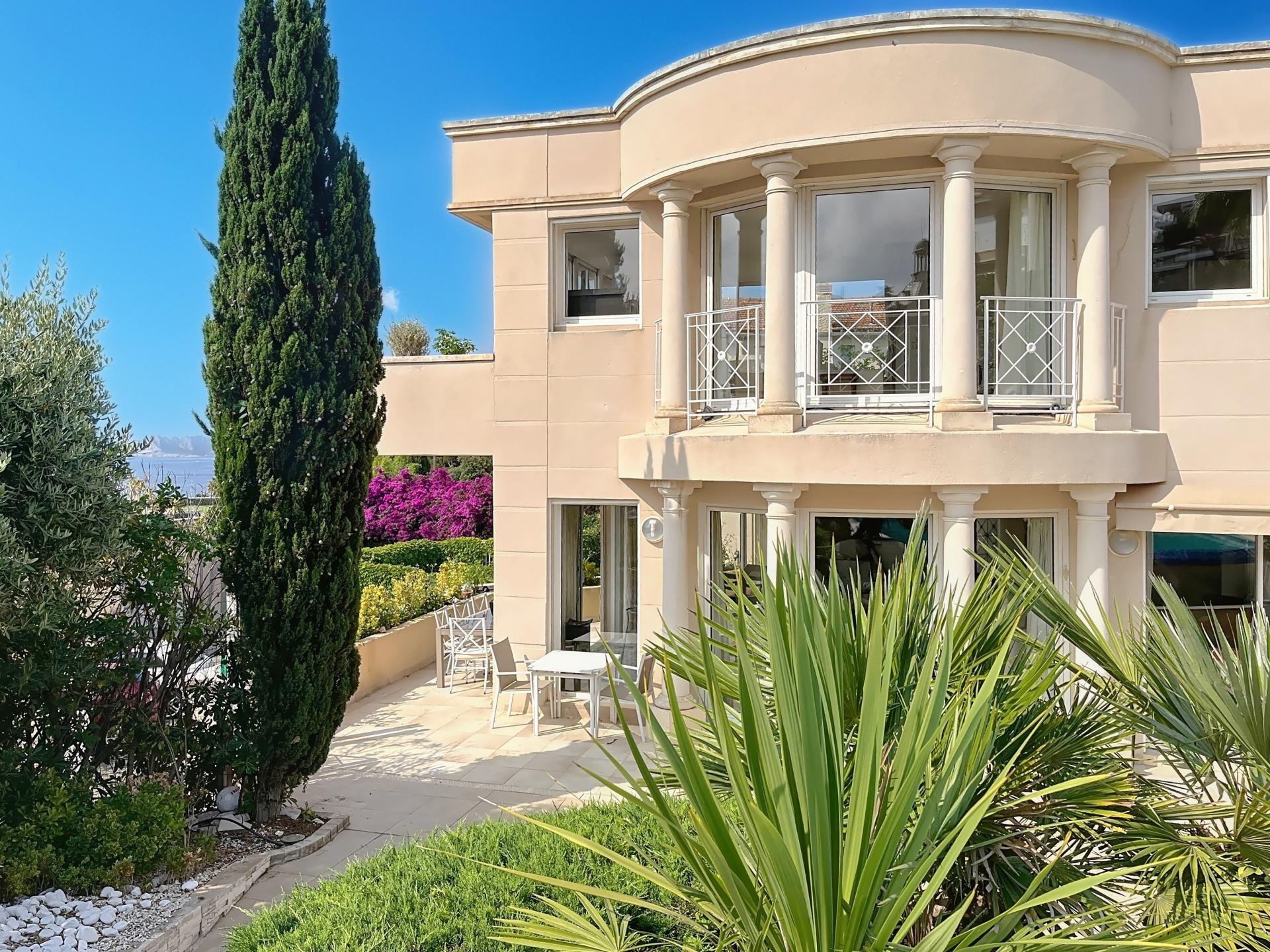 Au sein d’une résidence gardée 24h/24, dans un cadre idyllique très calme, sur une parcelle de 630 m2 avec piscine et vue mer, Maison de style Hotel particulier de 356 m2 habitables (surface au sol de 435 m2) sur 3 niveaux. Dès l’entrée, vous découvrirez un vaste salon de plus de 90m2, baigné de lumière grâce à ses nombreuses ouvertures sur la terrasse et le jardin. Sur le même niveau, se trouvent une chambre, un bureau, une salle à manger, un wc avec lave main, une cuisine avec arrière cuisine (avec coin douche wc pour le personnel de maison) et de nombreux placards. Accès direct à la terrasse et à la piscine. A l’étage, une magnifique suite parentale de plus de 45m2 offre une vue panoramique sur la mer, le jardin avec la piscine et qui possède une terrasse privative. Un dressing et une salle de bain avec baignoire, douche et toilettes séparés viennent compléter cette suite. Vous trouverez 3 autres chambres dont une suite junior de 24 m2, toutes avec vue mer et accès à une grande terrasse exposée plein sud dont 2 possèdent leur salle de bain privative. Une autre salle de bain est proposée sur le même niveau. Au niveau inférieur, se trouve un grand garage de 62m2, un appartement avec 2 chambres, salle d’eau et wc avec une entrée indépendante pour loger du personnel, de la famille ou des amis occasionnellement.