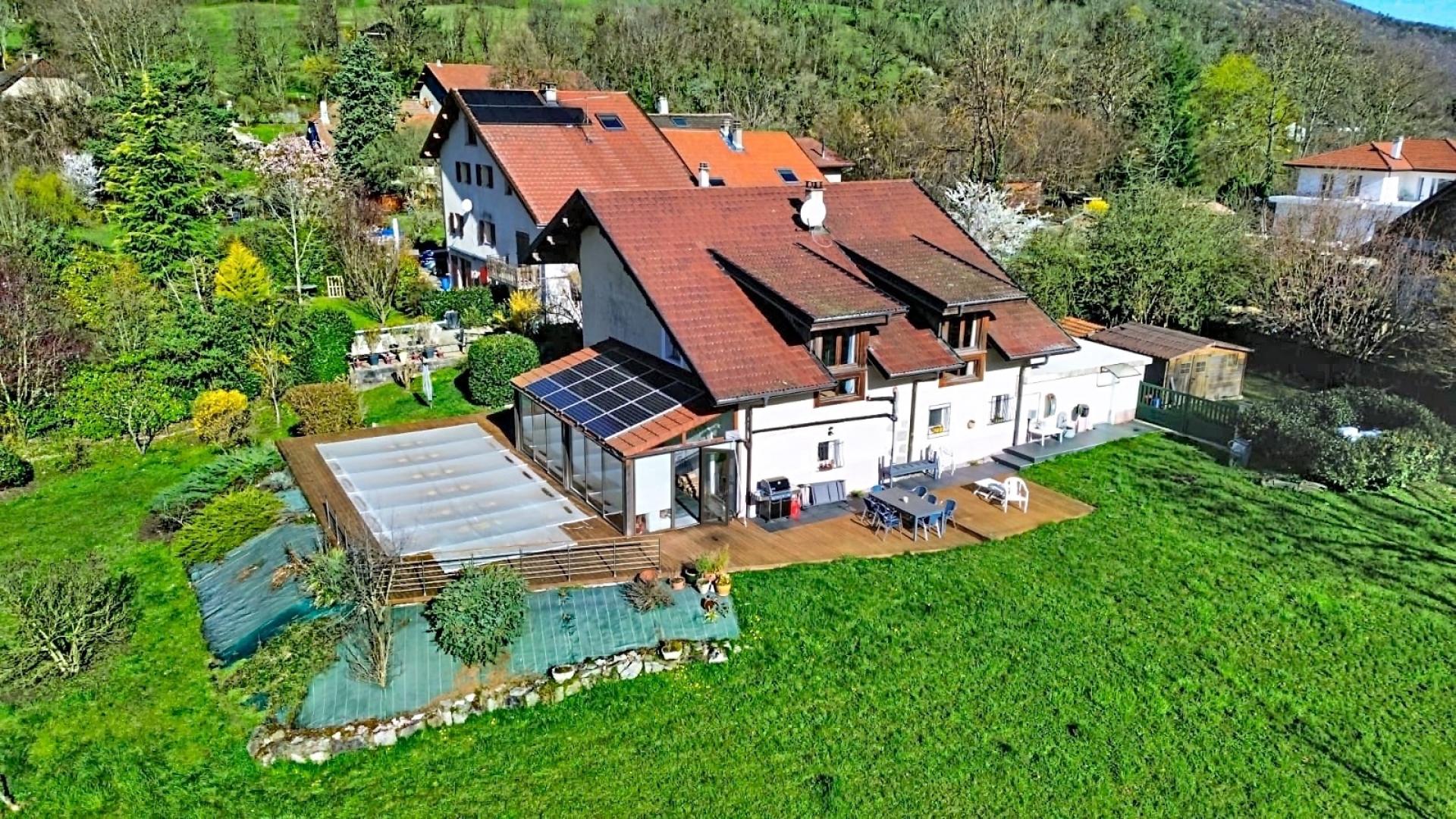 Située à Monnetier-Mornex (74560), cette propriété bénéficie d'un emplacement privilégié proche de Genève, offrant un cadre de vie paisible au milieu des montagnes. La ville propose un environnement naturel préservé, idéal pour les amoureux de la tranquillité tout en étant à proximité des commodités et des centres d'intérêt de la région. Cette maison de 239 m² sur un terrain de 3 255 m² est dotée de 5 pièces dont 4 chambres, 2 salles de bain et 2 toilettes. Au rez-de-chaussée, une pièce de vie lumineuse s'ouvre sur une véranda, une cuisine indépendante, une salle de bain avec un WC et une buanderie. À l'étage, 3 chambres, une mezzanine et une salle de bain avec WC offrent un espace nuit confortable. Le dernier étage abrite une vaste chambre avec mezzanine. À l'extérieur, la propriété arborée dispose d'une piscine enterrée, ajoutant une touche de détente à ce cadre idyllique.
