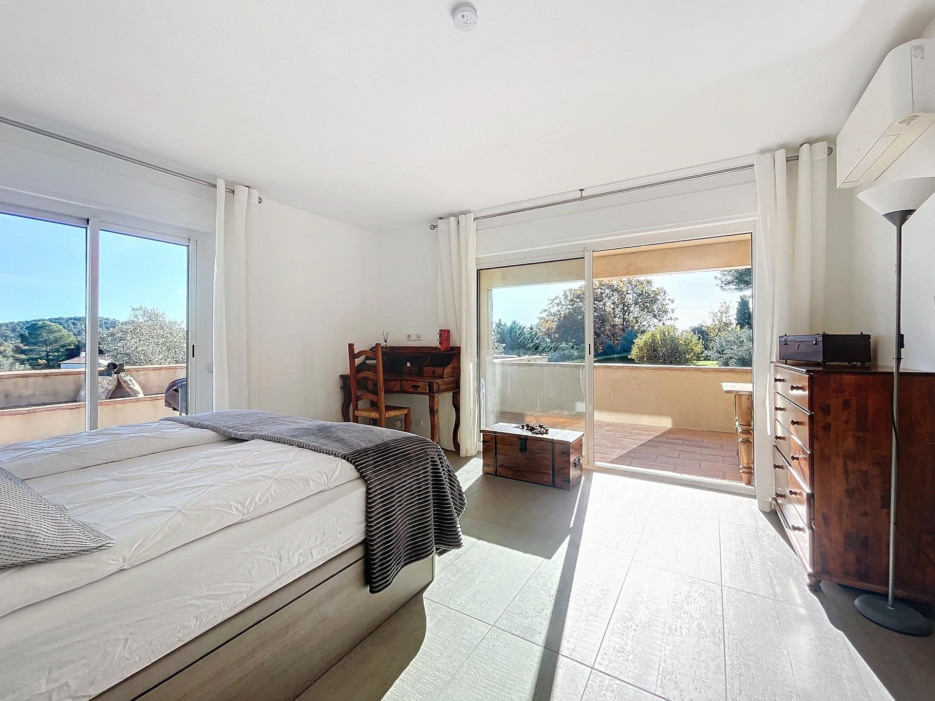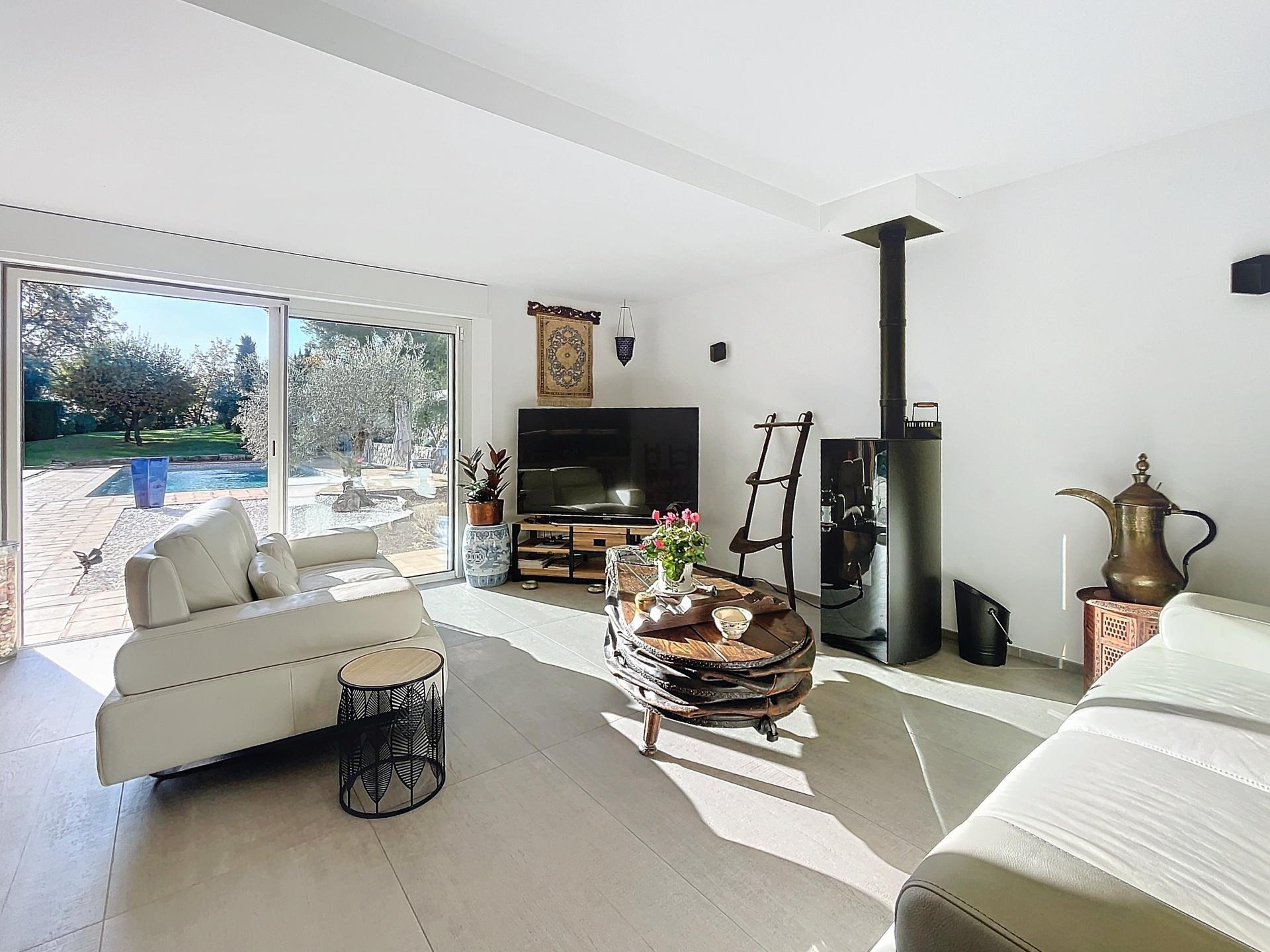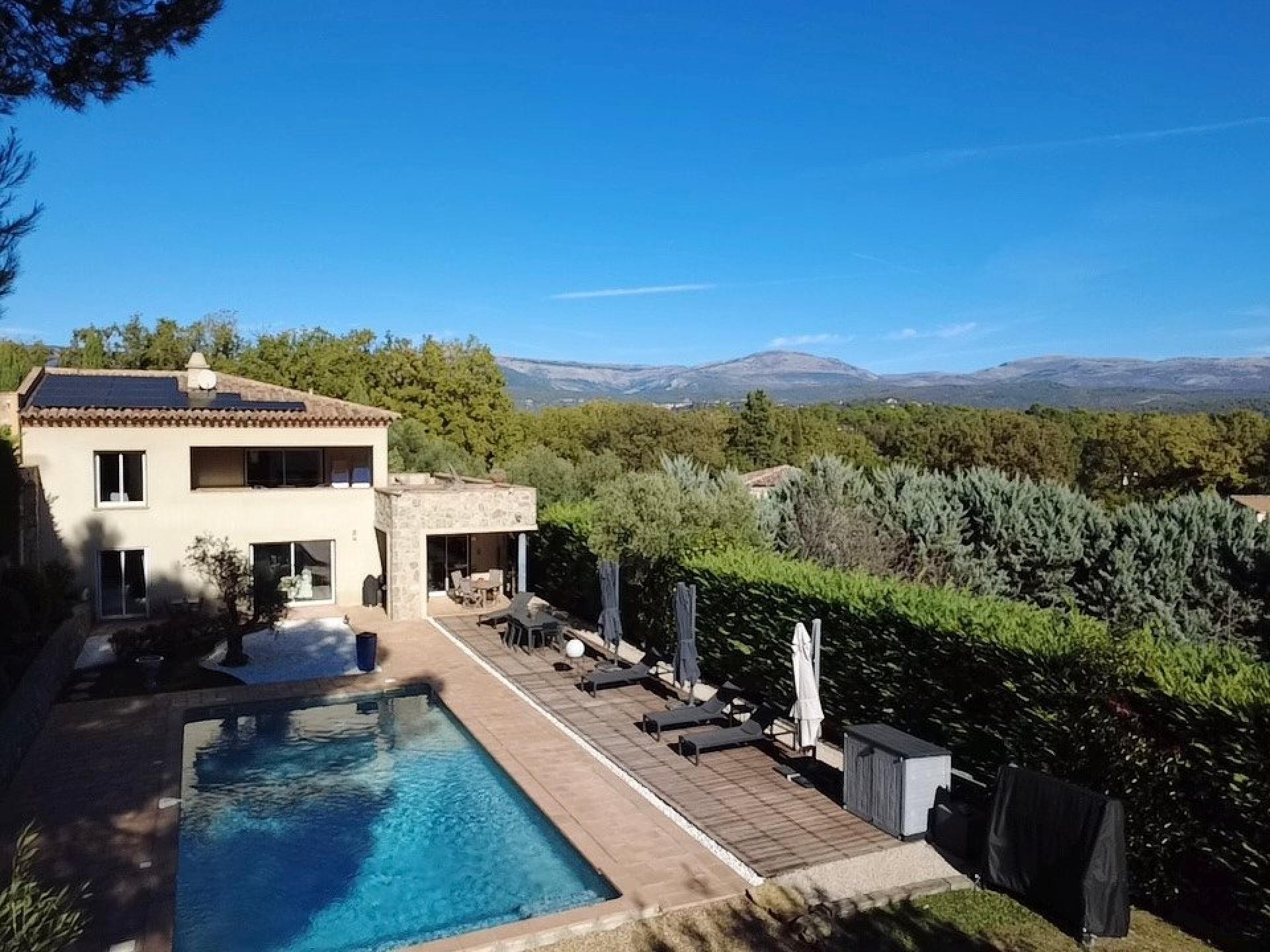 Maison coup de cœur située dans les hauteurs de Montauroux. Construite en 2012, en parfait état, entièrement climatisée, avec poêle à granulés et panneaux solaires (installés il y a moins de 2 ans). Rez-de-chaussée : • Belle pièce de vie lumineuse • Grande cuisine équipée + arrière-cuisine • WC indépendant • Grande chambre de plain-pied avec salle de bain (baignoire + douche + WC) Étage: • Deux grandes chambres avec chacune salle d’eau privée (douche ou bain, WC, double vasque, dressing). Les deux chambres donnent sur une terrasse avec vue panoramique Extérieurs : • Terrain paysager • Piscine 10x5 m • Terrain de boules • Garage Aucun travaux, électricité conforme, fosse septique aux normes.