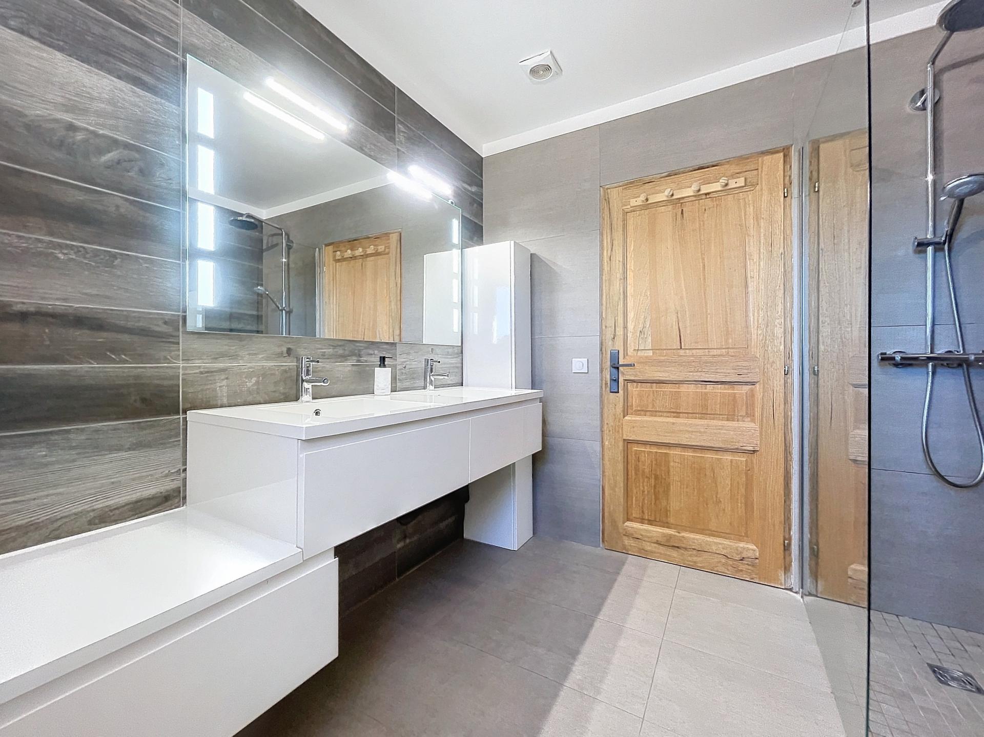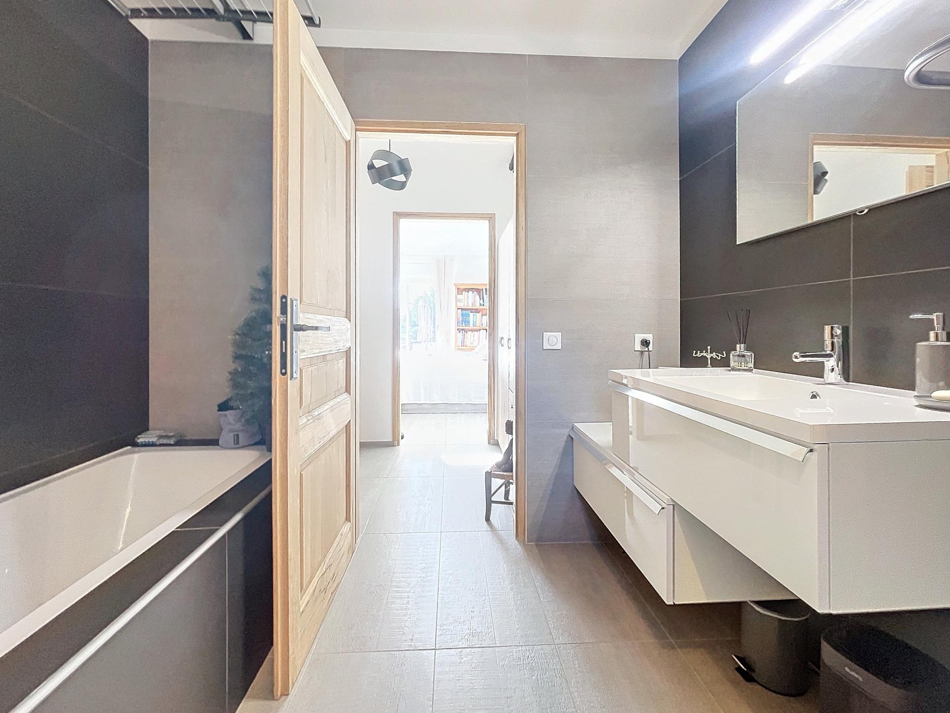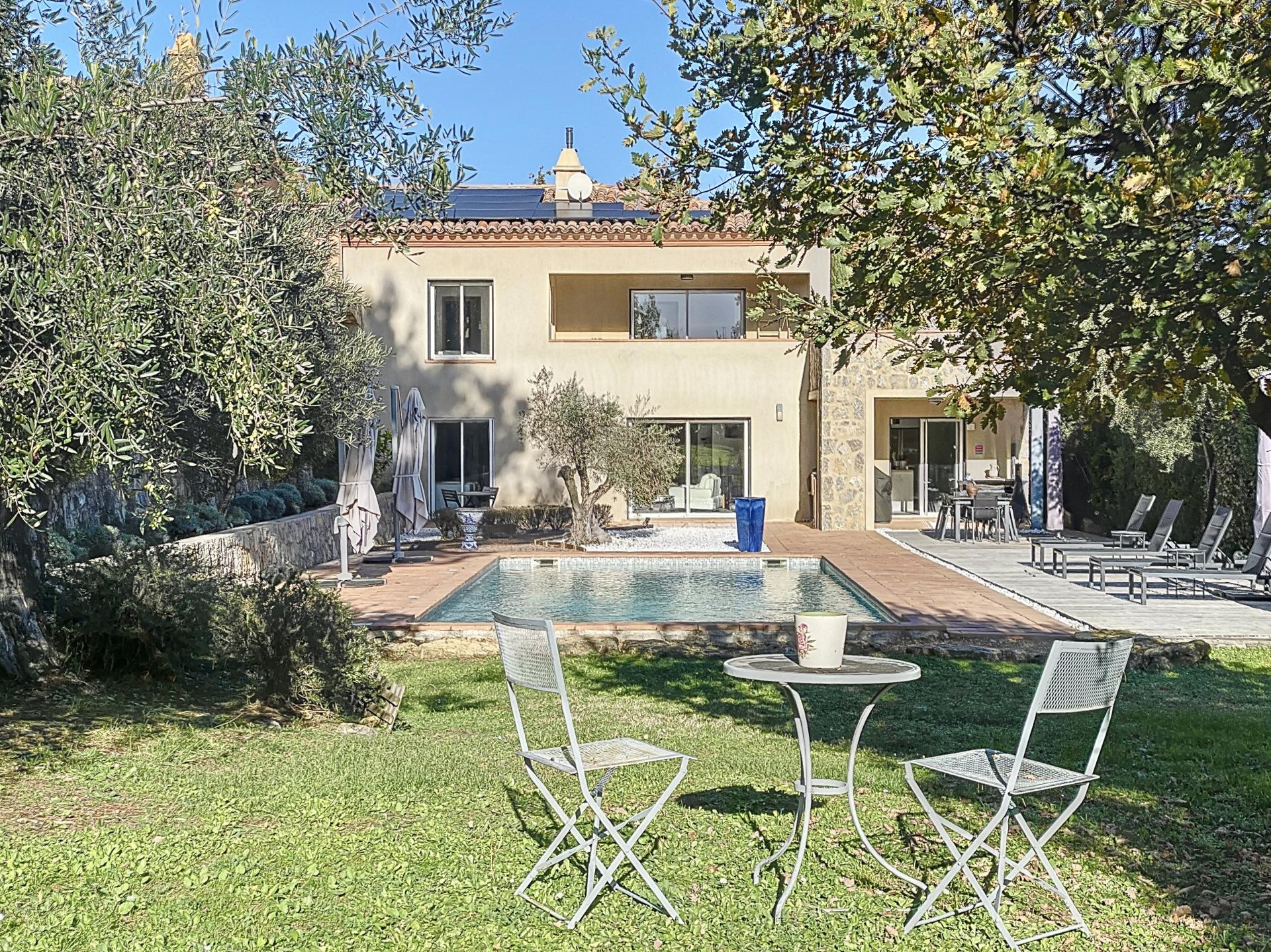 Maison coup de cœur située dans les hauteurs de Montauroux. Construite en 2012, en parfait état, entièrement climatisée, avec poêle à granulés et panneaux solaires (installés il y a moins de 2 ans). Rez-de-chaussée : • Belle pièce de vie lumineuse • Grande cuisine équipée + arrière-cuisine • WC indépendant • Grande chambre de plain-pied avec salle de bain (baignoire + douche + WC) Étage: • Deux grandes chambres avec chacune salle d’eau privée (douche ou bain, WC, double vasque, dressing). Les deux chambres donnent sur une terrasse avec vue panoramique Extérieurs : • Terrain paysager • Piscine 10x5 m • Terrain de boules • Garage Aucun travaux, électricité conforme, fosse septique aux normes.
