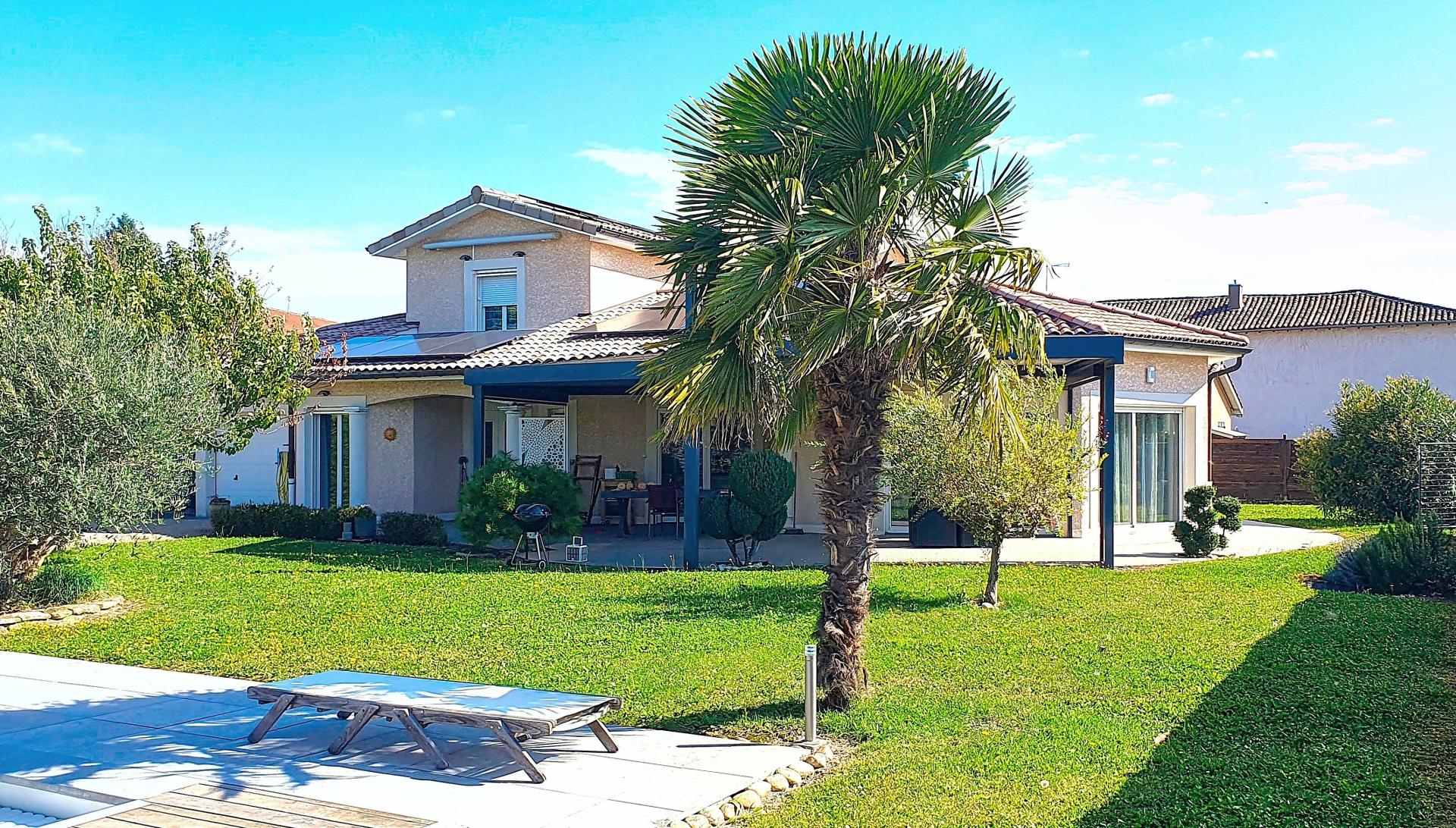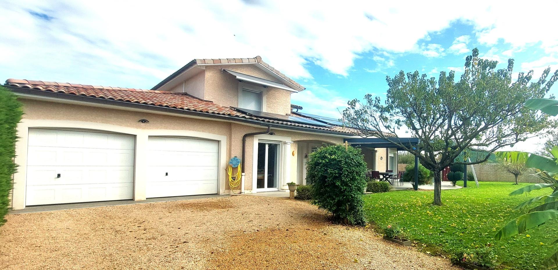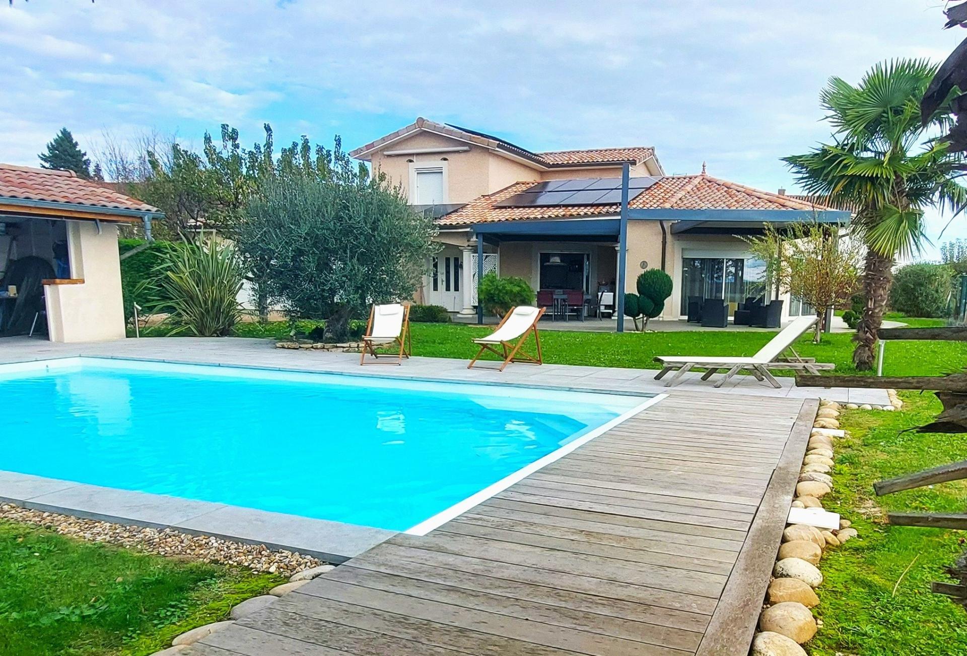 A découvrir cette superbe maison d’architecte de 182m² sur 1300m² de terrain construite en 2003, située à 5mn de Montmerle-sur-Saône, proche de toutes les commodités commerces, écoles, et services Secteur très prisé en Val de Saône à 15 mn de Villefranche sur Saône et de Belleville (accès autoroutiers A6 et gare TER ) dans un environnement calme et verdoyant, offrant une vue dégagée et sans vis-à-vis Des espaces généreux avec un salon/séjour cathédral de 70m² avec cuisine ouverte équipée avec cellier, 4 belles chambres (2 en rdc dont une suite parentale et 2 à l'étage), 2 salles de bains spacieuses, 2 toilettes, une buanderie, une cave, un double garage de 60m²... Des prestations haut de gamme en intérieur : PAC réversible neuve, volets roulants automatisés... et en extérieur une piscine chauffée, un pool house, une terrasse avec 2 pergolas bioclimatiques, ainsi que des panneaux solaires... Une propriété d’exception qui allie élégance, confort et fonctionnalité ....