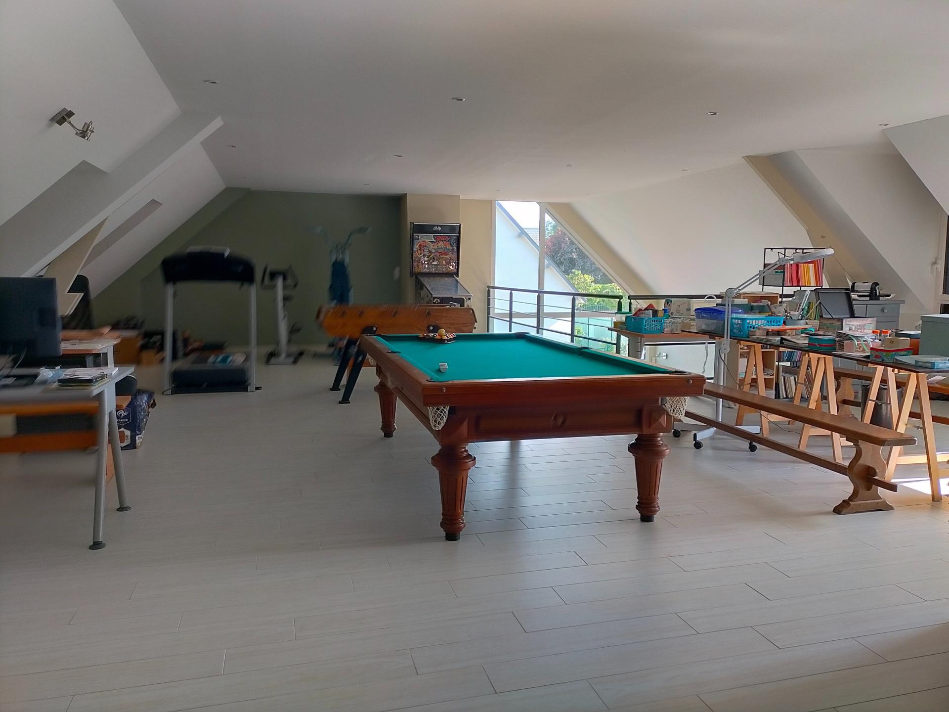 Cette maison d'architecte vous séduira par ces volumes et espaces. Très lumineuse, elle offre en rdc un espace de vie de plus de 90m², un espace détente de plus de 50m², deux chambres dont une avec sa douche, dressing. L'étage propose deux autres chambres, un ciné home ( qui peut devenir une chambre avec ouverture d'un velux), un dressing, une salle de jeux de presque 60 m² avec la possibilité de créer dans cet espace deux ou trois chambres supplémentaires. Une piscine intérieure de 3.5x10, chauffée pour passer des moments agréables toute l'année. Plusieurs terrasses pour profiter des extérieurs, du barbecue, du jardin. Une dépendance offre trois places de parking et la possibilité d'un petit logement indépendant.