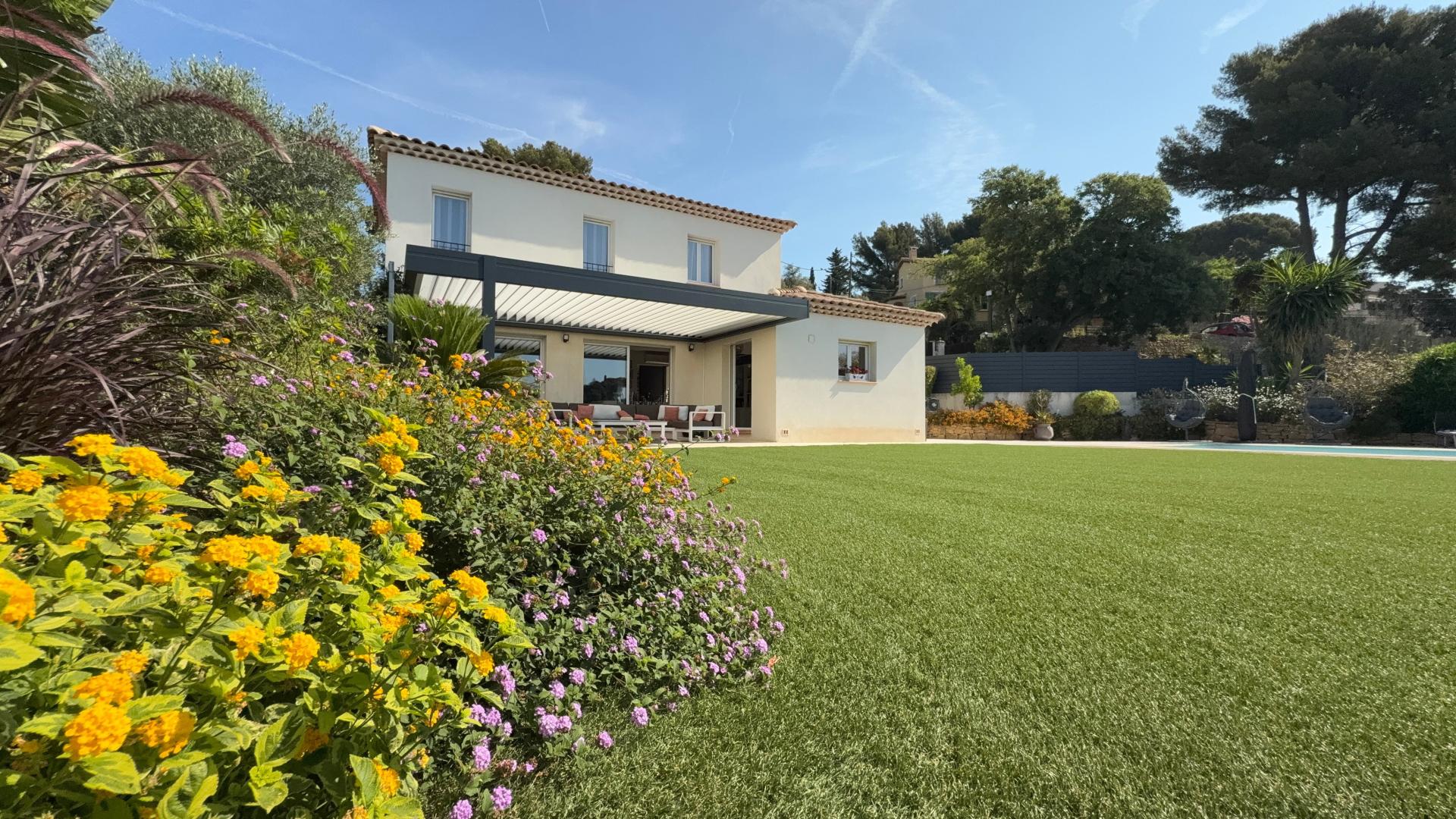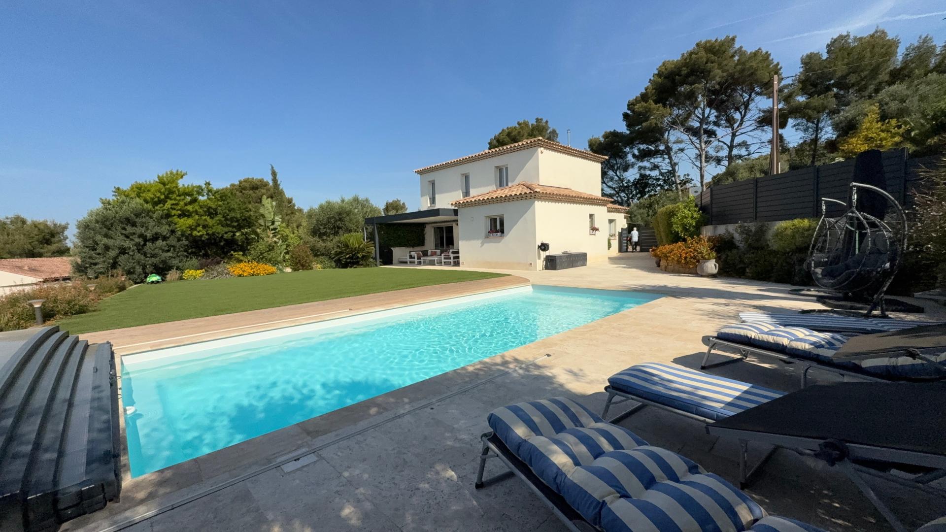 Villa de charme avec vue panoramique et prestations haut de gamme – Ollioules Nichée au cœur d’un environnement résidentiel prisé et parfaitement au calme, cette villa d’environ 142 m² habitables offre une vue panoramique dégagée, sans aucun vis-à-vis. Implantée sur un terrain arboré de 1 100 m², elle séduit par ses volumes généreux, sa luminosité et la qualité de ses prestations : grande piscine, double garage, carport, stationnements multiples, portail électrique avec accès goudronné. Le rez-de-chaussée propose une vaste pièce de vie traversante avec salon, salle à manger et une belle cuisine, une suite parentale avec salle de bains et WC. L’étage dessert trois chambres, une salle de bains et des WC indépendants. Nombreux équipements : volets roulants électriques, ballon thermodynamique, aspiration centralisée, nombreux rangements... Visite virtuelle 3D Matterport disponible sur demande.