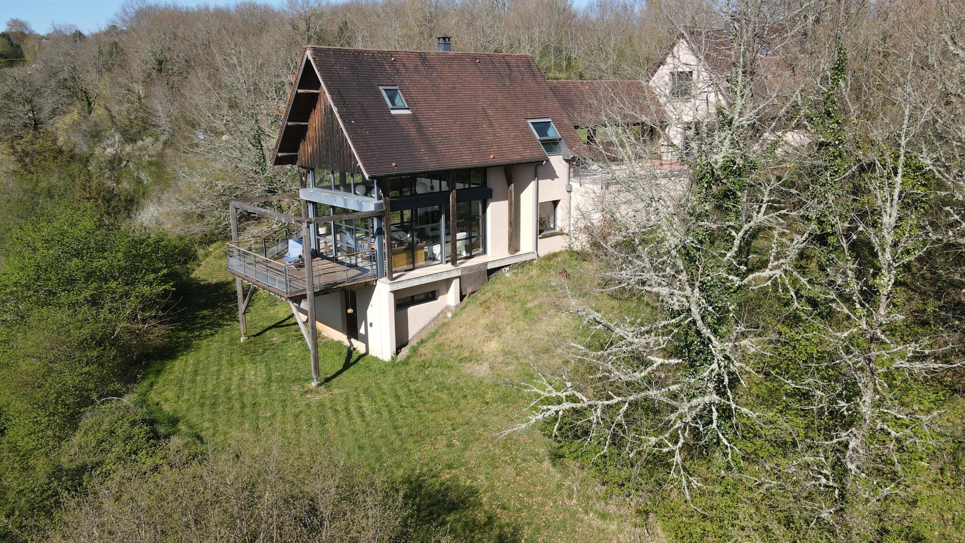 Située à Rouffignac-Saint-Cernin-de-Reilhac, cette propriété suspendue dans son environnement, bénéficie d’un emplacement d’exception, au calme, au coeur de la nature. Le village pittoresque offre une vie paisible tout en restant proche des commodités (commerces, écoles, maison médicale, complexe sportif...) — un cadre idéal pour une vie de famille. La région, riche en patrimoine, séduira les amateurs d’histoire : grotte des 100 mammouths, château de l’Herm et l’univers de Jacquou le Croquant, la grotte de Lascaux et la magnifique Sarlat. Maison d’architecte intégrée à son environnement, sur un terrain généreux de 10 114 m². La maison (210 m², construction 2005) se compose de deux logements reliés par une coursive couverte et une vaste terrasse, offrant à la fois indépendance et convivialité. Au total : 8 pièces dont 4 chambres, 3 salles de bains et 4 toilettes. Lumineuse, la pièce de vie s’ouvre largement sur la nature pour un quotidien apaisant. Un garage double, un bâtiment annexe propice pour un indépendant (parking dédié 3 places) complètent ce bien unique, alliant design contemporain et harmonie avec le paysage.