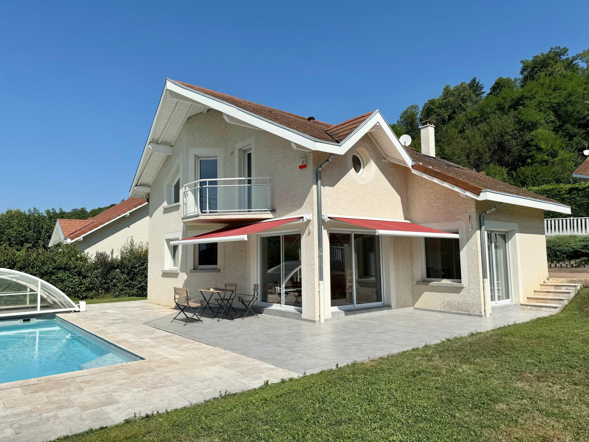 Villa d’architecte de plain-pied de 225 m², sur un terrain clos et arboré de 2830 m², dans un cadre paisible à 5 min du centre, proche des écoles, commerces et accès Voiron. Côté jour, la maison est composée d'un séjour cuisine de 43 m² communiquant sur la piscine couverte, une salle de jeux de 95 m² avec bar et poêle à granules. Trois chambres, une salle de bains, une salle d’eau et un WC séparé composent l’espace nuit. La maison dispose d’un chauffage central gaz de ville et d'une pompe à chaleur pour la piscine. En complément, cave en sous-sol, cellier buanderie, double garage de 34 m², un espace de vie autour de la piscine couverte (11,5x4.5 m) de 123 m², terrasse, four à pain, coin pizza, jeu de boules et bassin d’eau. Une maison unique, qui allie confort et tranquillité, à visiter rapidement. Visite virtuelle.