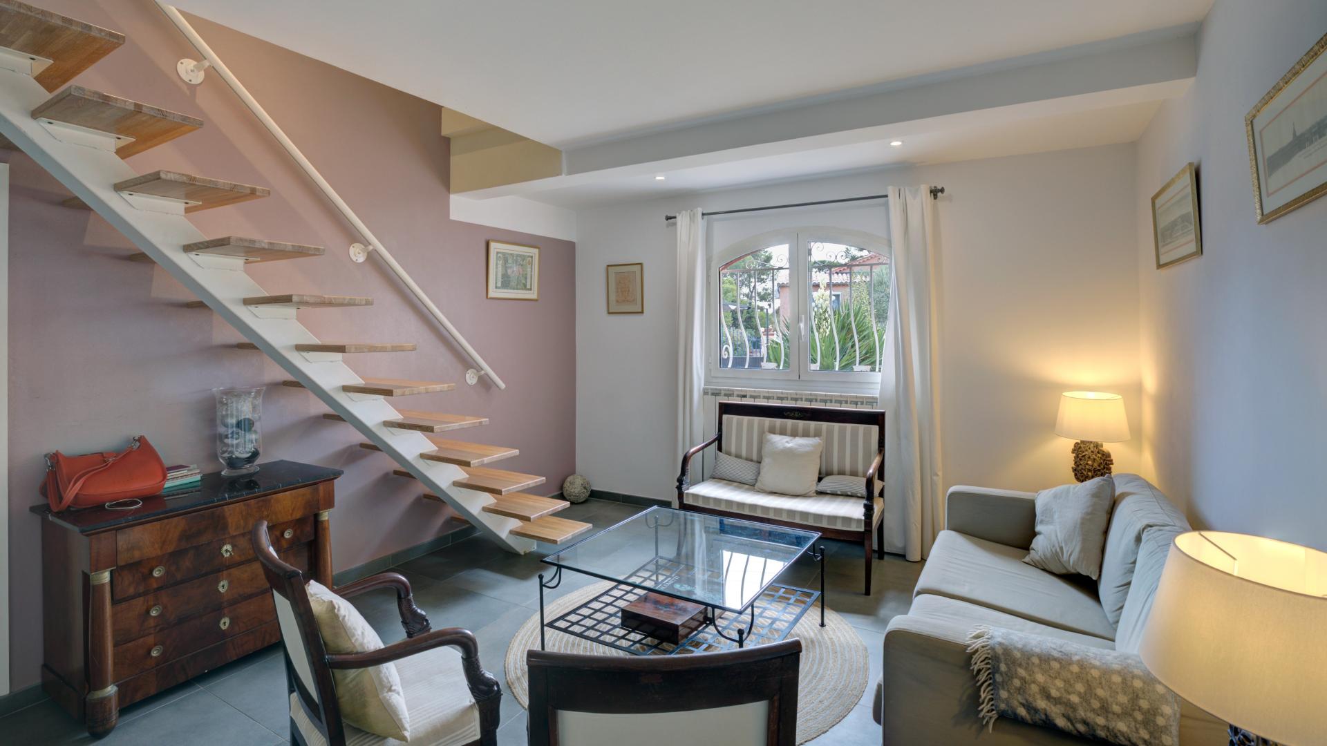 Saint Raphaël, quartier les Plaines, proche des commerces et des plages, belle villa de caractère de 155 m² sur un terrain de 725 m² restaurée avec des prestations modernes. Elle offre un vaste espace séjour, un hall d'entrée, une salle à manger avec cuisine équipée, 4 chambres dont deux de plain-pied, 2 salles de bains, 2 WC, bureau, cellier. Terrasses et solarium avec bel aperçu mer. A découvrir rapidement !