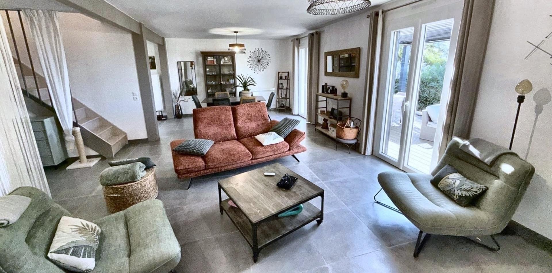 Maison 140 m², 4 chambres dont suite parentale, garage 50 m², terrain 3300 m² avec piscine sécurisée, cuisine d’été, plein sud.