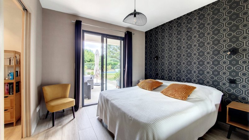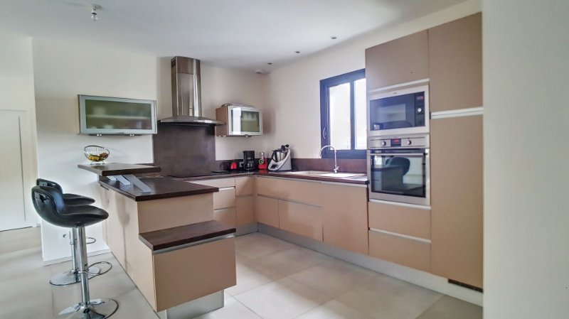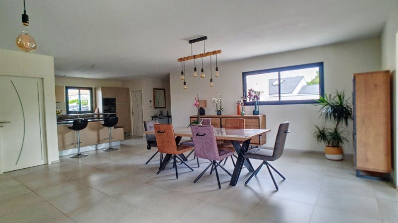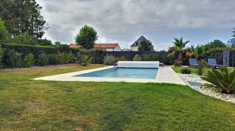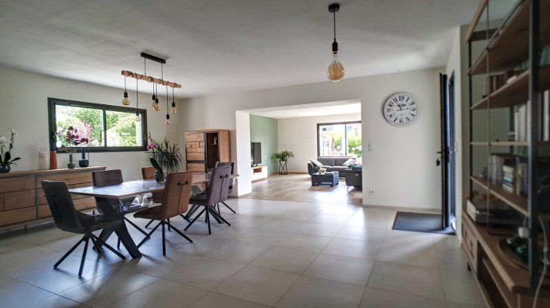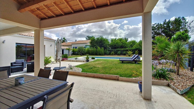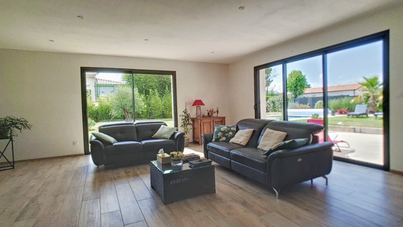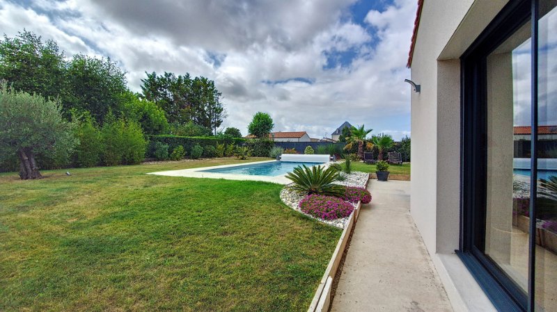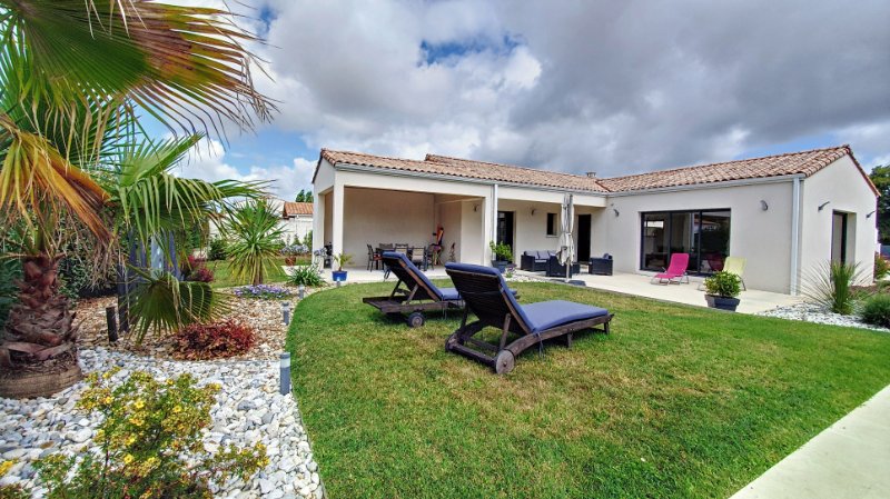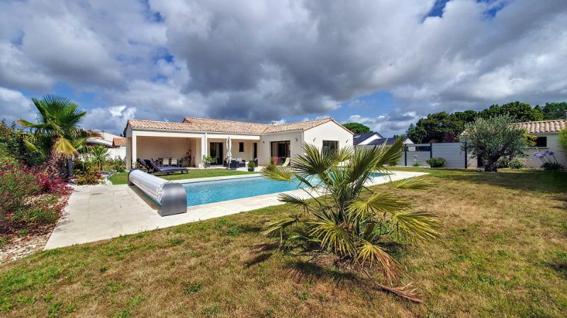 Maison contemporaine de plain-pied de 143m², offrant de belles prestations et des espaces également propice à un aménagement fonctionnel pour une vie familiale harmonieuse sur un joli terrain paysagé clos de murs de 1565 m² au centre ville de Saujon dans un quartier calme tout proche des écoles et commerces. Elle se compose d'une entrée, toilettes indépendantes avec lave-mains, une cuisine aménagée et équipée ouverte sur un vaste séjour/salon ouvrant sur une belle terrasse et auvent, pool house exposée plein sud avec jardin exotique et piscine de 10x4, coté nuit, un large dégagement dressing desservant trois chambres dont une chambre parentale avec salle d'eau et toilettes intégrées, une salle de bains avec douche. Un cellier, buanderie, chaufferie ainsi qu'un garage attenant avec une cave et un atelier. Dépendance d'un deuxième garage avec porte motorisé et local technique piscine, agrémenté d'un jeune parc de 400 m² agréablement complanté de divers arbres. Pour compléter cette belle propriété, portail alu automatisé avec visiophone, pompe à chaleur air eau associées à un plancher chauffant, adoucisseur. Vous n'aurez qu'a poser vos valises et profiter !